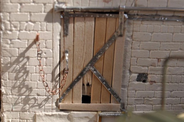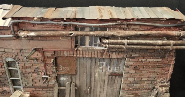 Основа была залита в гипсе, в стене заводского корпуса были проделаны нужные отверстия, подготовлены болванки для дверей и ворот, попутно клепал мешки из пластыря. Дальше все по накатаной, проводка, трубы из метала от тюбиков худ.акрила, окна, собрал цепь на дверь, собрал основу для деревянной пристройки