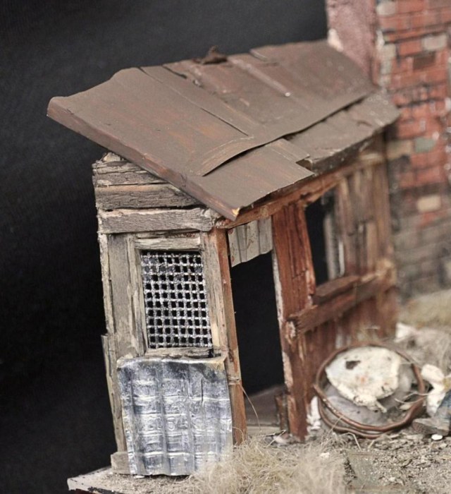 И, если соберётесь "подрихтовать" диораму до пущей реалистичности, то кроме раскиданного взрывом грунта, ещё дырок от осколков разного диаметра в стене проковыряйте! И будет вполне выставочная работа!
