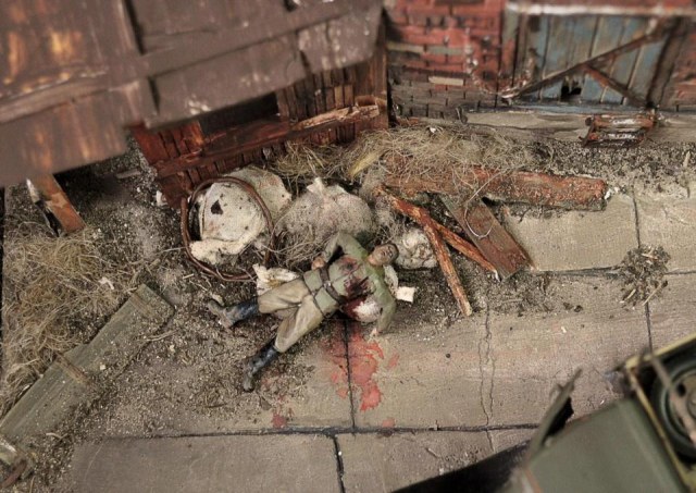 Присоединюсь к мнению коллег: фигура убитого бойца явно портит восприятие всей работы. Подумайте над другим сюжетом диорамы. Сотоварищи подскажут. А строение сделано очень хорошо. Времени и сил потрачено достаточно, и не зря. С уважением! Удачи в творчестве!!!