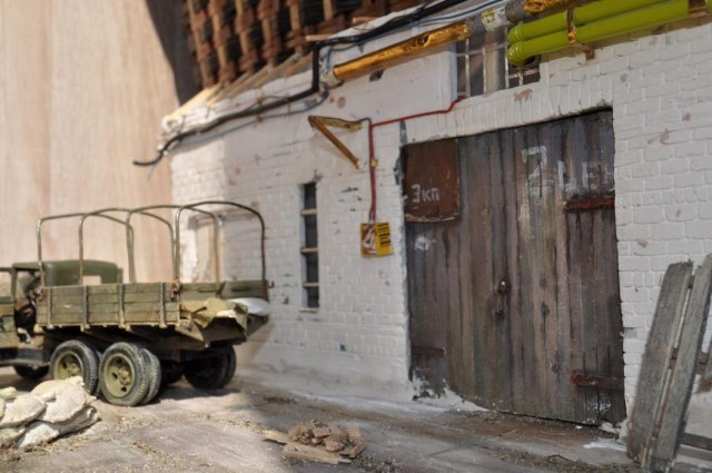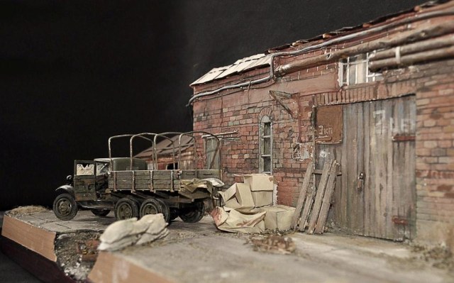 Строения отлично сделаны. Могу предложить вариант для изменения. Подбери фигурки так, возле авто посади раненого бойца, рядом с ним фигуру бойца делающего ему перевязку. Приоткрой дверь склада и рядрм поставь фигуру бойца или две которые с опаской хотят войти на склад.