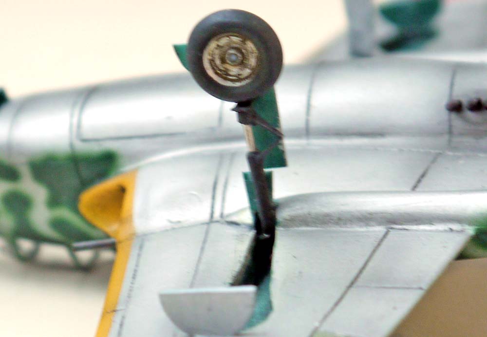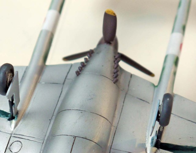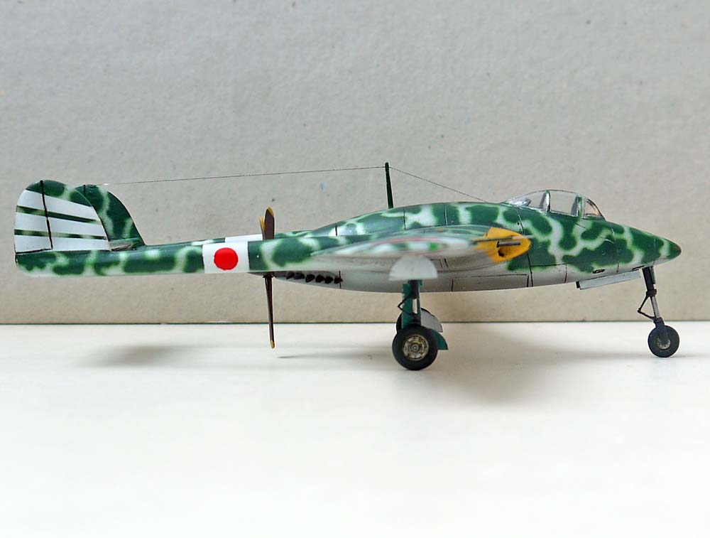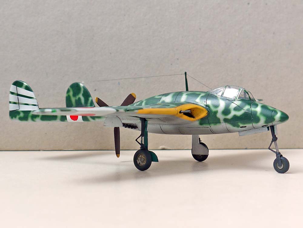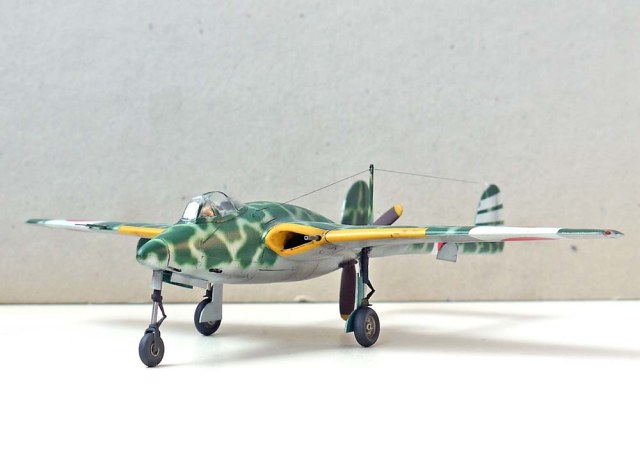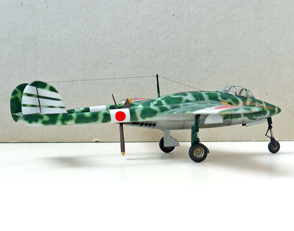 Остальное доделывал уже я. Изменил форму носа, килей, и ниш шасси, поставил вакушный фонарь Ки-43 от AML, кок винта от какого-то итальянца (уже не помню от какого), лопасти вообще безымянные (причем укороченные), колеса- Хенкель 162 от Драгона, стойки шасси сделаны с нуля из иголок различного диаметра, "ушных палочек" и пластика от Доширака. Выхлопные патрубки из припоя.