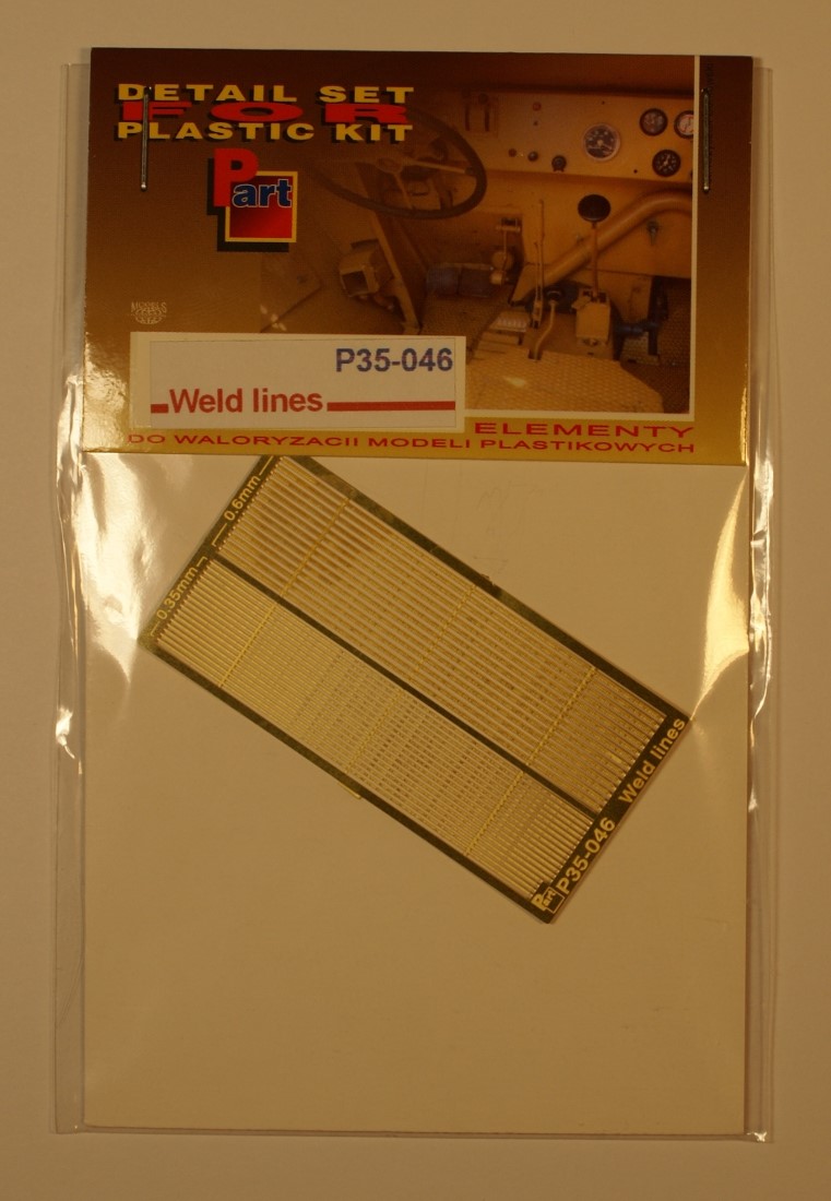 Итак, в наборе 14 полосок длиной 55 мм для имитации швов шириной 0,6 мм (они, пожалуй, больше подойдут для 35-го масштаба), и 17 полосок для швов шириной 0,35 мм (для 72-го масштаба). Широкие швы выглядят весьма похоже, рельеф тонких швов сложно различить невооруженным глазом, возможно лучше проявится на модели после грунта и смывки. Очевидно, что такие травленые швы предназначены для ровных поверхностей, если же придется их гнуть, то травление желательно отжечь.