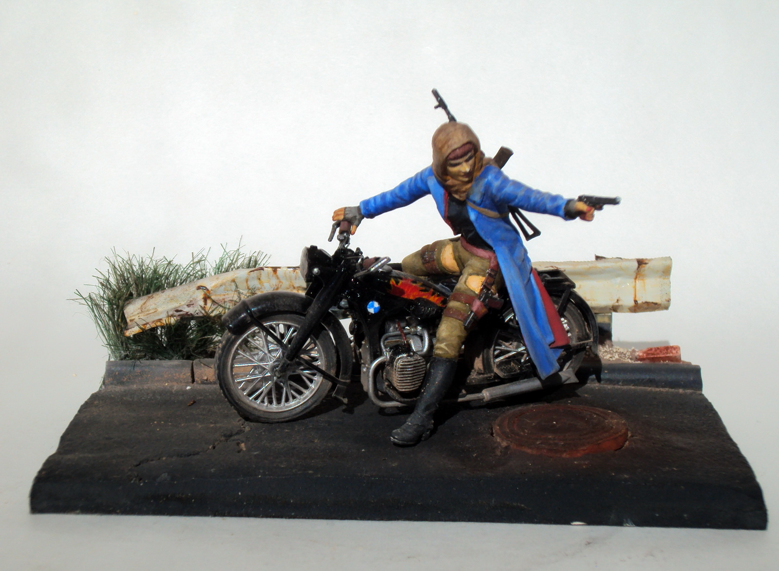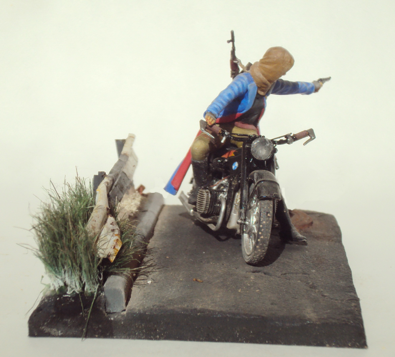 Фигурка от MasterBox. Мотоцикл Звезда (доделывал все троссики и проводку из проволочек и тянутого литника). Основание, ремешки, кабура - полная самоделка. Для основания использовал акриловую пасту "Таир", жестянку от тортика, люк самоделка из запекаемой глины, трава из сантехнического льна. При покраске использованы краски: Темпера от "Мастер Класс"на фигурке, Tamiya, MrHobby для мотоцикла и основания с ограждением. Пигменты Wilder. В общем всё что было под рукой, и что на мой взгляд подходило под конкретную задачу;