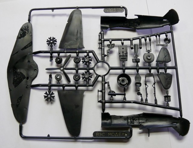 Качество деталировки приятно радует. Очень тонкие задние кромки, хорошо проработанная фактура поверхности. Имеется даже имитация рояльной петли на закрылках и микроклепка «А,ля Валентин Мучичко». Все душевно и смотрибельно. На колесах протектор, на стенках кабины – какой-никакой но похожий интерьер. Изящные двузвенники на стойках шасси, клепка на створках, жаровые щитки на выхлопухах – отдельные детали. Лопасти винта тонкие и сносной геометрии, «двойная звезда» двигателя из 4х деталей + имитация жалюзи. Кок винта – правильной оживальной формы, а не напоминает «шлем Ильи Муромца» как у некоторых нынешних производителей «Лавочки». Разумеется абсолютно все детали требуют зачистки на стыках прессформ, но это обычное дело. Утяжин не замечено. Два «пенька» от толкателей которые нетрудно сточить на внутренней стороне половинок крыла. Мое субъективное мнение –деталировка и литье не хуже моделей от «Ревелл», но и не «Тамия», конечно. «Лавочкина» определенно захотелось собрать! "Звездовская" модель Ла-5ФН отдыхает и нервно курит в уголке!