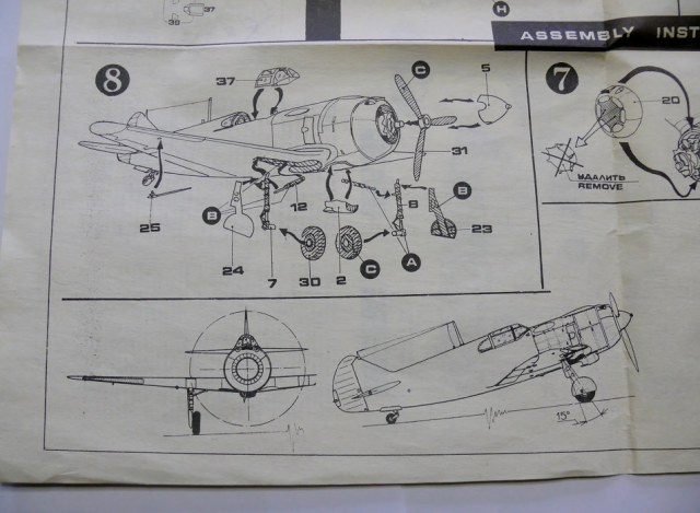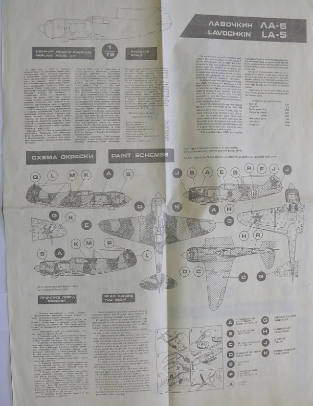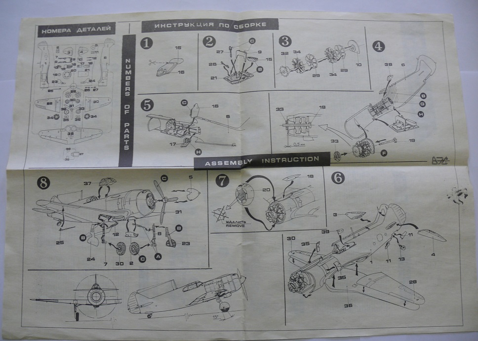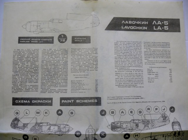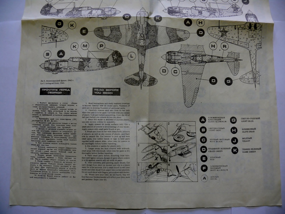 Инструкция – газетная бумага, газетный формат. Содержится историческая справка (цитата из известной книги трилогии о Советских истребителях), внятная схема окраски, «Фроговский» комикс о методах сборки. А еще… (наверное это тоже продиктовано выходом на мировой рынок), пожалуй это одна из первых отечественных моделей на которой появились всем привычные ныне «Ахтунинги», «Ворнинги» и прочие пугалки страшилки: Не есть! Не пить! Не вдыхать! Осторожно остро! Детям не давать! Немедленно к врачу, мы все умрем!…