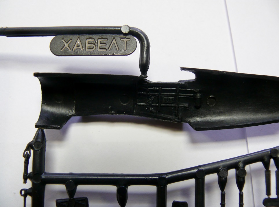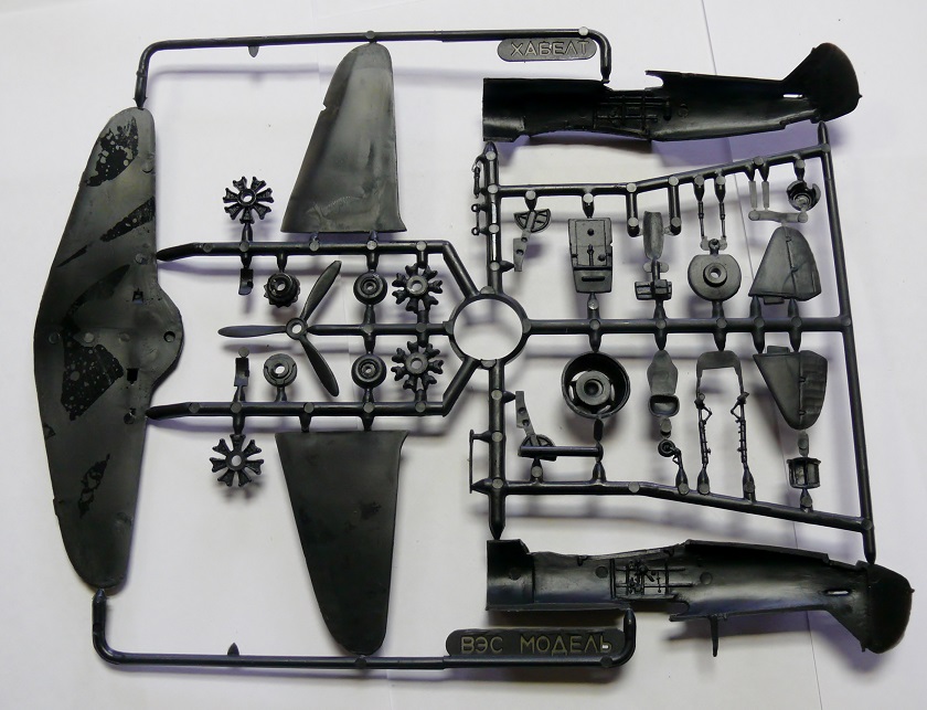 В коробке – одна литьевая рамка черного, весьма твердого пластика. Мне такой нравится. Он хорошо скоблится и режится. Сверлить его тоже приятно. В обработке напоминает виниловую пластинку. Единственный придеризм – черный цвет конечно не фонтан. Серенький как то предпочтительнее. На литниках два шикарных шильдика. На одном гордо красуется "ВЭС МОДЕЛЬ", а на другом - таинственное для меня слово "ХАБЕЛТ". (Может быть это фамилия спонсора? Знаменитый американский правозащитник Доктор Хабелт, известный тем, что сжег себя в костре из долларовых купюр... Шутка. :)))