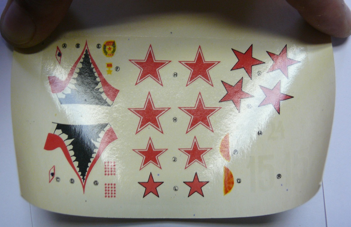Декаль… Охохо-хохонюшки… Декаль самое слабое звено. От долгого хранения в запасниках, лист декали наводит на мысль о телерекламе – «Надоело, что рулон закончился, а втулка осталась? Акватьюб!!! Выбрось втулку в унитаз!!!». При разворачивании «втулки» слышится шорох трескающегося лака… сыплется пыль… Думаю нынче даже не стоит пытаться перевести эту декаль. Сама по себе задумка хорошая, графика отличная, пасть страшная и смещения цветов нет. Но вот слой типографской краски очень тонкий, декаль полупрозрачная. Фотки модели собранной неким безымянным Юным Техником подтверждают все мысли на счет декали.