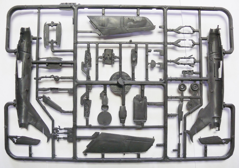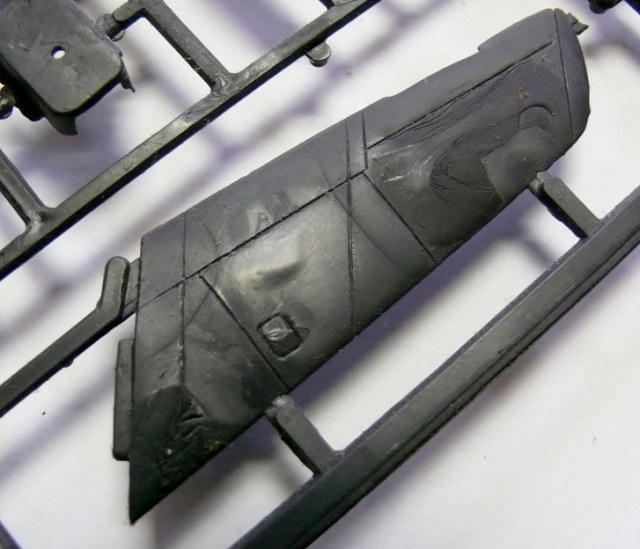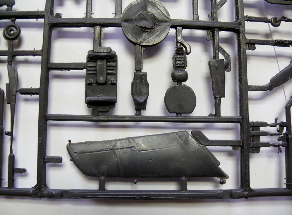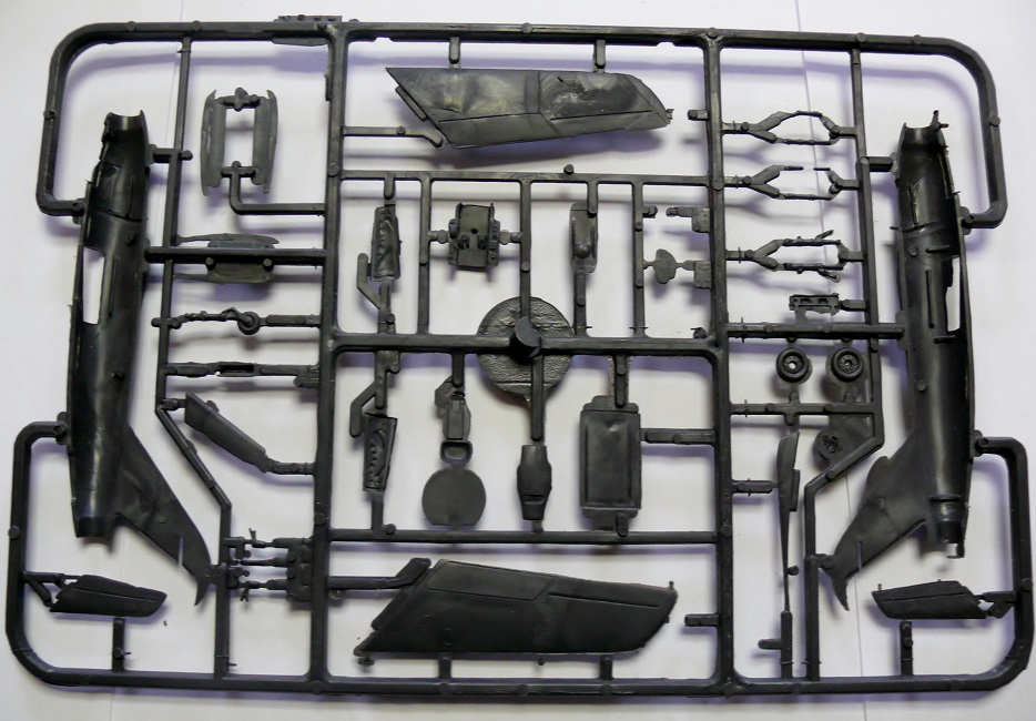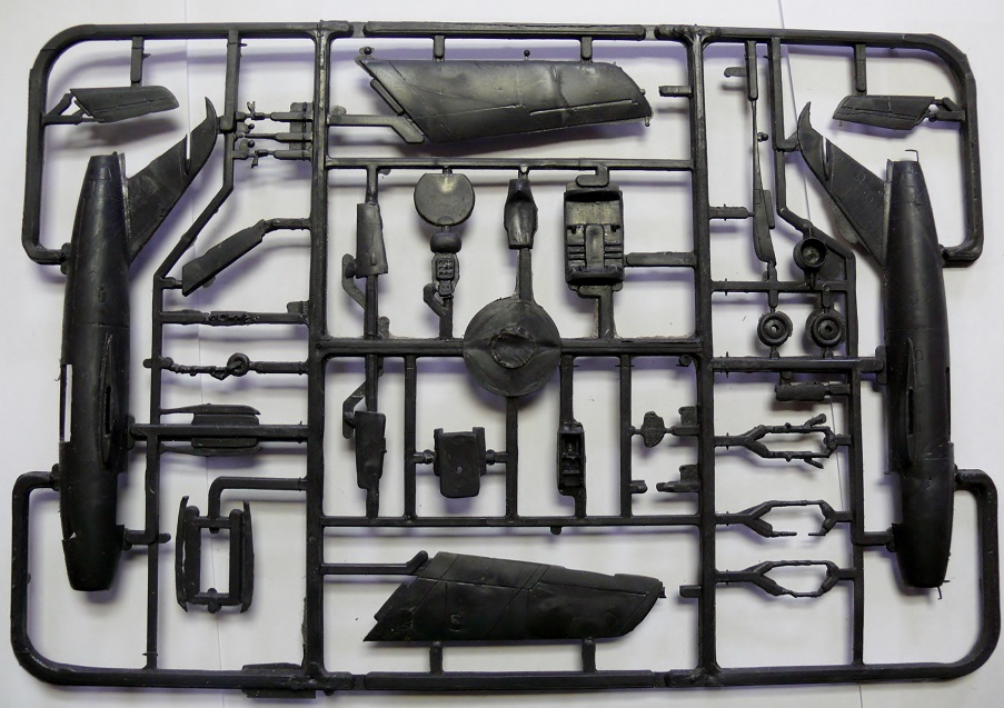 НО… В отличие от Ла-5 этот набор постигла горькая судьба. Если литье Ла-5 обильно смазанное неким маслом хранилось долгие годы в герметично упакованном пакете который я вскрыл лишь позавчера и отмыл пластик… То детали Ла-15 в коробке лежали во вскрытом пакете… Смотрите, что произошло за 25 лет хранения при взаимодействии смазки с кислородом воздуха… Горькое, печальное зрелище. Твердый черный пластик покрылся морщинами и разъеден… Увы, неплохая модель безнадежно испорчена. Отсюда мораль – Отмывайте литники как только модель попала к вам в руки!
