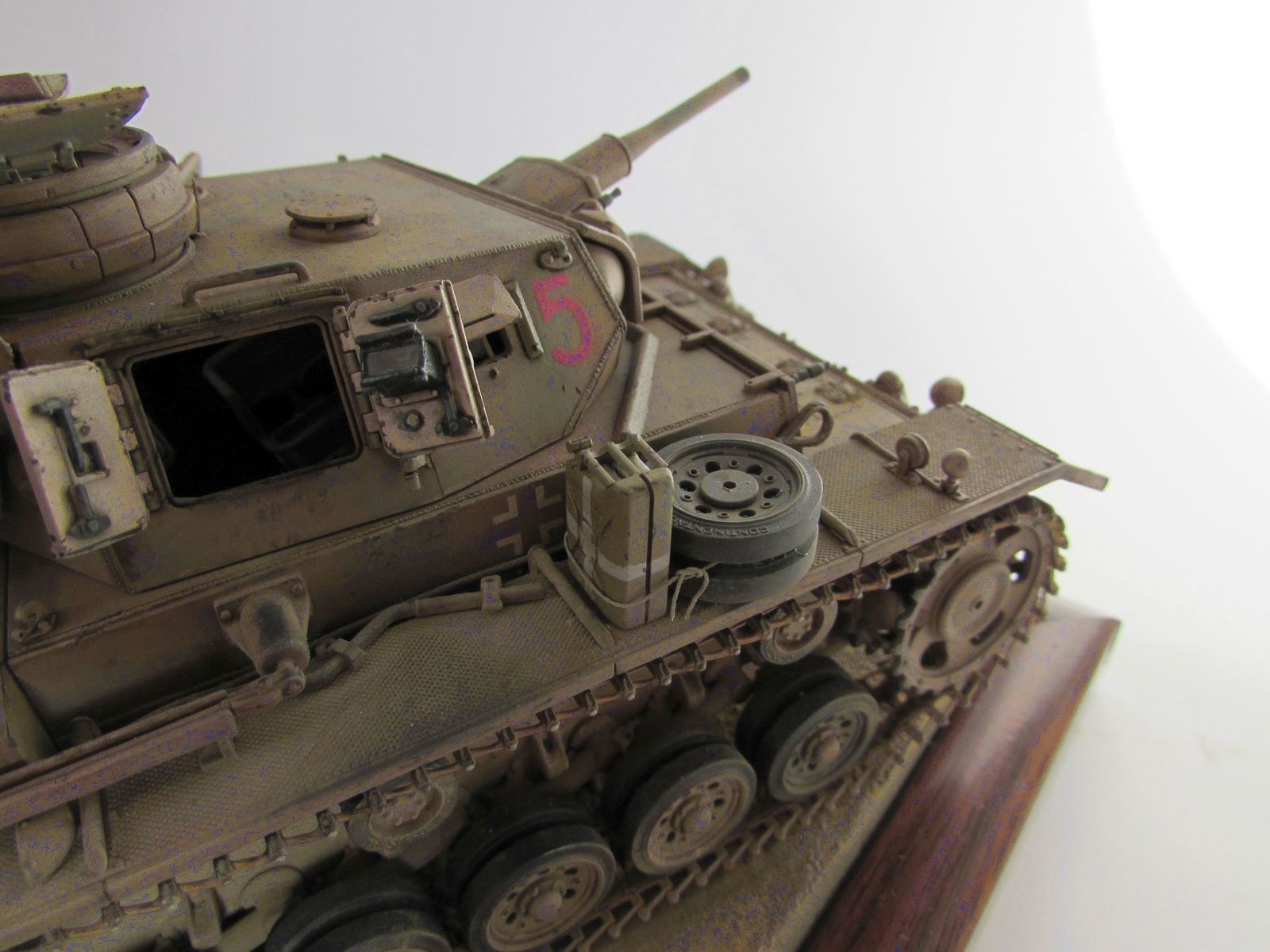 По задумке, запасные катки танку достались выкрешенные в панцергрей, что отображено на модели.