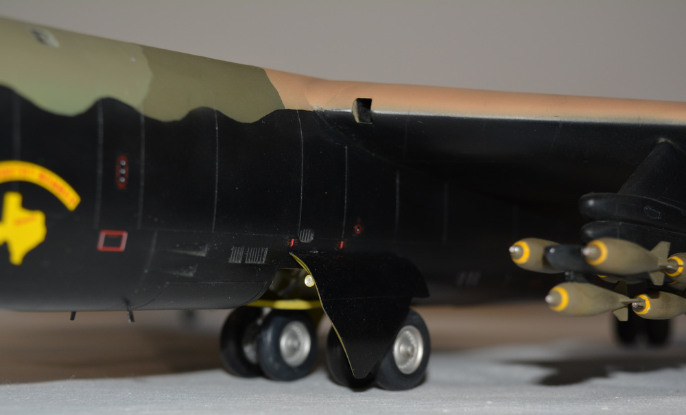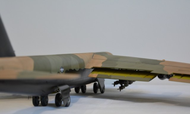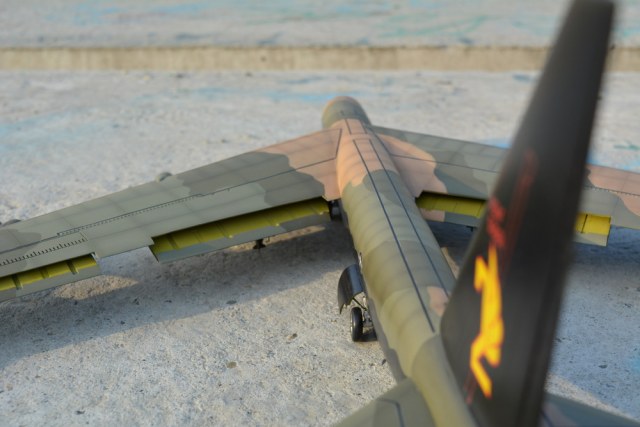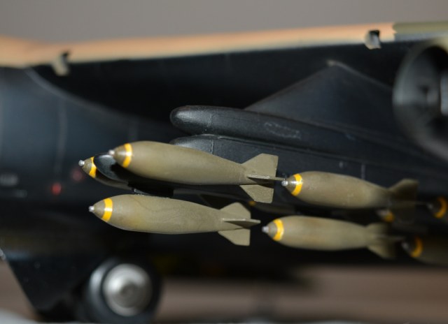 Коротко о модели. Пластик на уровне наборов 80-х годов. Плохая стыкуемость крыла к фюзеляжу, бомбы в сечении овальные. Производитель предлагает экспонировать модель в подвешенном положении - на верхней поверхности крыла пластмассовые скобы.
