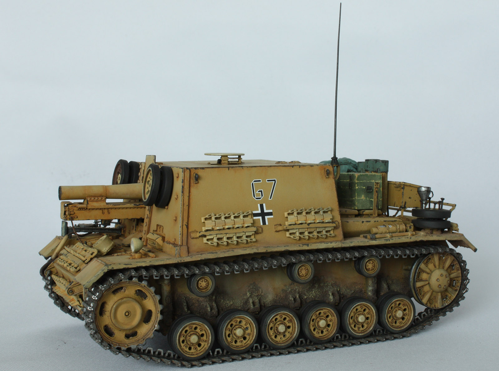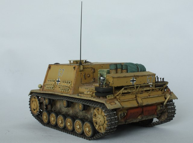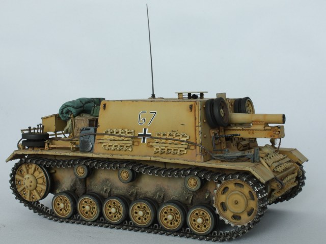 Впрочем, нагружать читателя общеизвестными фактами о недолгой истории разработки и службы данных машин я не стану. Скажу лишь, что разработка штурмового орудия на шасси Pz.III с орудием калибра 15 см началась ещё в 1941 году, и шла, по моим ощущениям, без особого энтузиазма: в вермахте в достатке были штурмовые орудия типа StuG.III. Однако, опыт боёв на восточном фронте показал, что 75-мм орудие не в должной степени эффективно в городских боях. Работы резко ускорились, и уже к октябрю 1942 года завод «Alkett» выпустил аж 24 машины такого типа, вооружённых в общем-то морально устаревшим, если рассматривать его именно как полевое, пехотным орудием 15 cm schweres Infanterie Geschütz 33, размещённым в довольно просторной рубке. Правильнее сказать, что строились данные штурмовые орудия на шасси StuG.III(а не Pz.III) попавшейся под руки производственной серии путём установки массивной рубки из 30-мм бортовых бронелистов,корма – 21 мм), а лоб - 50-мм с прикрученной 30-мм бронеплитой. Крышу делали из обрезков 12 мм бронеплит, оставшихся от производства чего-то более серийного. Характерной особенностью был тот факт, что маски орудия было не предусмотрено как таковой (да и само орудие претерпело изменений чуть больше, чем нисколько), её функцию выполнял тонкий бронелист, двигающийся в пазах сверху над орудием и бронещиток снизу. К чести разработчиков, машина получила… да, наконец-то, курсовой пулемёт в шаровой установке, и была оборудована просторными ящиками для имущества на корме. Но самое главное конечно – это орудие, способное послать порядка 7,8 кг аммотола на 4,7 км, что намного эффективней того, что предлагало штурмовое орудие или танки того периода с 7,5 см орудием. Пехотное орудие, ставшее основным вооружением танка, давно показало себя эффективным средством борьбы с сильно укреплёнными огневыми точками противника, и использование его в самоходном варианте виделось более чем привлекательным.