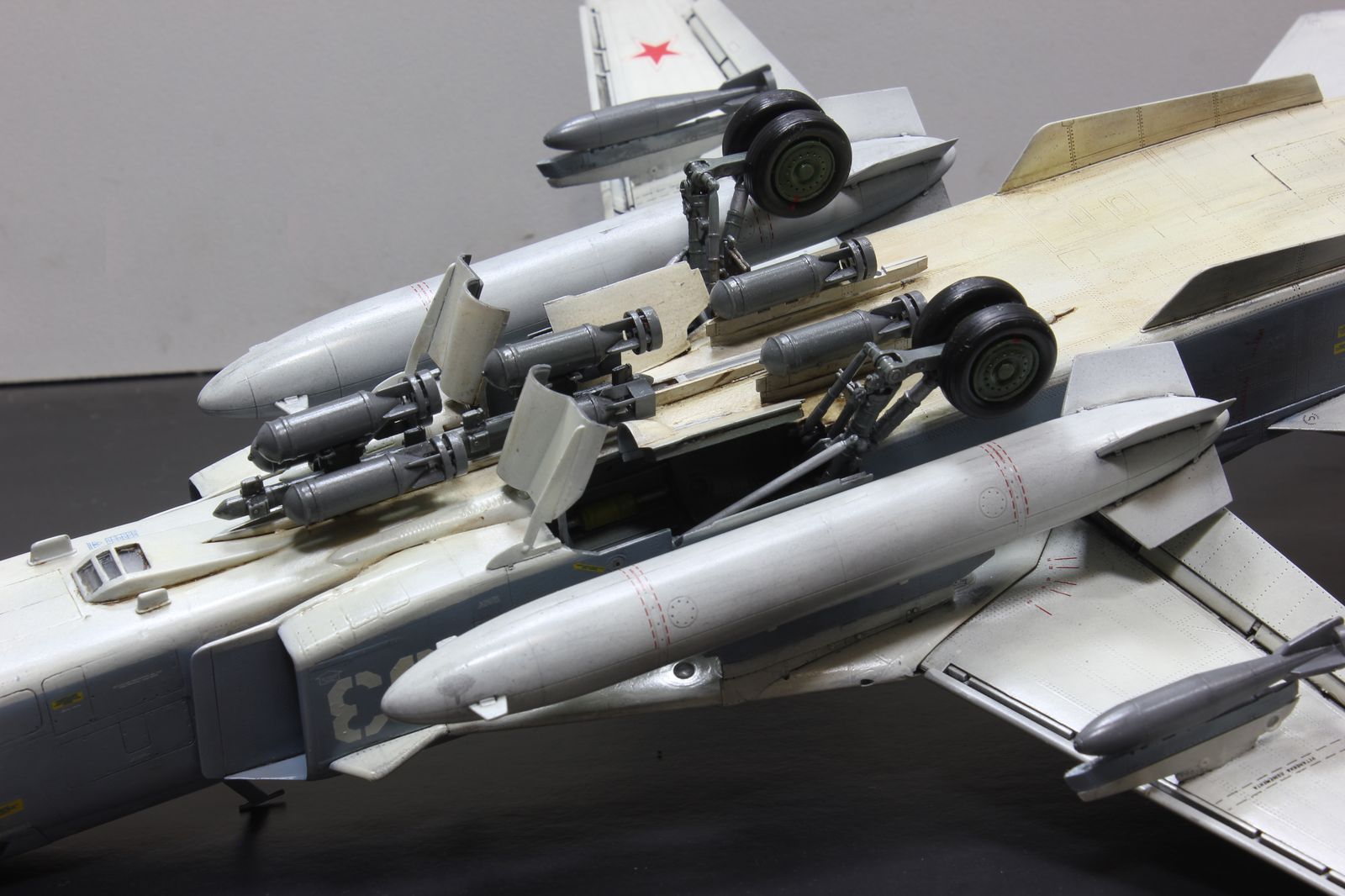 Коллеги, спасибо за оценки и комментарии! ) Так получилось, что белая краска от МрХобби не очень хорошо легла на низ, верх гораздо лучше. Может, фото и не передаёт глубину расшивки, но это так. Смывка применялась как по верху, так и по низу. Просто решил не сильно выделять саму расшивку и заклёпки, как это многие любят. Я очень тщательно изучал фото реальных бортов в Сирии. Да, согласен, где-то кажется неубедительно )) Но я старался приблизить машину к реализму. Вначале она ушла в долгострой, но после гибели борта в Сирии, я решил закончить и посвятить ее героическому экипажу.