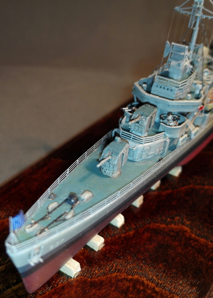 Вообще,сборка обещала быть легкой и быстрой и только с использованием фототравления от фирмы GMM для американских эсминцев., так же точеными стволами и смоляными АУ. Но когда я начал собирать надстройки и корпус то возникло необъяснимое чувство...зуд во всем теле и,особенно,в руках..Я внимательно посмотрел на модель и внезапно проскочила искра,безумие и я решился пилить так,как только смогу. По итогам этого решения докупил еще зенитные автоматы и начал переделывать и дорабатывать то,что было слишком грубым и немасштабным.Были снесены все ограждения,толщина которых приближалась к толщине бортовой брони крейсера, и заменены на пропитанную суперклеем бумагу или доширакпласт,сделал ограждения винтов из проволоки (изначально хотел взять фототравленные,но оказался слишком рукозадым и все никак не мог согнуть их нормально). Дальше решил доработать фальшборт. Но тут успех 50/50 - с одной стороны он получился гораздо лучше исходного,но с другой не получилось сделать максимально похожим на оригинал и накосячил с числом стоек. Следом мой взор упал на трубы,которые выглядели неприлично голыми и тут понеслось...расточил козырек,между козырьком и телом трубы вставил тонкую пластинку,в которой просверлил два отверстия,в которые выходили трубы из котельных отделений,сделал из проволки "гриль" на трубе, доработал площадку на головной трубе,сымитировал антенны и прочие устройства на трубах. После труб я немного утихомирился,но лишь на время,ибо еще есть мачта,которую было проще и правильнее сделать с нуля)