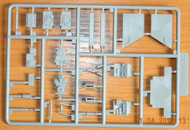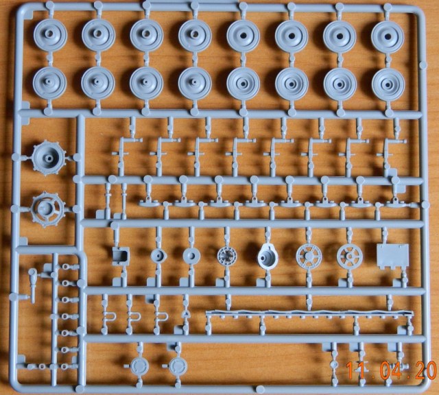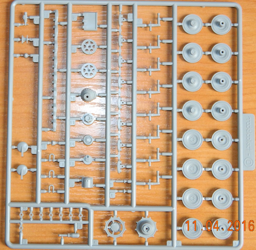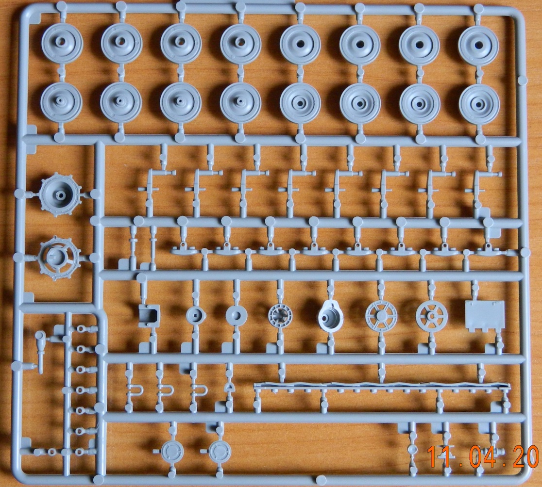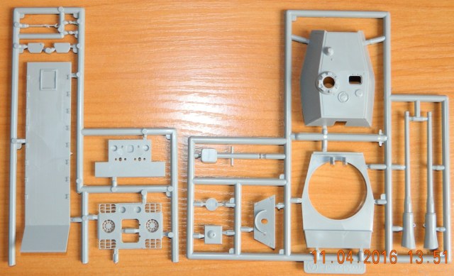 Внутри шесть литников серого цвета, пакетик с пружинами для ходовой, пакетик с фототравлением для ПНВ и сетками моторного отсека, имитации дульного тормоза, а так же разнообразными скобами плюс металлический ствол. Декаль новшеством для данной модели не блеснула, всё как и в предыдущих танках серии «Е» этого производителя.
