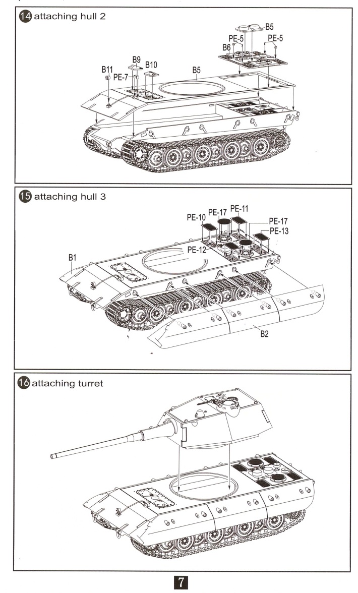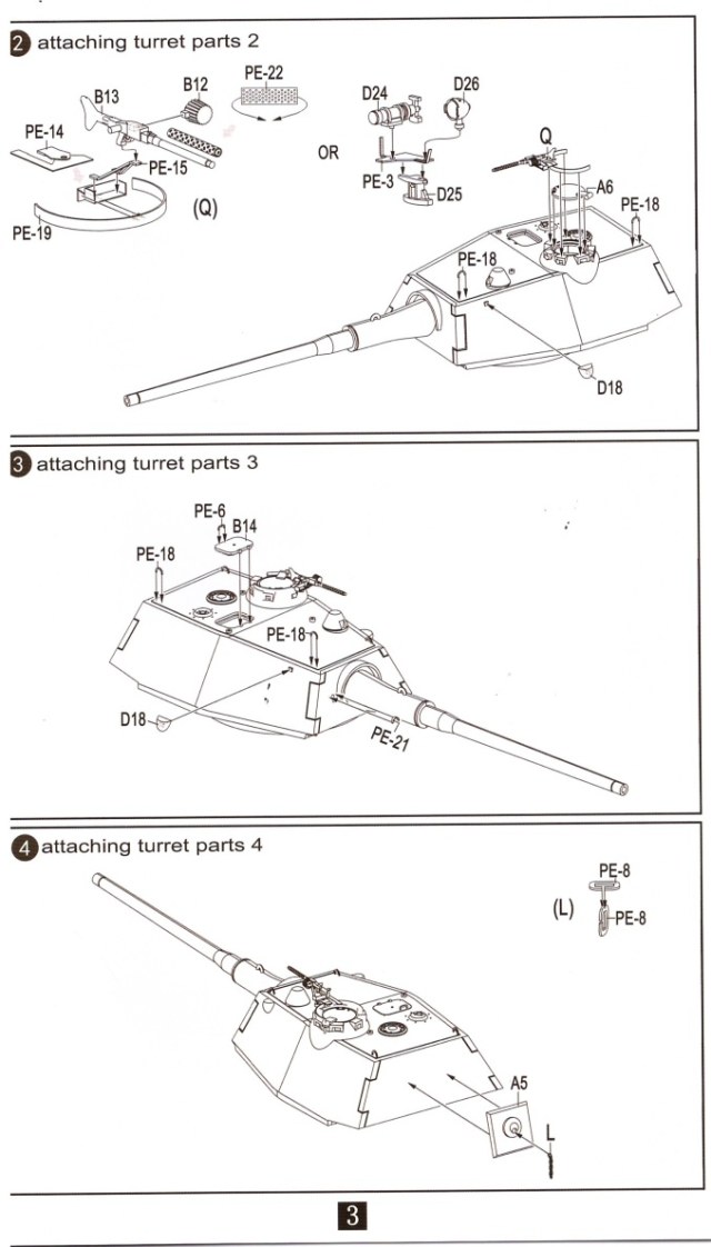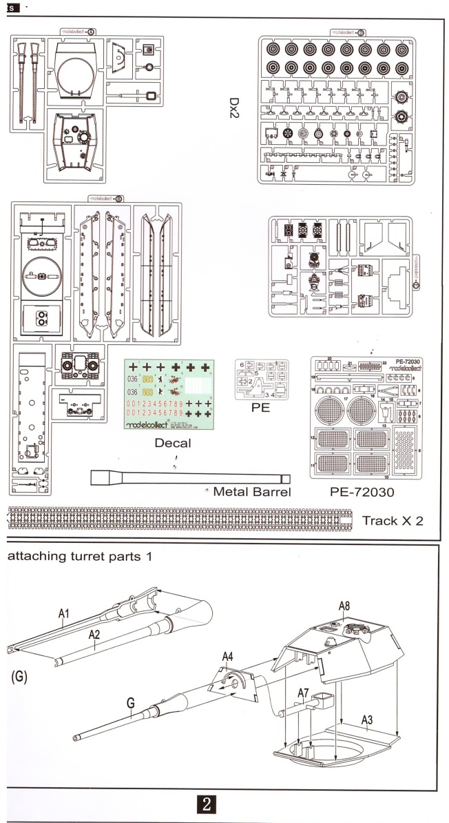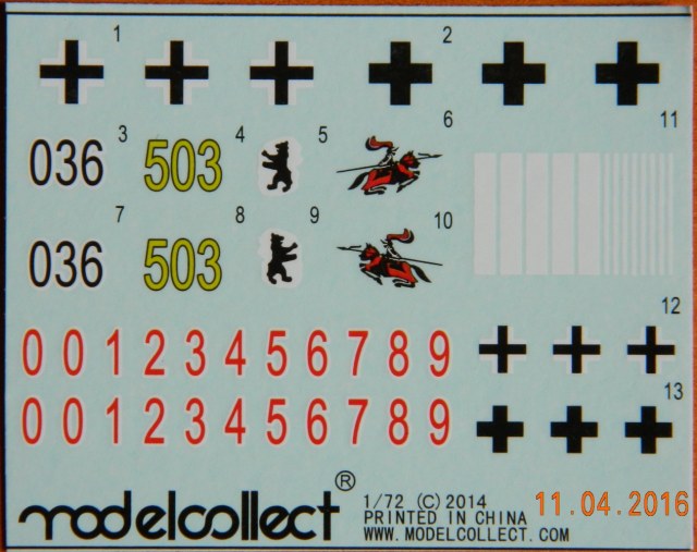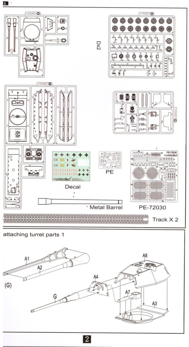 Внутри шесть литников серого цвета, пакетик с пружинами для ходовой, пакетик с фототравлением для ПНВ и сетками моторного отсека, имитации дульного тормоза, а так же разнообразными скобами плюс металлический ствол. Декаль новшеством для данной модели не блеснула, всё как и в предыдущих танках серии «Е» этого производителя.