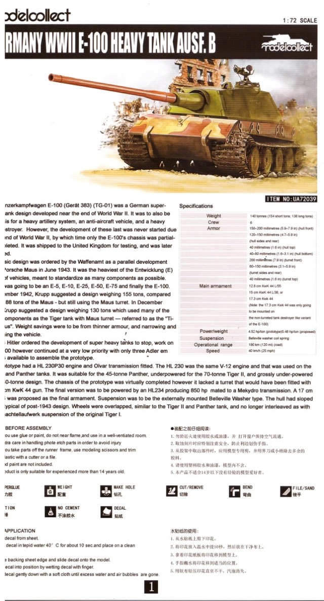 Предлагаю Вашему вниманию модель «бумажного» танка Е-100 Ausf.B. Модель упакована в коробку привычного уже качества с нормальной типографией от производителя Modelcollect.