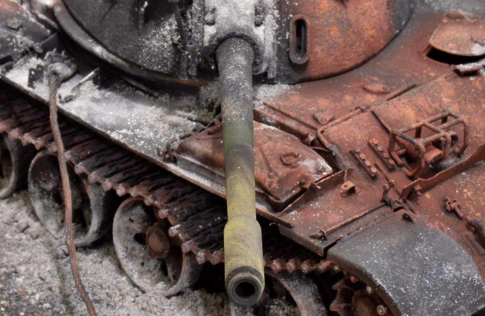 тоже не танкист,и тоже не смог пройти мимо - обалденно переданы все мелочи сгоревшей машины(пепел,ржавчина,копоть и остальное),единственное - немного смутил конец троса висящий в воздухе,трос не пруток,сила притяжения возьмет своё.тоже утащу работу в избранное