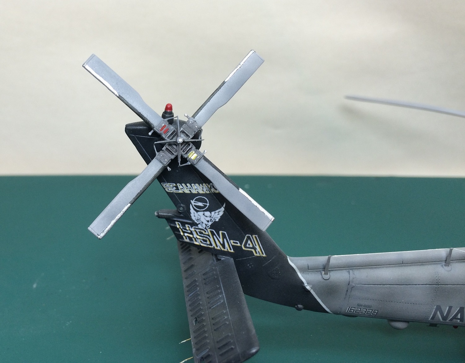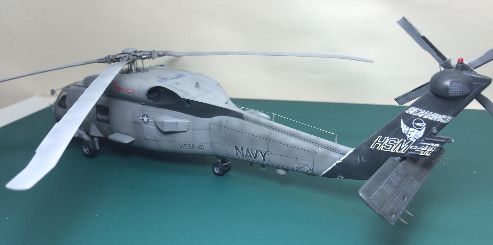 Сам набор удивил своим плохим качеством литья и сходимостью. Сборка проходила достаточно сложно, половинки корпуса не хотели сходится нормально, пришлось править как руками, так и строительным феном. На фюзеляже пришлось зачищать очень много стыков от пресс-форм( собирал ранее НН-60Н от Хоббибосса, такого не было), соответственно потом восстанавливал клепку и расшивку. В работе использовал травление от Эдуарда. Попытался доработать винты, колеса так же сточил до приемлемого вида. Добавил антенну. Ракету Магнитометр полностью переделал из старого Хеллфайера, т.к. в наборе отлита вместе с пилоном.