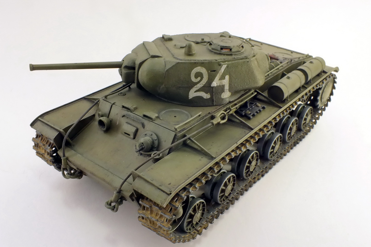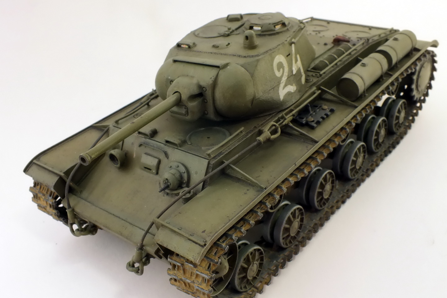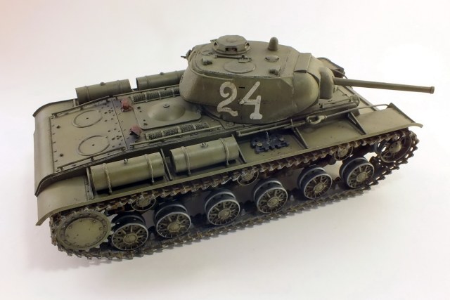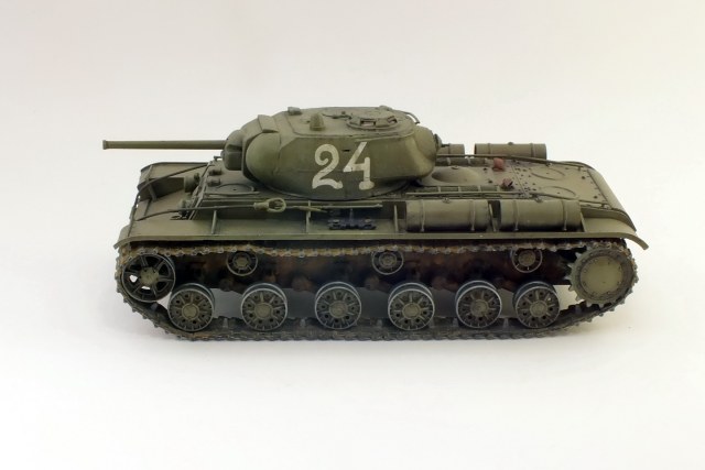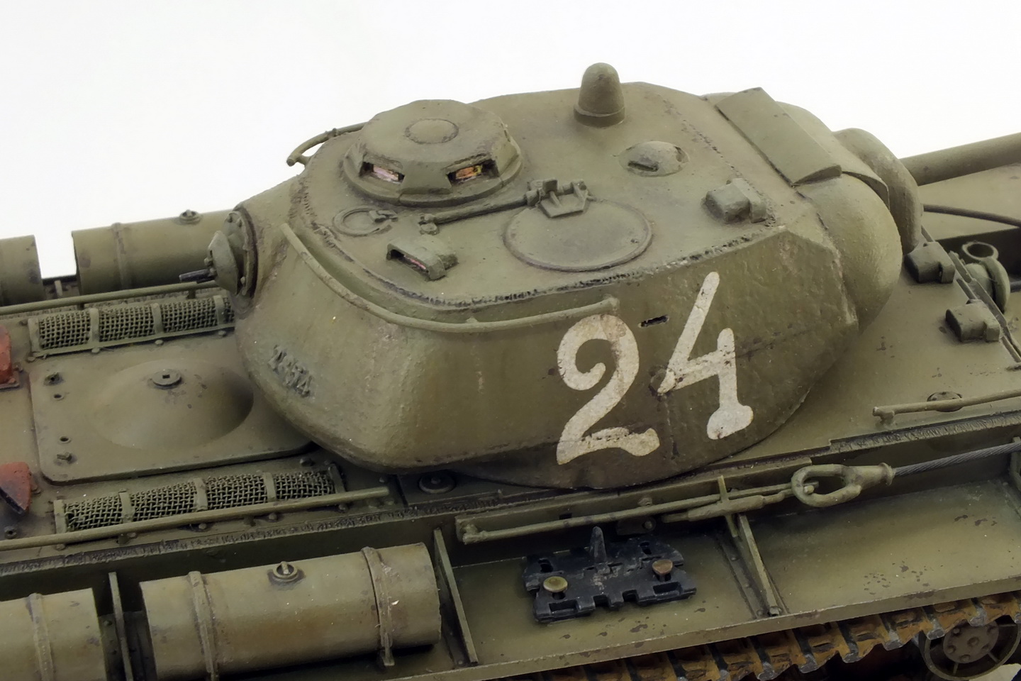 Сборка с минимумом доработок.Траки наборные "ВЭ".Тросы заменил на металлические.Пулемёты-иглы.Решётки МТО самодельные.Фару заменить было нечем, сделал разбитой, без отражателя.Крепления запасных траков получились не очень.В матчасть не углублялся.