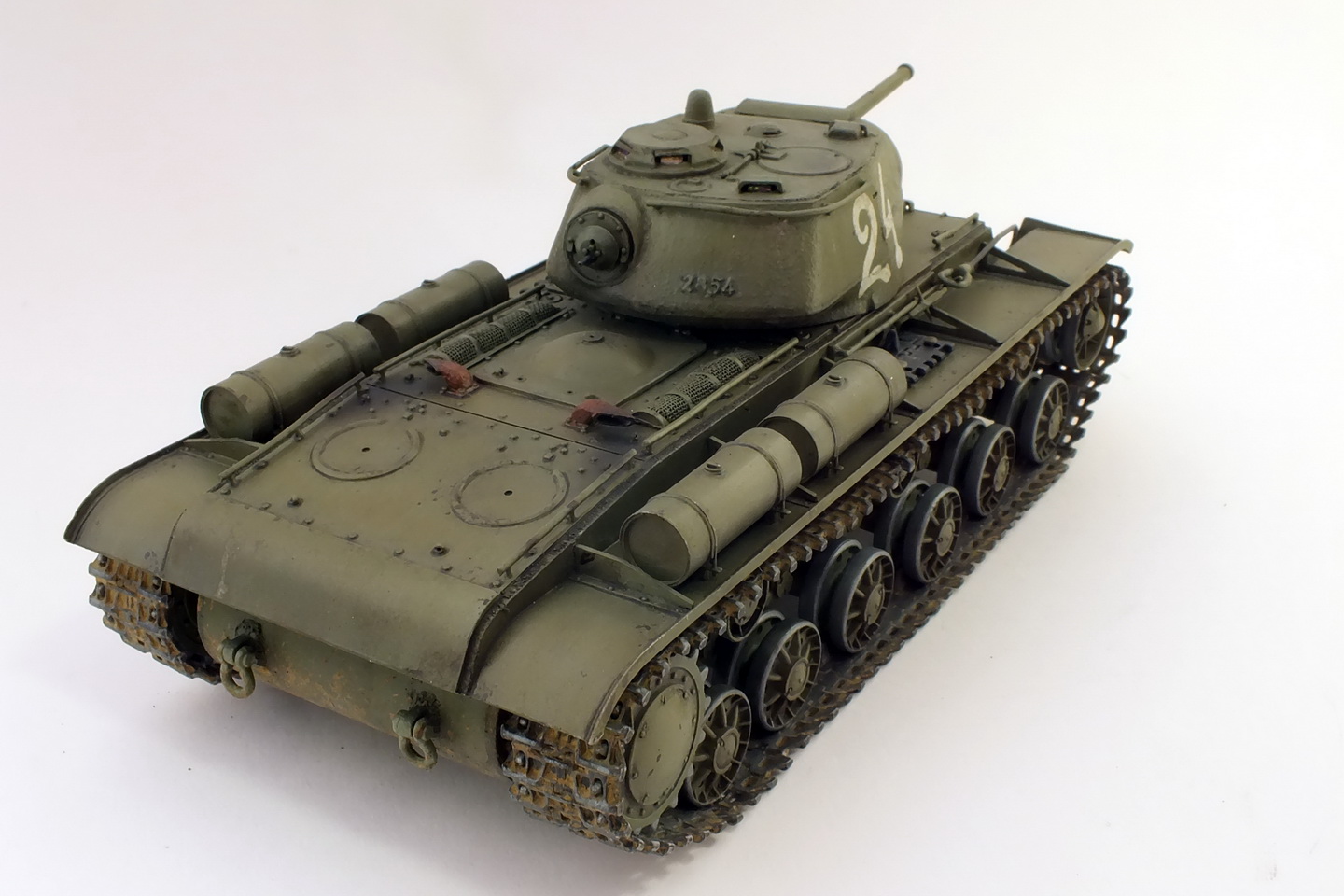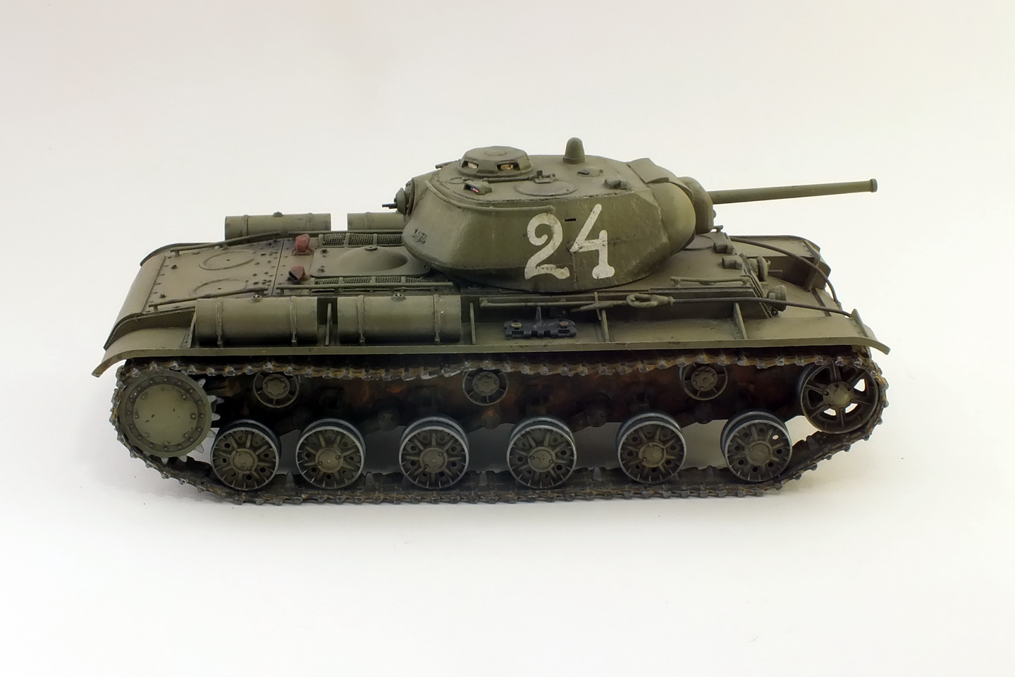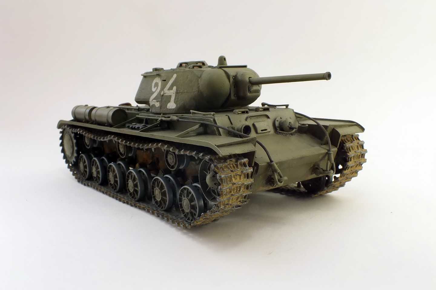 Сборка с минимумом доработок.Траки наборные "ВЭ".Тросы заменил на металлические.Пулемёты-иглы.Решётки МТО самодельные.Фару заменить было нечем, сделал разбитой, без отражателя.Крепления запасных траков получились не очень.В матчасть не углублялся.