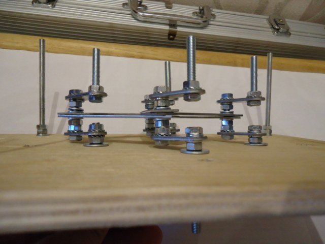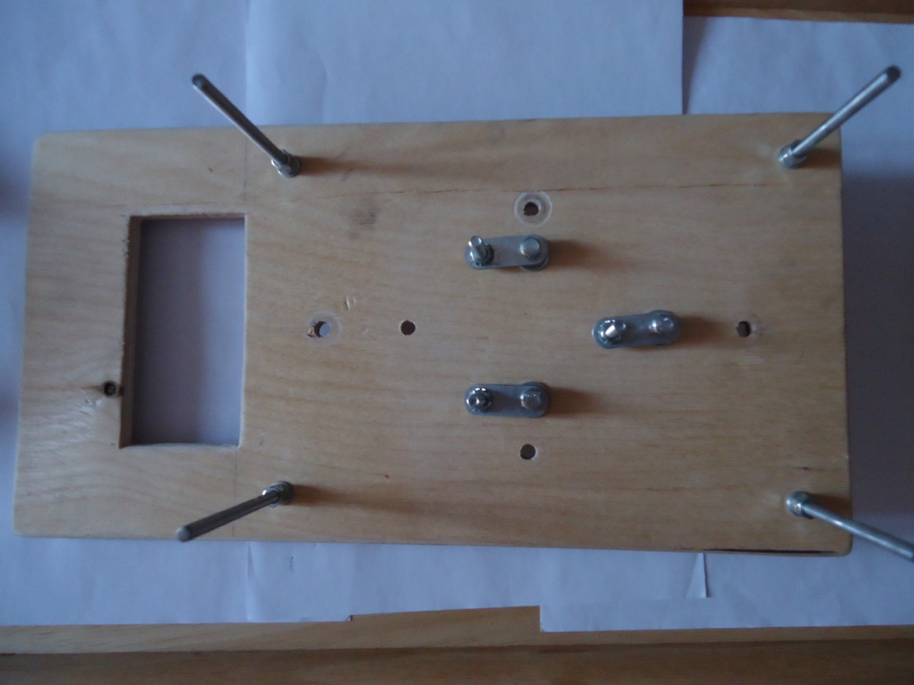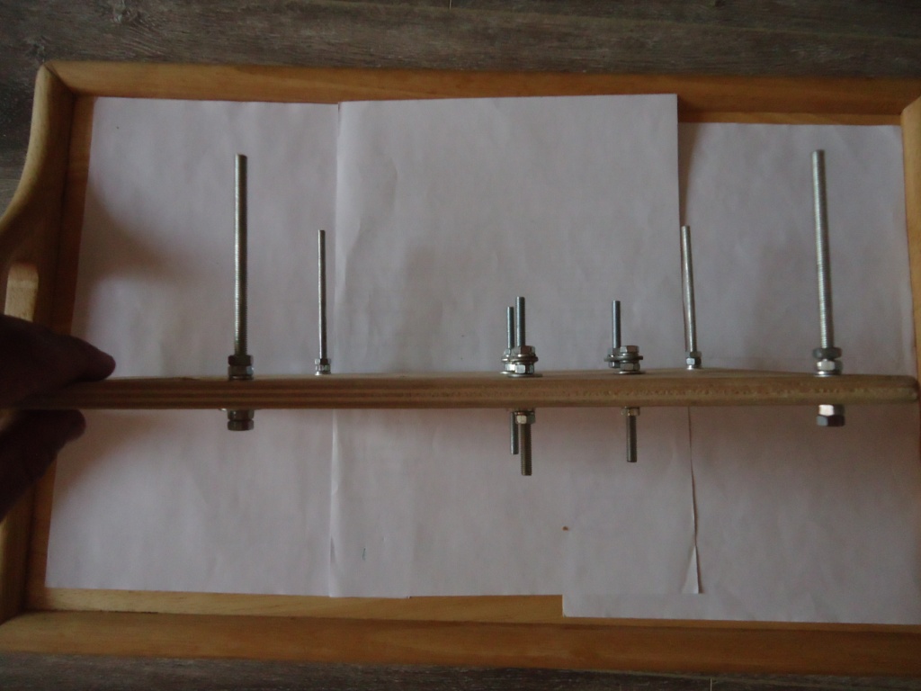 Крайние по углам шпилки чтобы держать вторую фанеру в центре сам механизм растояние между ними 6 см (первоночально делал 10 см но не очень получилось). Соединил все 4 пластинками они и определили размер 6см. Центральная необходима иначе не будет жесткости. Самая длина шпилька служит для вращения остальных я приспособил под шуруповерт. Контргайки обязательны. Можно такой вариант сделать можно и катушку поставить я решил по другому потом сделать высверлил в болте отверстие на 1.5 мм и сделал крючок из финишного гвоздя и припаял получилось вот так. Вообщем как так купил все в леруа мерлен кроме фанеры (было) обошлось примерно руб на 150-200.