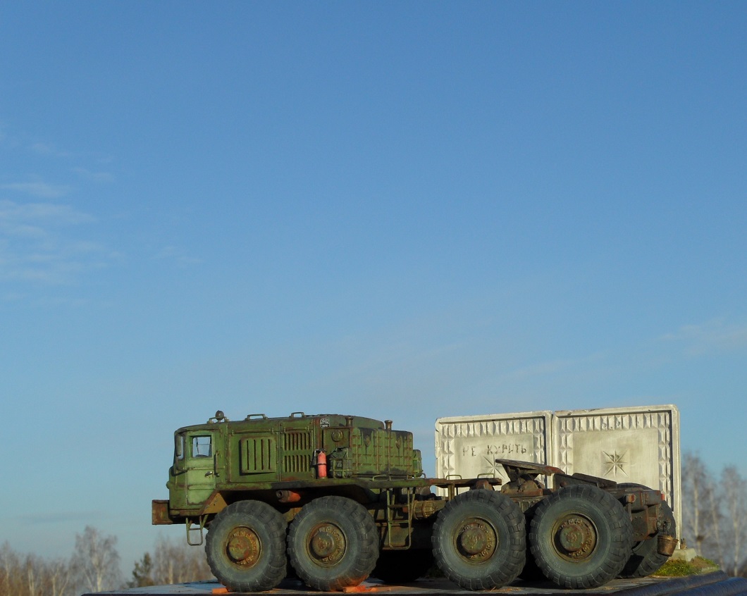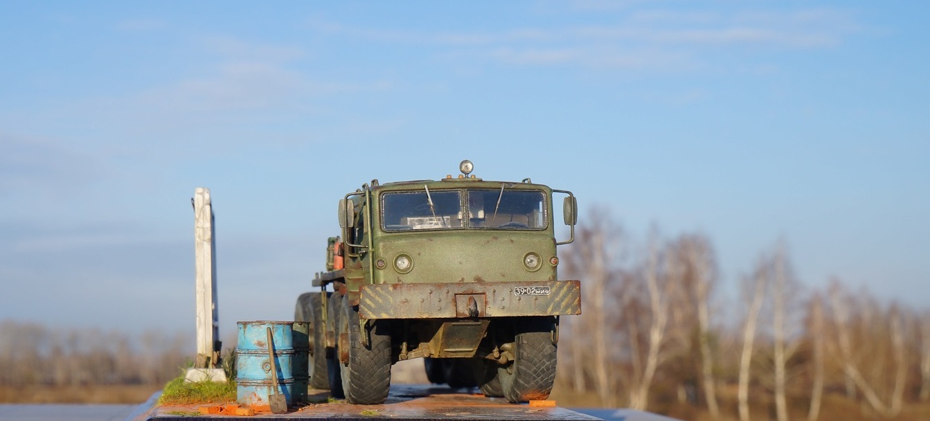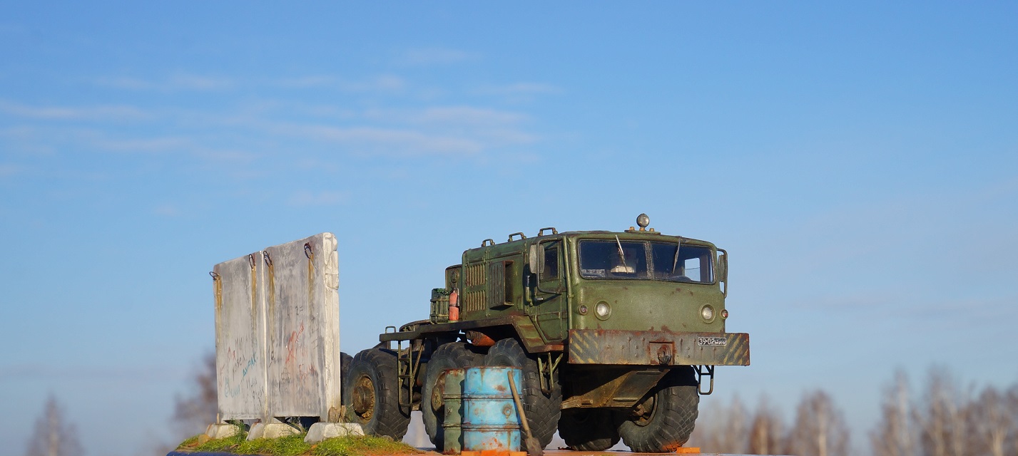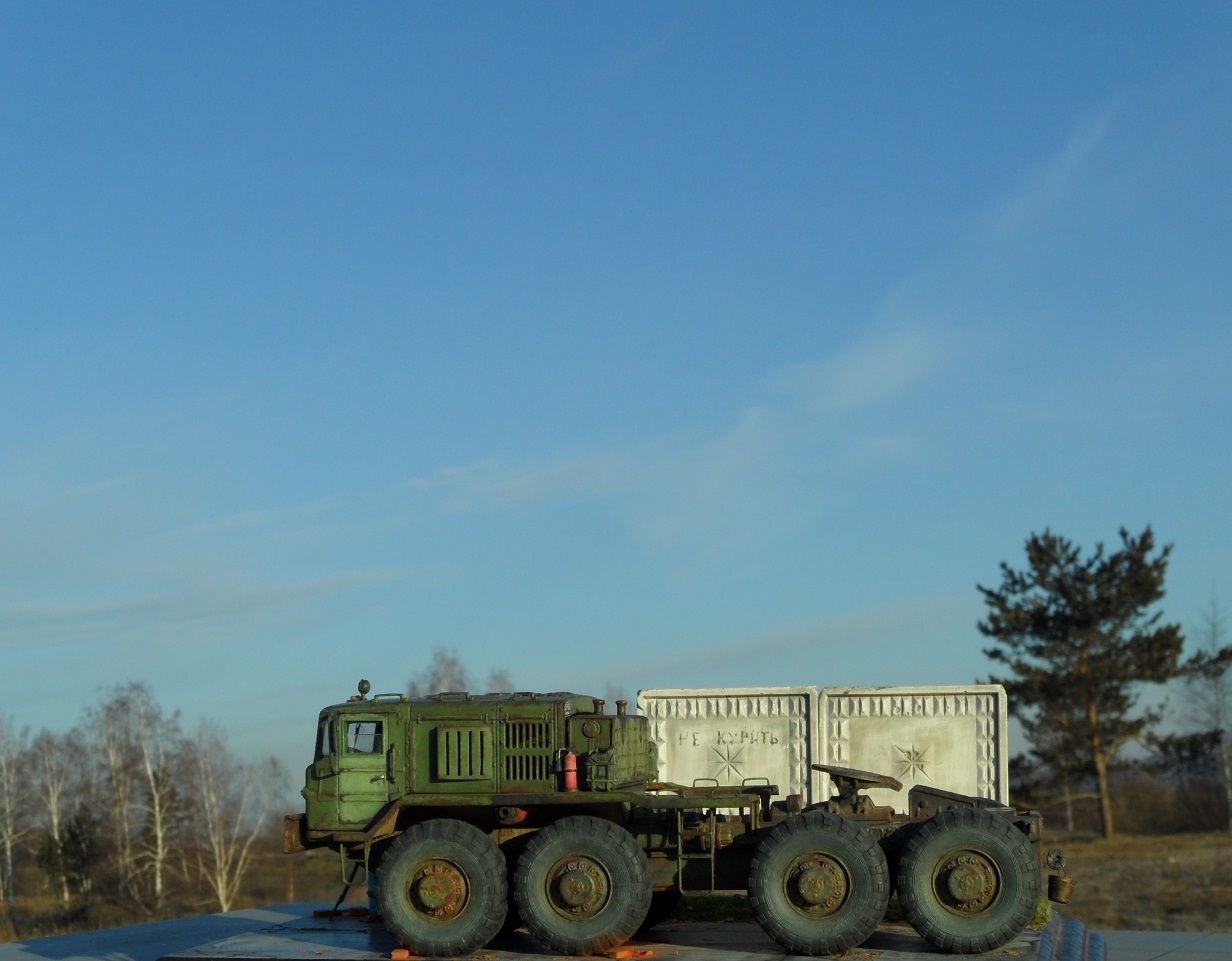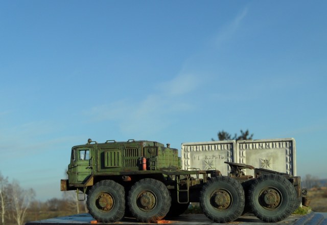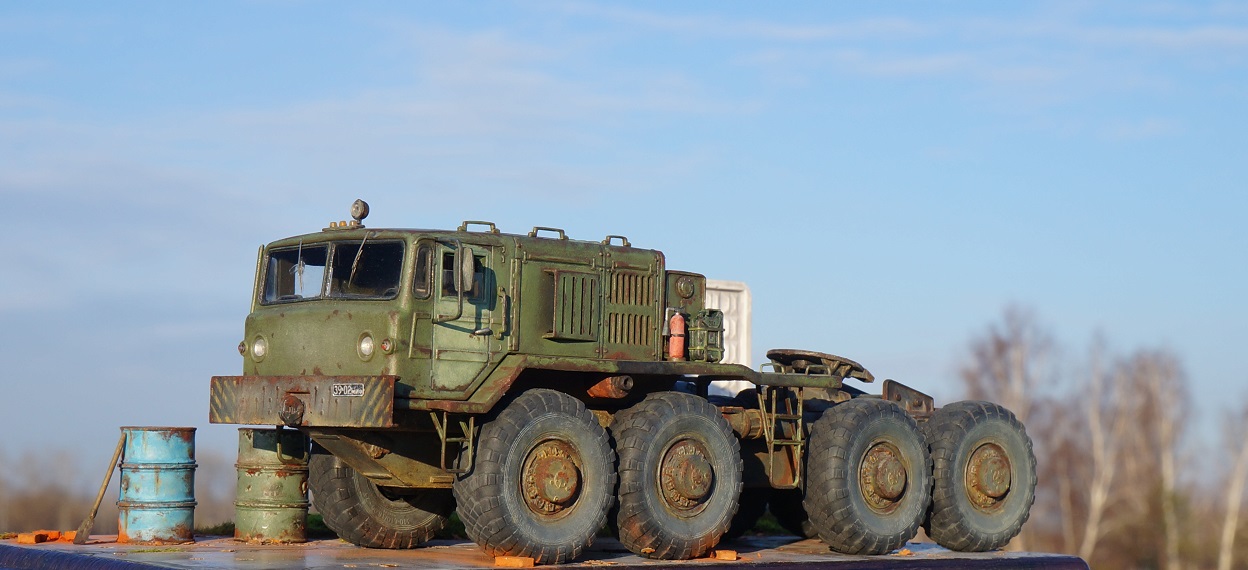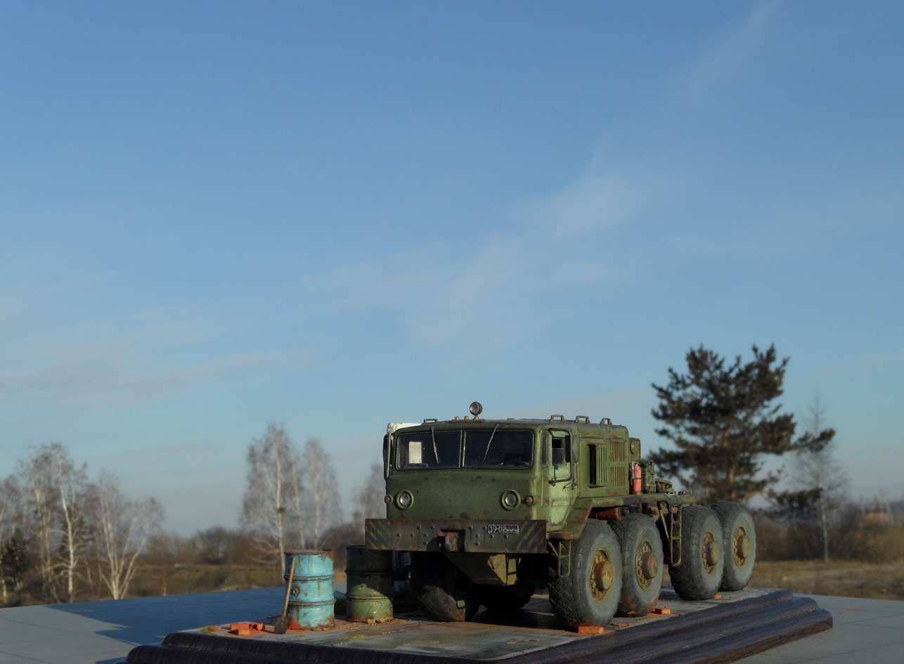 Привет всем! Нравятся мне эти многоосные гиганты, потому решил собрать еще раз такой Маз, собирается модель отлично, набор очень простой. Деталировка слабая, потому доработал кабину, переделал глушители, канистры из смолы от "Петроград", ведро , номера и лопата их же травление. Углубил передние фары, сточил колеса, сделал держатели канистр, дворники из фототравления, добавил задние ручки. Для этого грузовика изготовил подставку- все интереснее на полке будет смотреться, основание плиты- шпаклевка, забор от "СМУ-23", трава и листья Зип и пакля, земля- земля и пигмент Зип.Приятного просмотра!