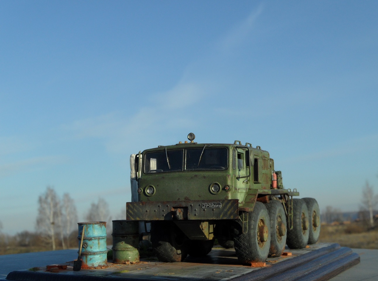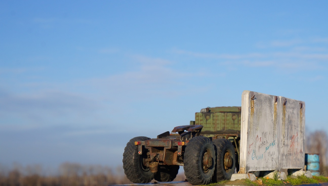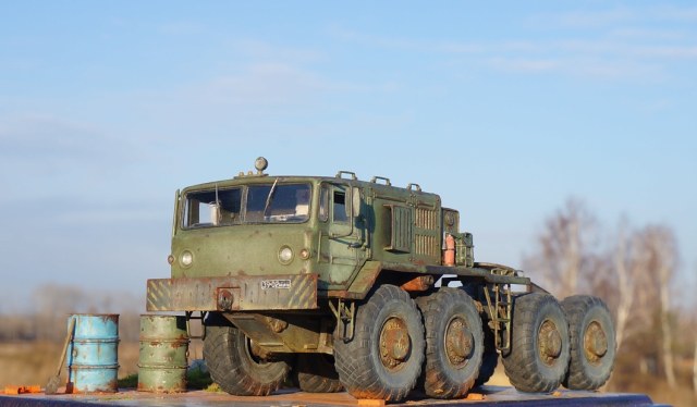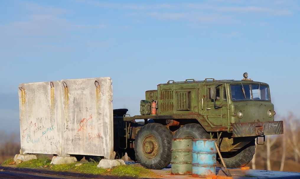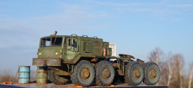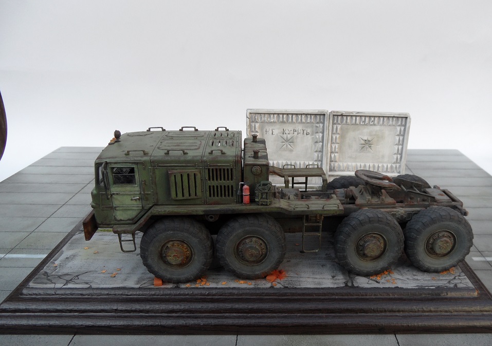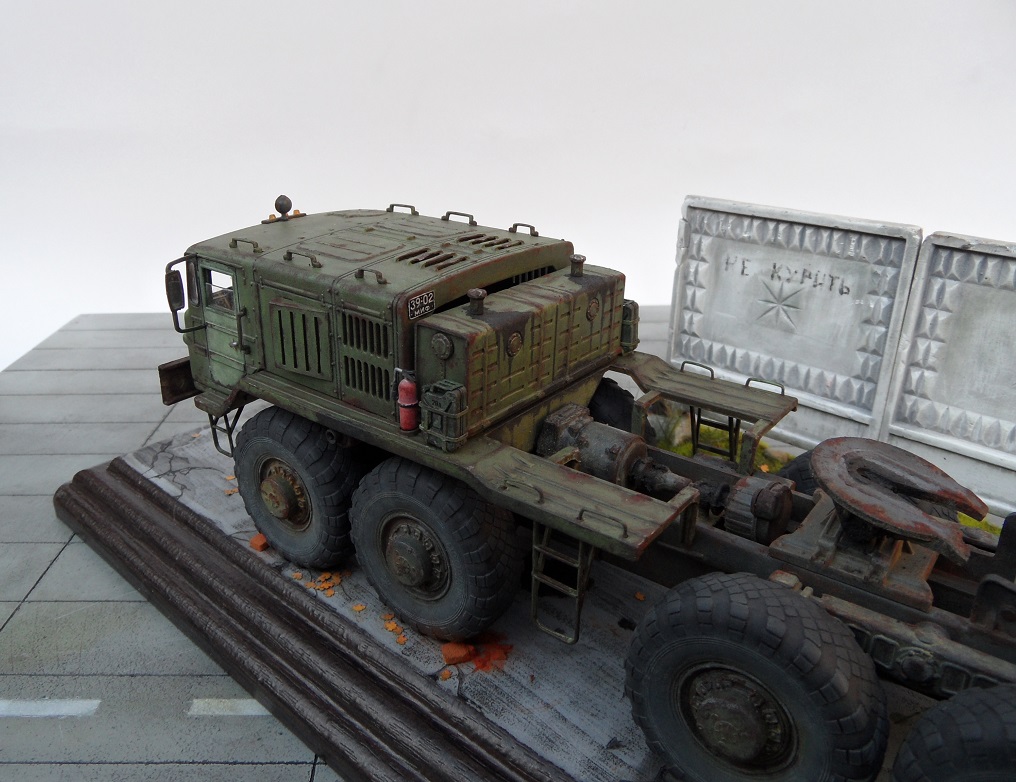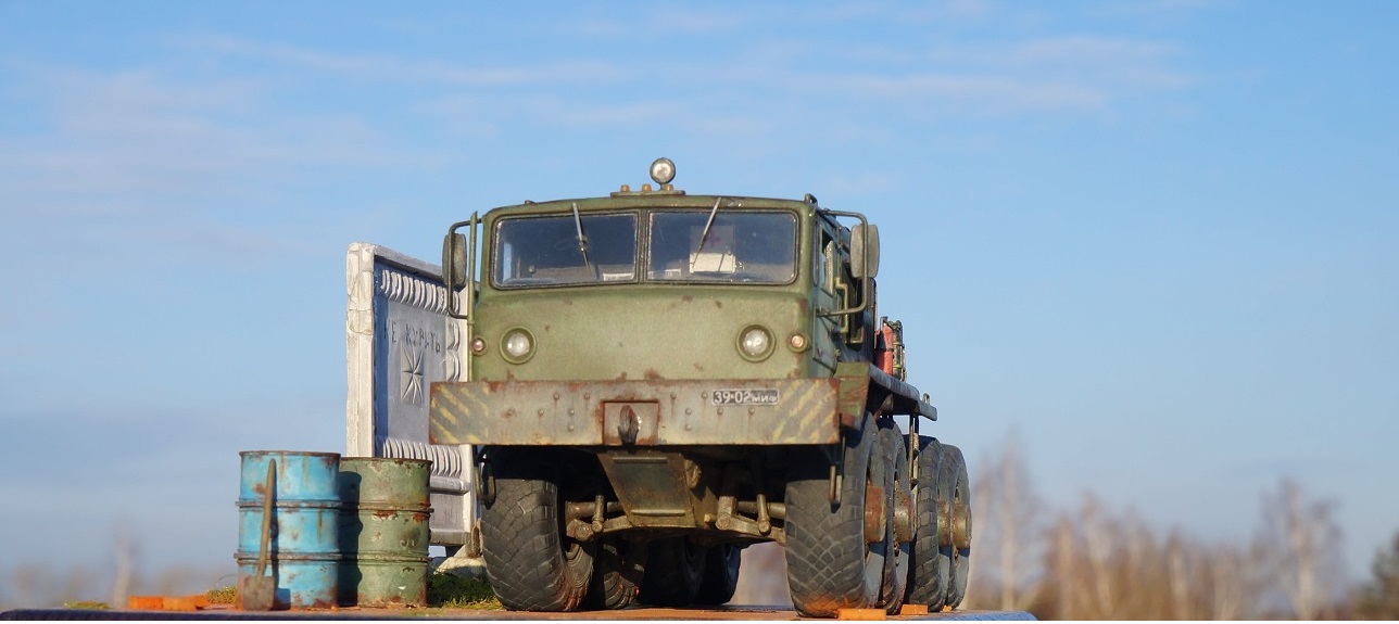 Привет всем! Нравятся мне эти многоосные гиганты, потому решил собрать еще раз такой Маз, собирается модель отлично, набор очень простой. Деталировка слабая, потому доработал кабину, переделал глушители, канистры из смолы от "Петроград", ведро , номера и лопата их же травление. Углубил передние фары, сточил колеса, сделал держатели канистр, дворники из фототравления, добавил задние ручки. Для этого грузовика изготовил подставку- все интереснее на полке будет смотреться, основание плиты- шпаклевка, забор от "СМУ-23", трава и листья Зип и пакля, земля- земля и пигмент Зип.Приятного просмотра!
