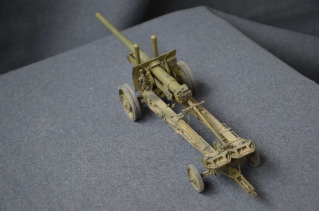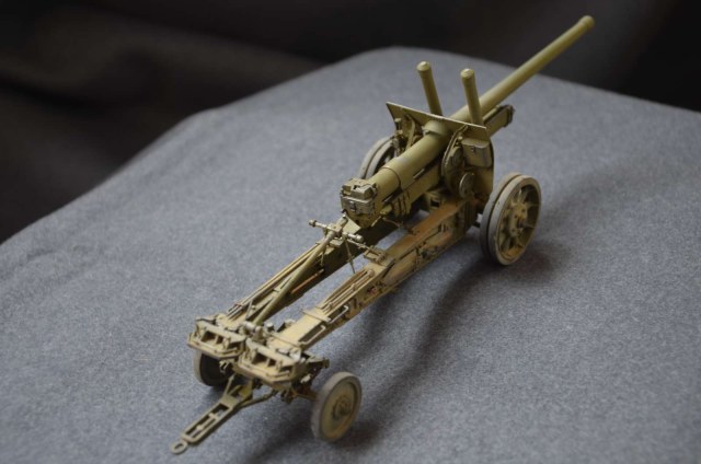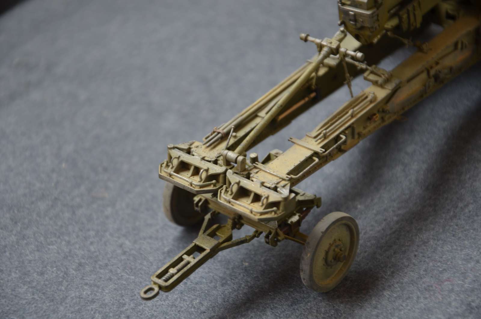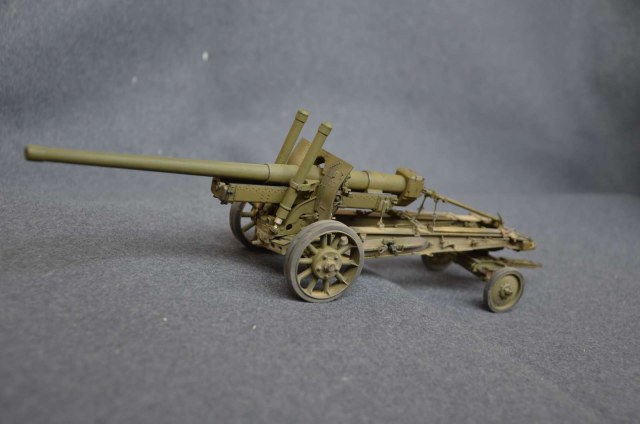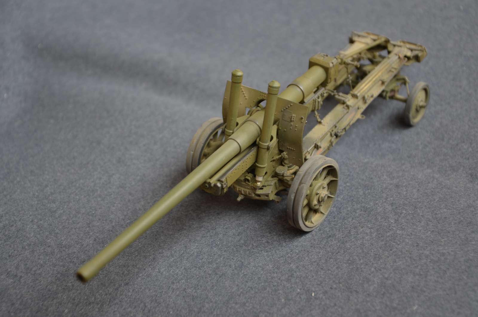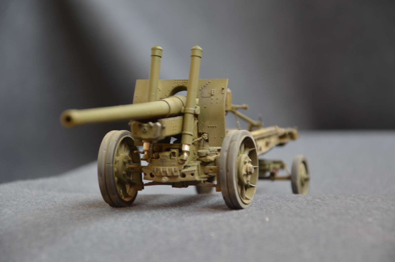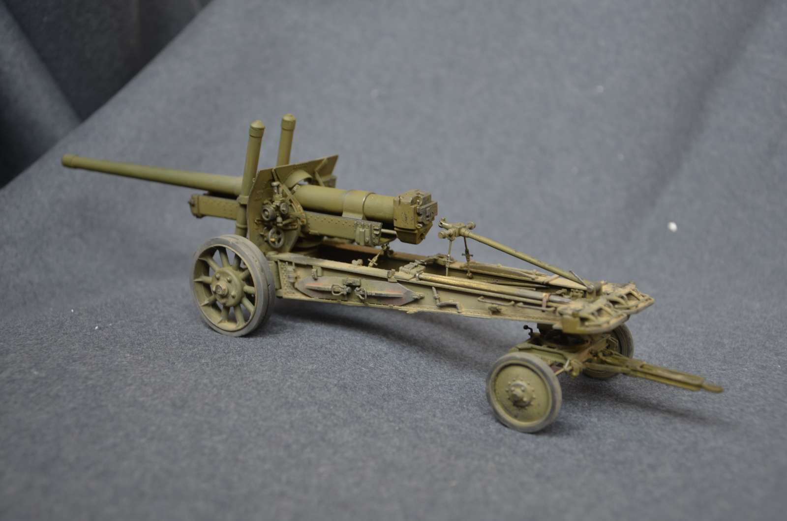Выставляю на ваш суд модель 122-мм пушки образца 1931 года (А-19). Сборка практически искоробочная, несколько доработаны цилиндры уравновешивающего механизма (наклонные колонны перед щитом). Нанесены следы эксплуатации (износ грузошин, потертости, сколы краски).