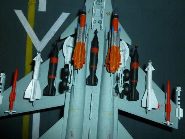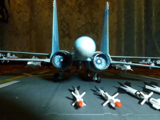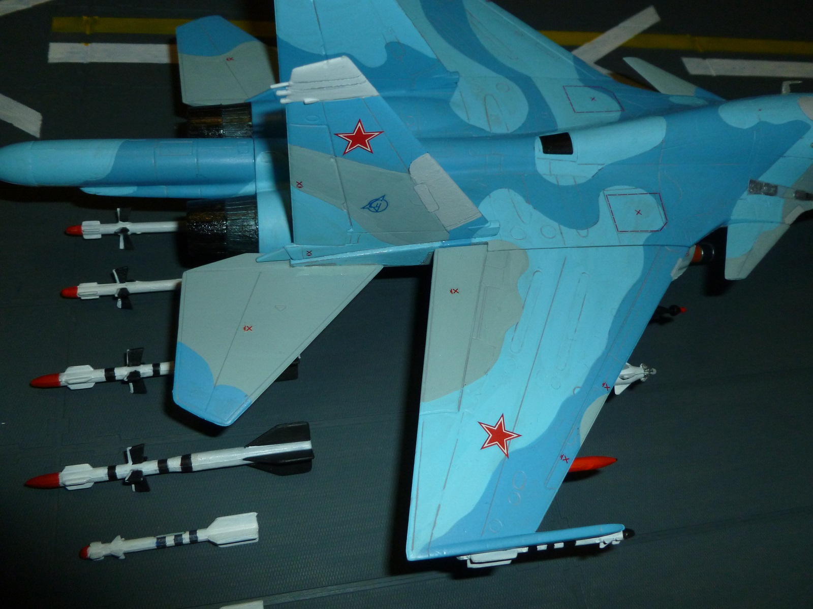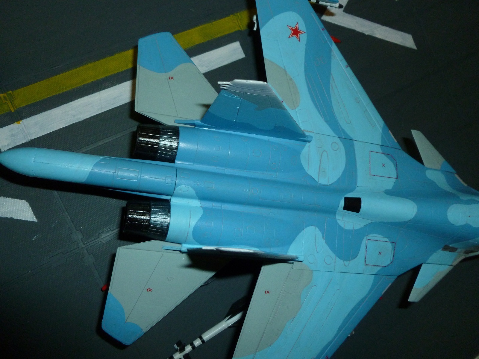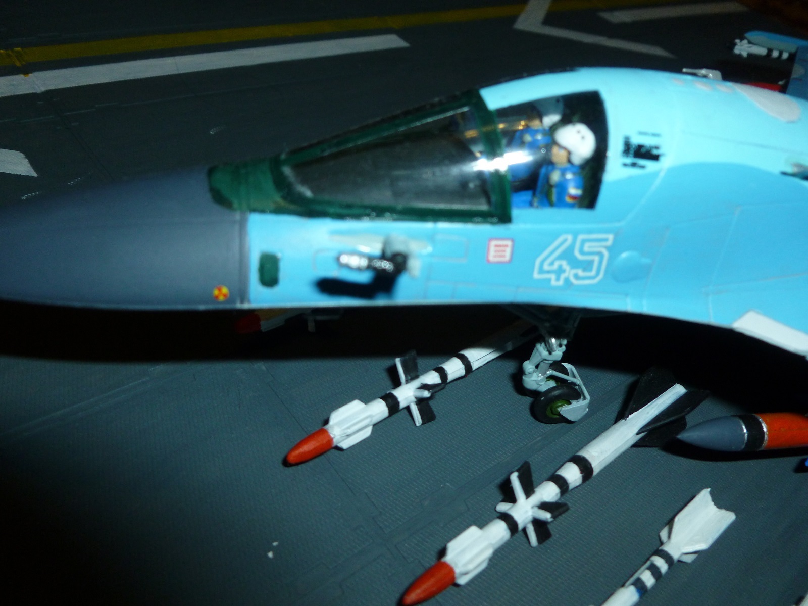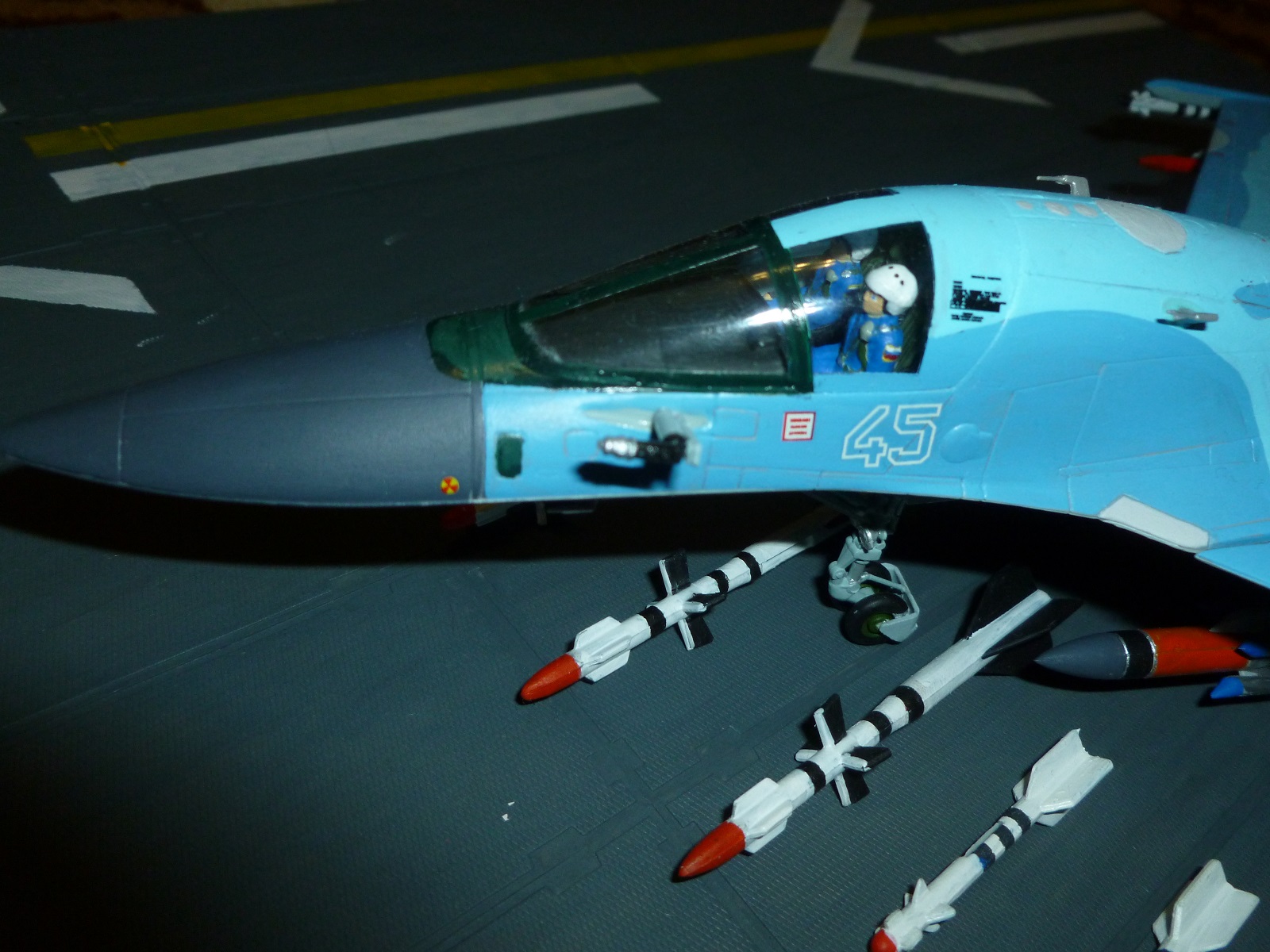 Борт номер 45. Окраска по инструкции от Фирмы звезда. Использовал краски для фюзеляжа от звезды: голубой №36, светло-голубой №13, голубой авиационный №23 в том числе для днища. Носовая часть цвет серо-зелёный №22, шаровый №42, но можно серый №31 разница в пол тона. Есть сомнения по окраске носовой части в оригинале самолёта кажется что в 2 цвета, красил по инструкции. Турбины красил в цвета : воронёная сталь №08 AcryMetal в перемешку с Королевским синим №47. Внутри турбины создал имитацию синего пламени также форсунки турбины воронёная сталь №08 и горелка AcryMetal в перемешку с Королевским синим №47 и рамка горелки с золотым №03 контуром. Окраску ракет произвёл идентично оригиналу цвета: шаровый №42, чёрный №20, оранжевый №33, AcryMetal , синий №58, Белый №17, красный№12. Перед покраской грунтовал с балончика Tamya серая грунтовка. По инструкции декали не понятно указаны поэтому есть сомнения в их точности установки. Красил кистью. Стойки шасси цвета: голубой авиационный №23, серебро №05. Колёса чёрный №20 и диски колёс зелёный №35 и белый №17.Нишы шасси цвет серый авиационный №54. Воздухо-заборники внутри жёлтый №16. При окраске производил расшивку бортов зубочисткой для реалистичности модели. Пилотов в комплекте не было использовал фигуры от су 27 уб русские витязи с Российским триколором на правом предплечье. Жду ваших комментариев и советов.