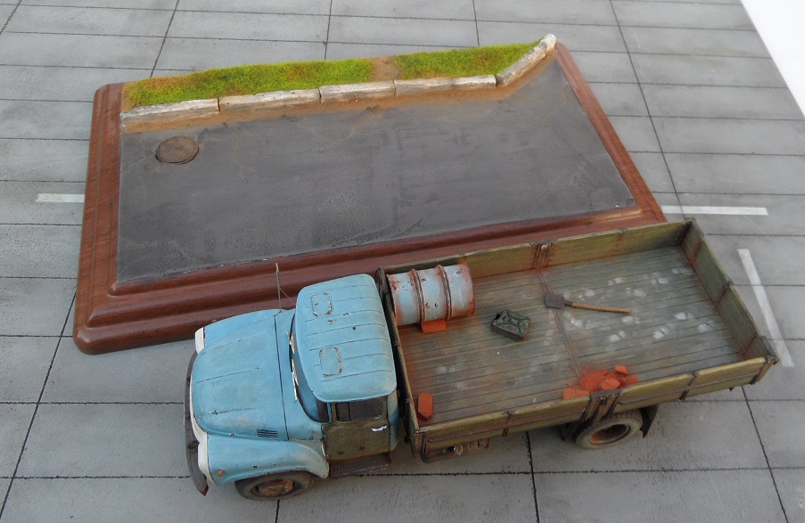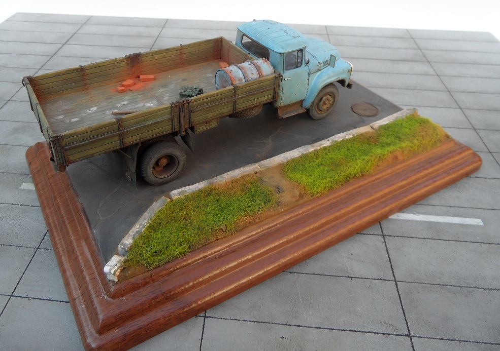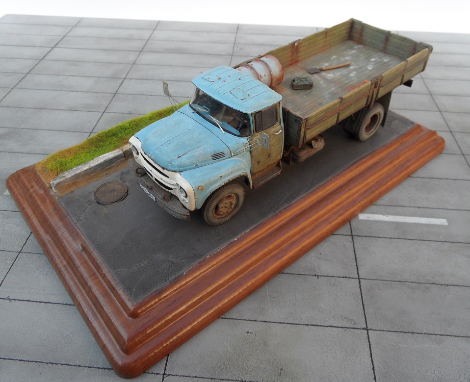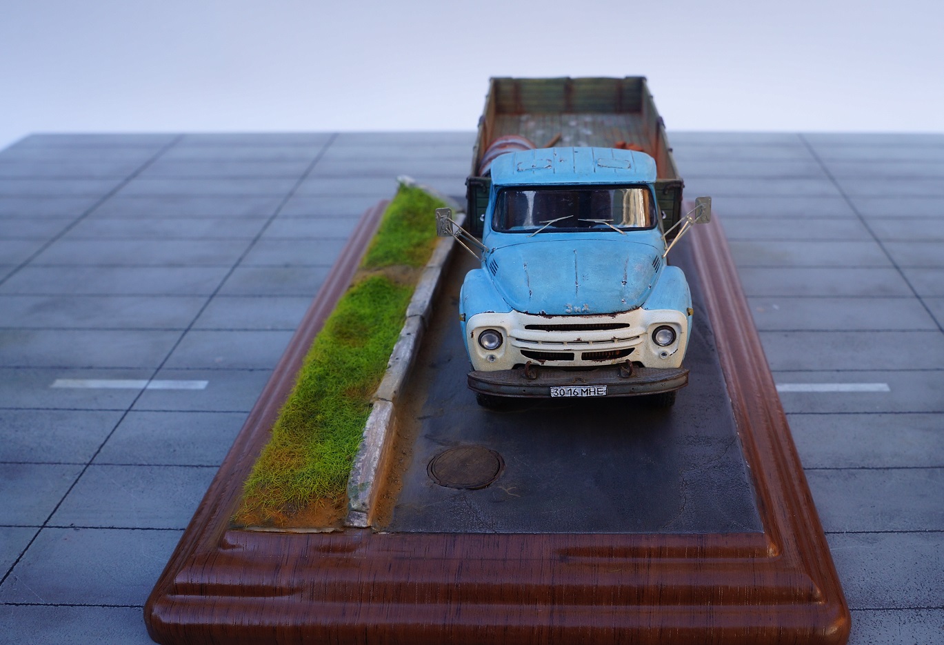 Привет всем! Этот Зилок собирал параллельно с Мазом, но Маз закончил пораньше чуток. На подставке от Зилка эксперементировал с посадкой травы итд. Про модель скажу так- отличная и легкая в сборке. Кабина металл, остальное пластик . Резина- резина). Из доработок -зеркала и ведро, номера-травление Петроград, катафоты тоже их. Сделал брызговики и добавил крепление к штатным, малость доработал кабину. Единственное- не смог сточить колеса, резина очень мягкая, нужно менять на Харьковскую. Подставка- шпаклевка, бардюры- мел, земля-земля и пигмент, трава Зип, крышка колодца самодельная. Окрашивал как всегда Мотип- кабина Андриатика, кузов - Хаки, тонирована пигментами .По автомобильно тематике на очереди еще Кировец и диорама.Приятного просмотра!