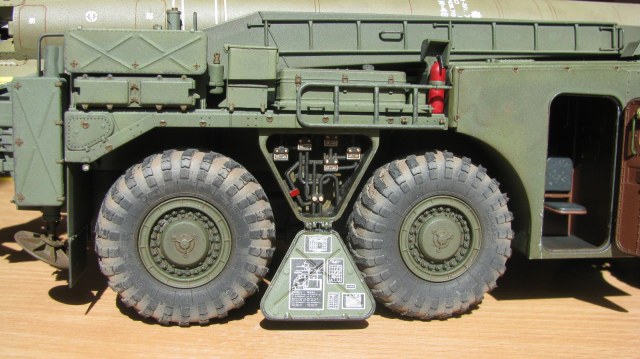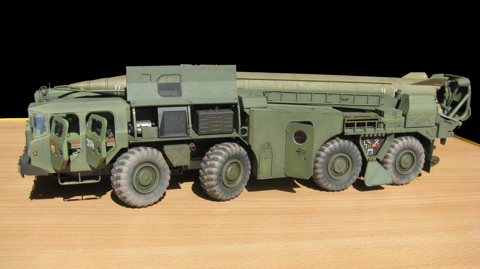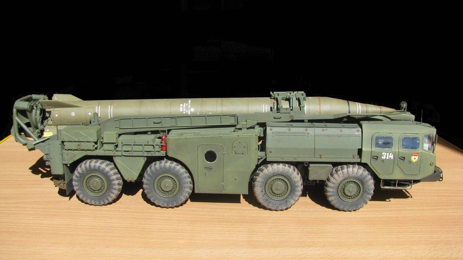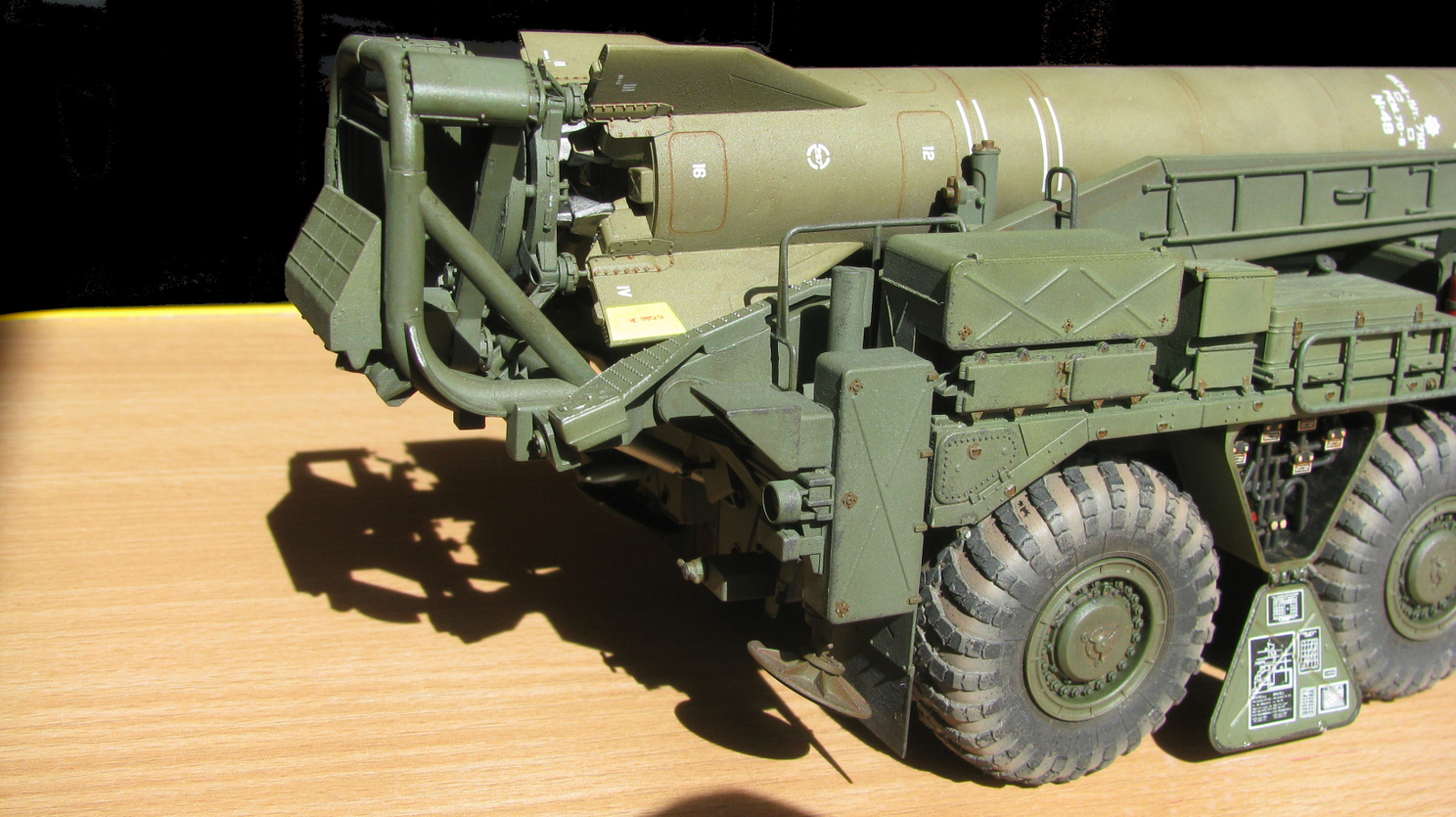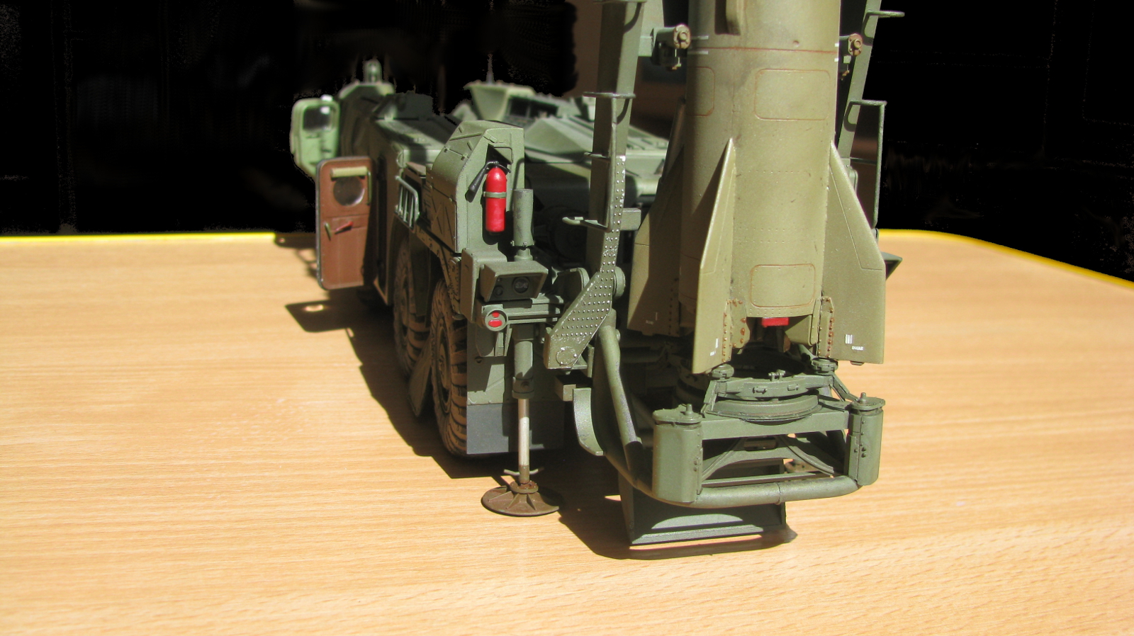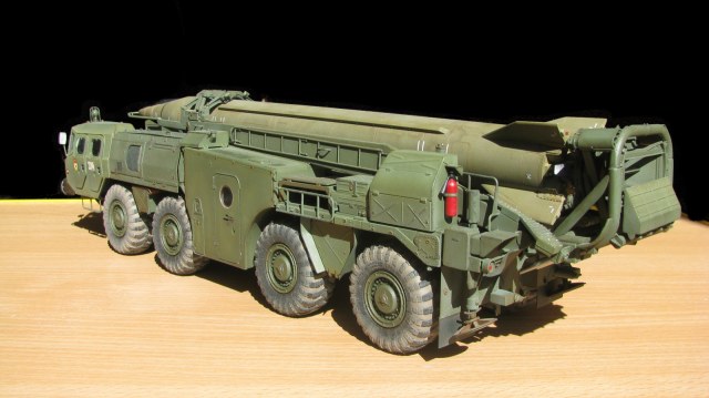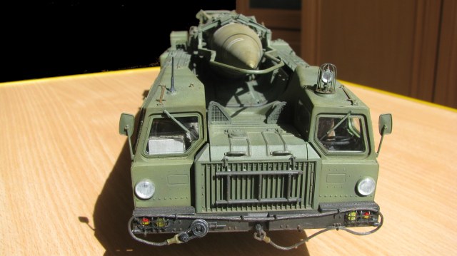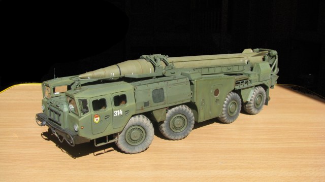 Блестящая работа! Сборка, покраска и тонировка очень качественные. Модель настолько живая, что мало отличается от фото реальных агрегатов. Но есть ряд неточностей по матчасти: отсутствуют шланги, перепутаны направления вращения двух (а может и более) колес. Тот "черпак", что находится под пусковым столом в момент стояния ракеты - это башмаки, состоящие из 4-х штук в ряд. И они, по уму, должны быть под колесами, а не под столом, на который они крепятся только в походном положении. И я не помню, чтобы на боевой части ракеты 8к14 были какие-либо ступеньки, но это, возможно, косяк производителя. Не вижу ничего, чтобы нельзя было безболезненно устранить, кроме ракеты. Без обид. А модель помещу в избранные, ибо очень понравилась! Удачи!