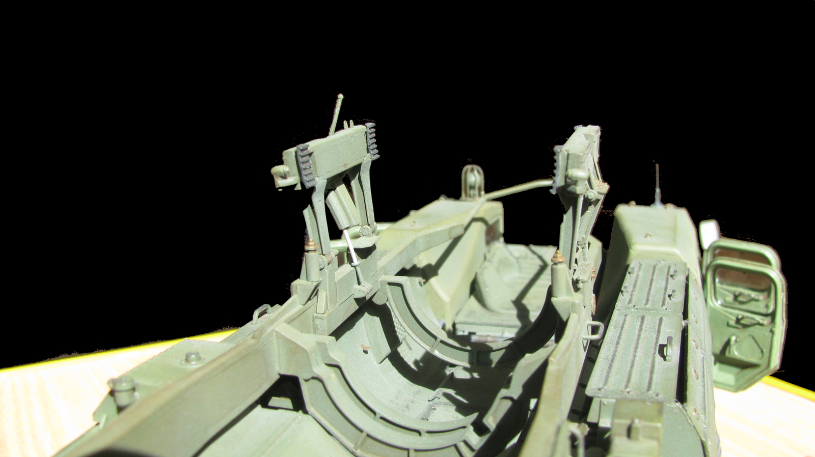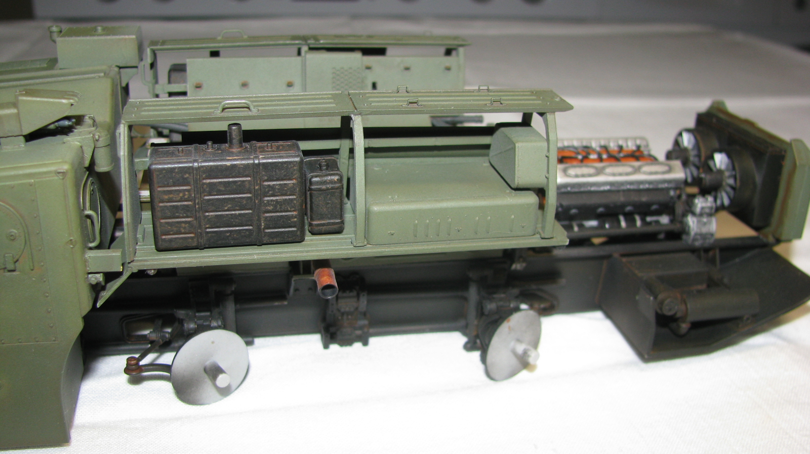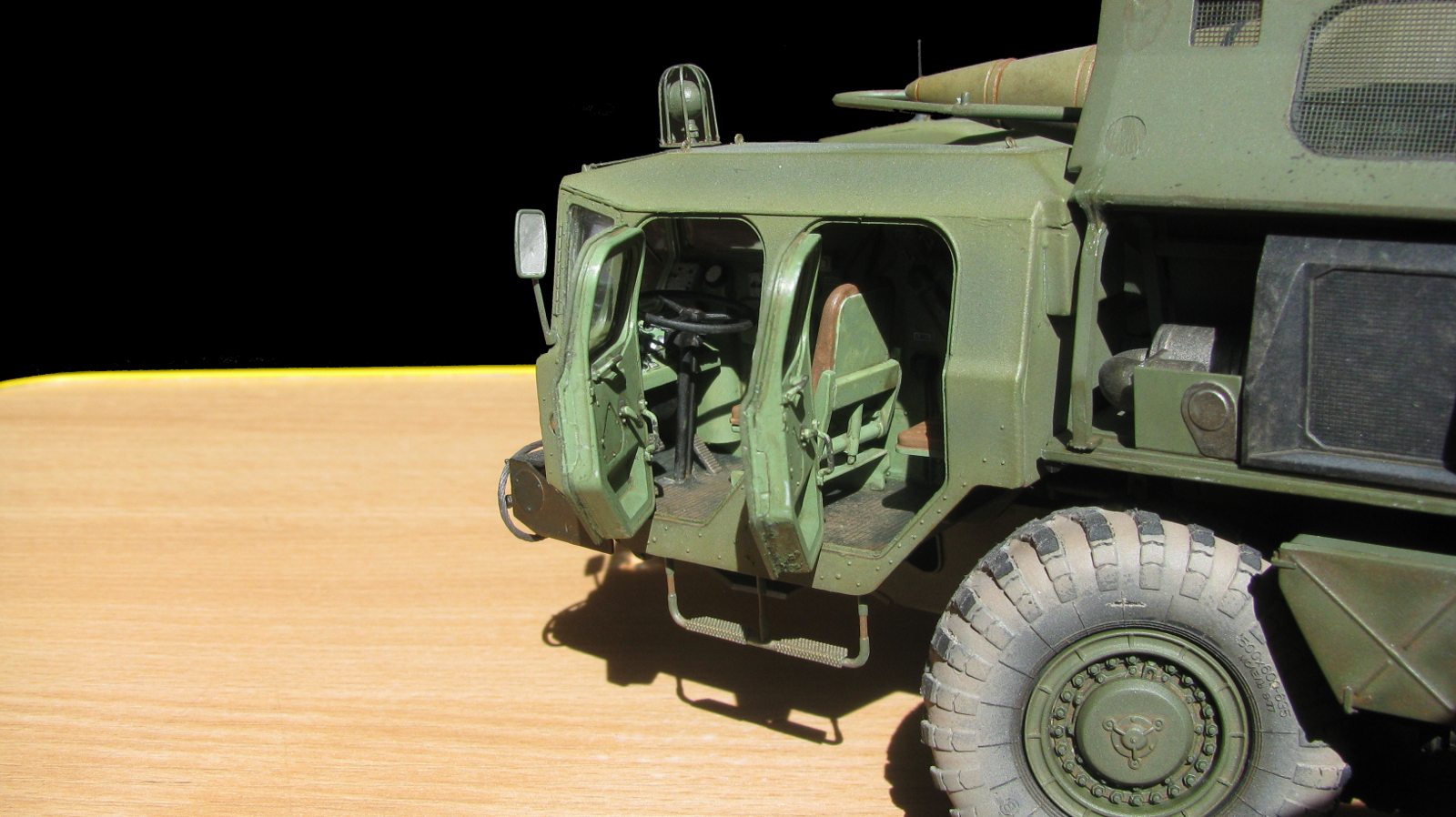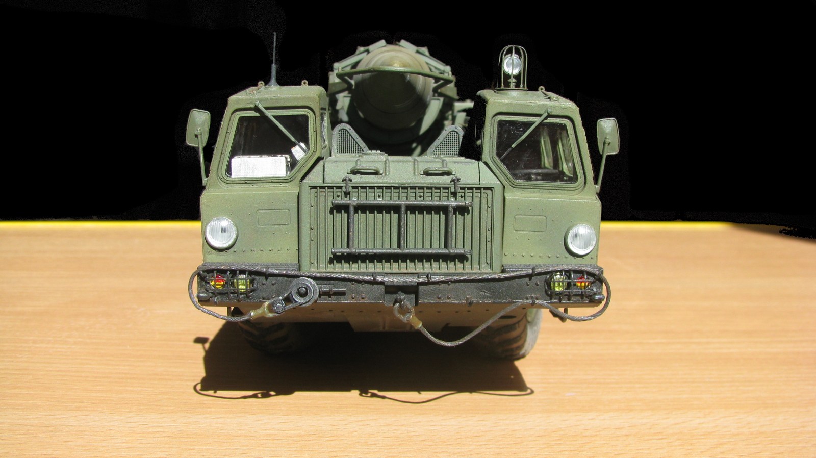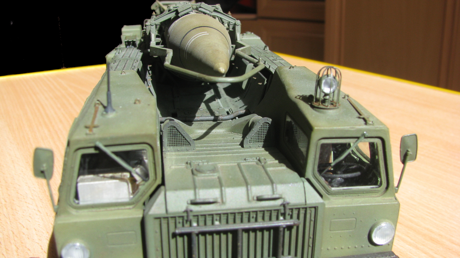 Блестящая работа! Сборка, покраска и тонировка очень качественные. Модель настолько живая, что мало отличается от фото реальных агрегатов. Но есть ряд неточностей по матчасти: отсутствуют шланги, перепутаны направления вращения двух (а может и более) колес. Тот "черпак", что находится под пусковым столом в момент стояния ракеты - это башмаки, состоящие из 4-х штук в ряд. И они, по уму, должны быть под колесами, а не под столом, на который они крепятся только в походном положении. И я не помню, чтобы на боевой части ракеты 8к14 были какие-либо ступеньки, но это, возможно, косяк производителя. Не вижу ничего, чтобы нельзя было безболезненно устранить, кроме ракеты. Без обид. А модель помещу в избранные, ибо очень понравилась! Удачи!