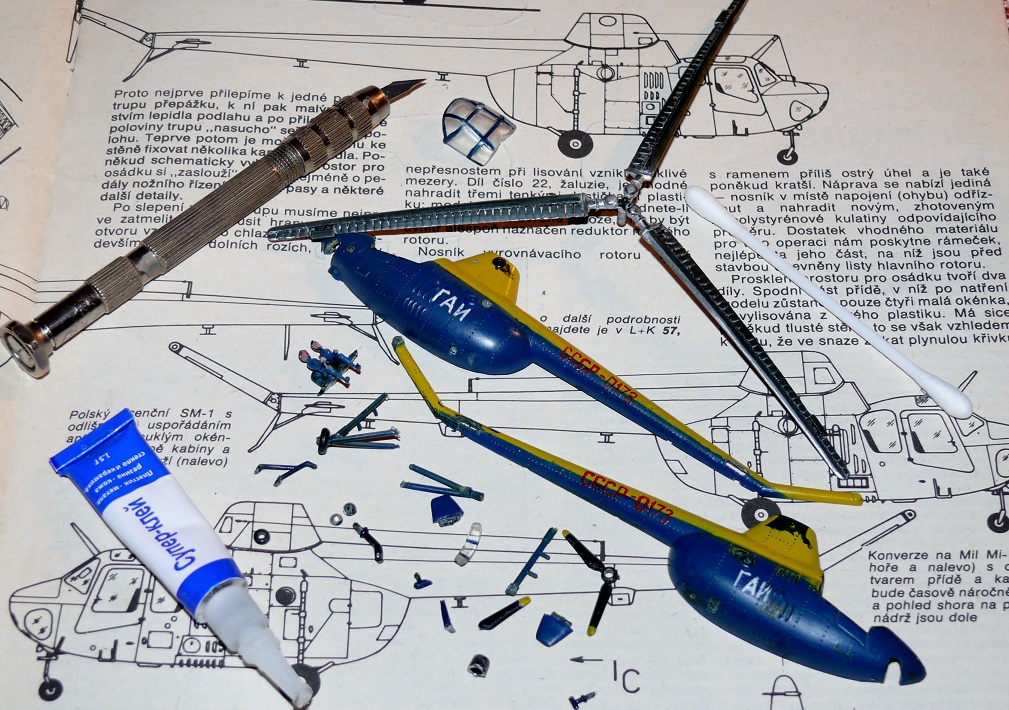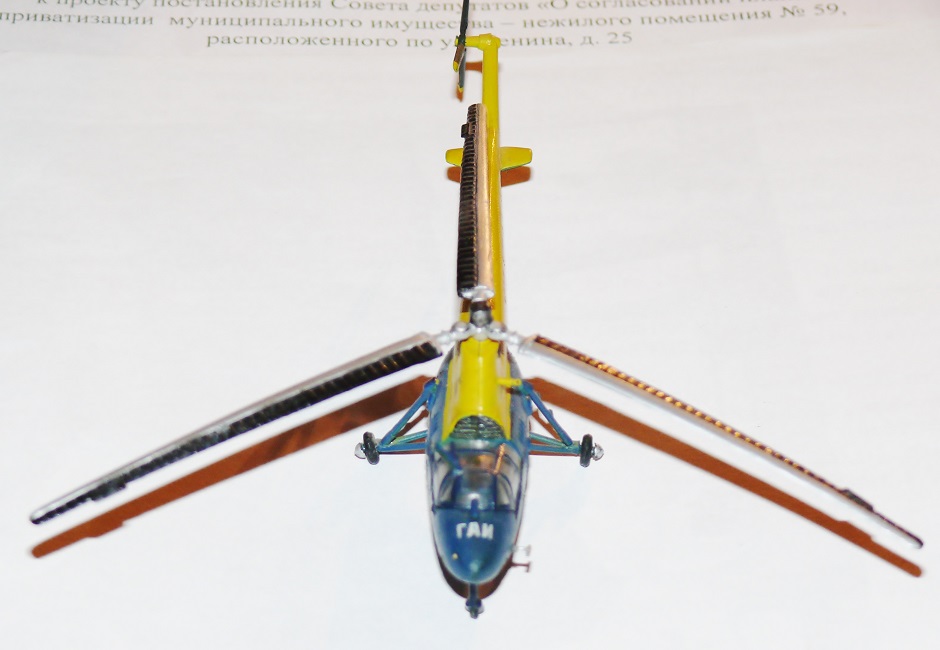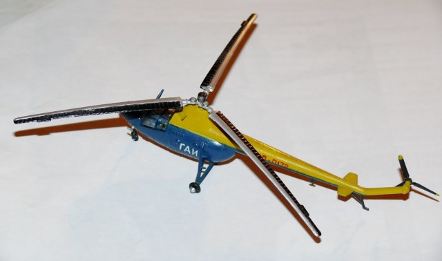 Вот еще один повод для ностальгации. Это моя самая первая модель из сохранившихся, которую я осознанно покрасил. Красил году в 86м. Красил совершенно «по взрослому» - нитроэмалью через аэрограф «Белорус». Надписи-раскоряки кисточкой писал. Вариант окраски увидел у друга, в шикарном, подарочном издании ГДРовской книжки посвященной 20летию полета Юрия Гагарина. Обалденная полиграфия, помню. Этакий праздничный фотоальбом страницах на 300х. И там была серия снимков о том, как Москва встречает Первого Космонавта Земли. На одном из фото- такой вот Мишка-Гаишка пролетает над толпой встречающих. Разумеется в те годы я понятия не имел ни о модификациях, ни о характеристиках вертолетика. Да и разработчики с Пластикарта не заморачивались об этом. Ми-1 и Ми-1, что вам еще нужно для счастья? Сейчас вспоминаю, что тот «Мишка-Гаишка» с фотографии был с большими блистерами-щеками на окнах пассажира. С него снимали кинохронику проезда кортежа по Москве.