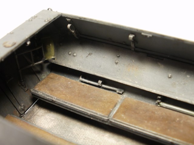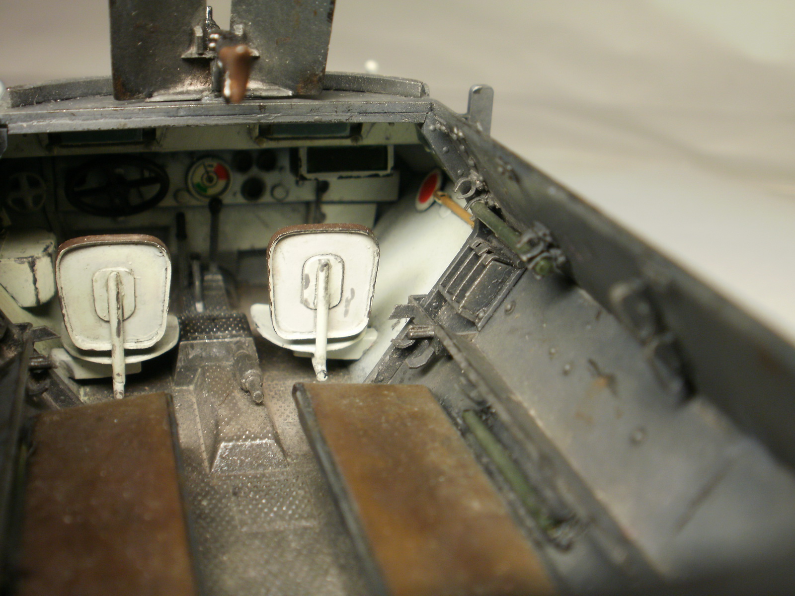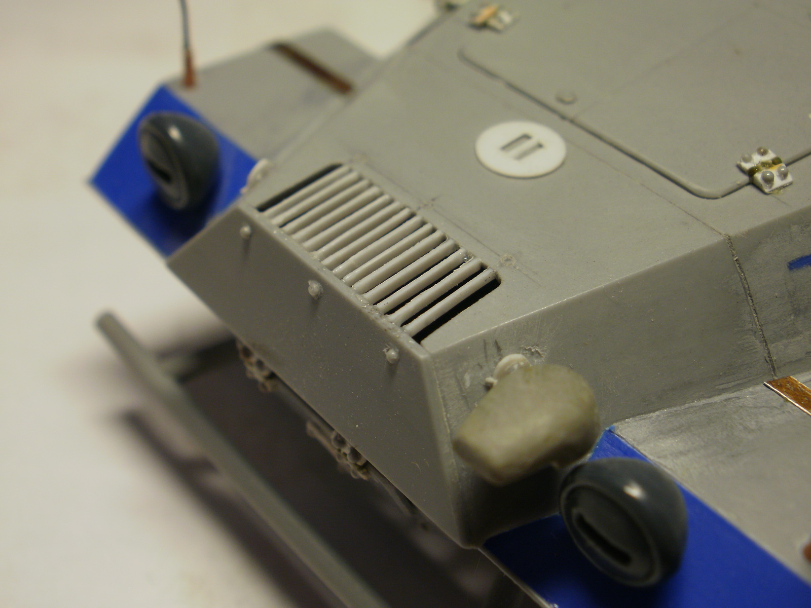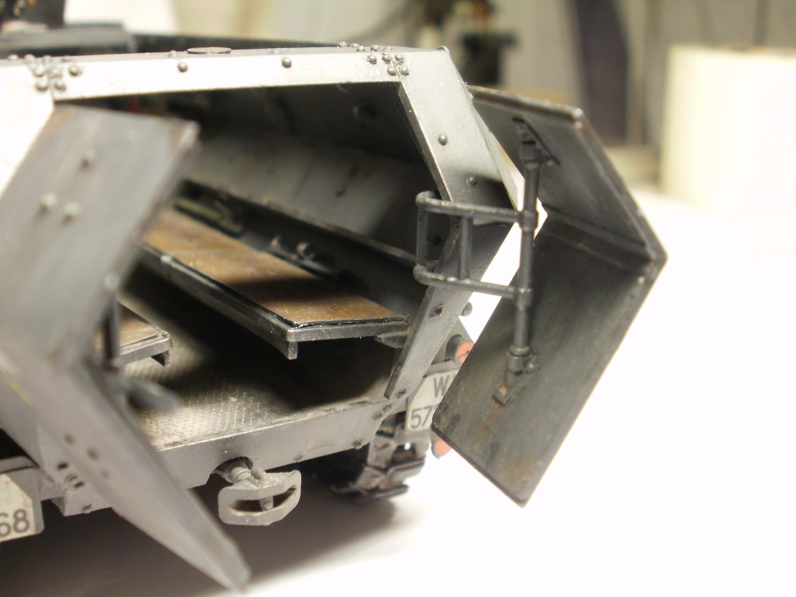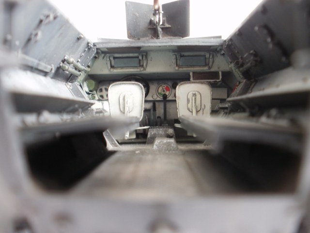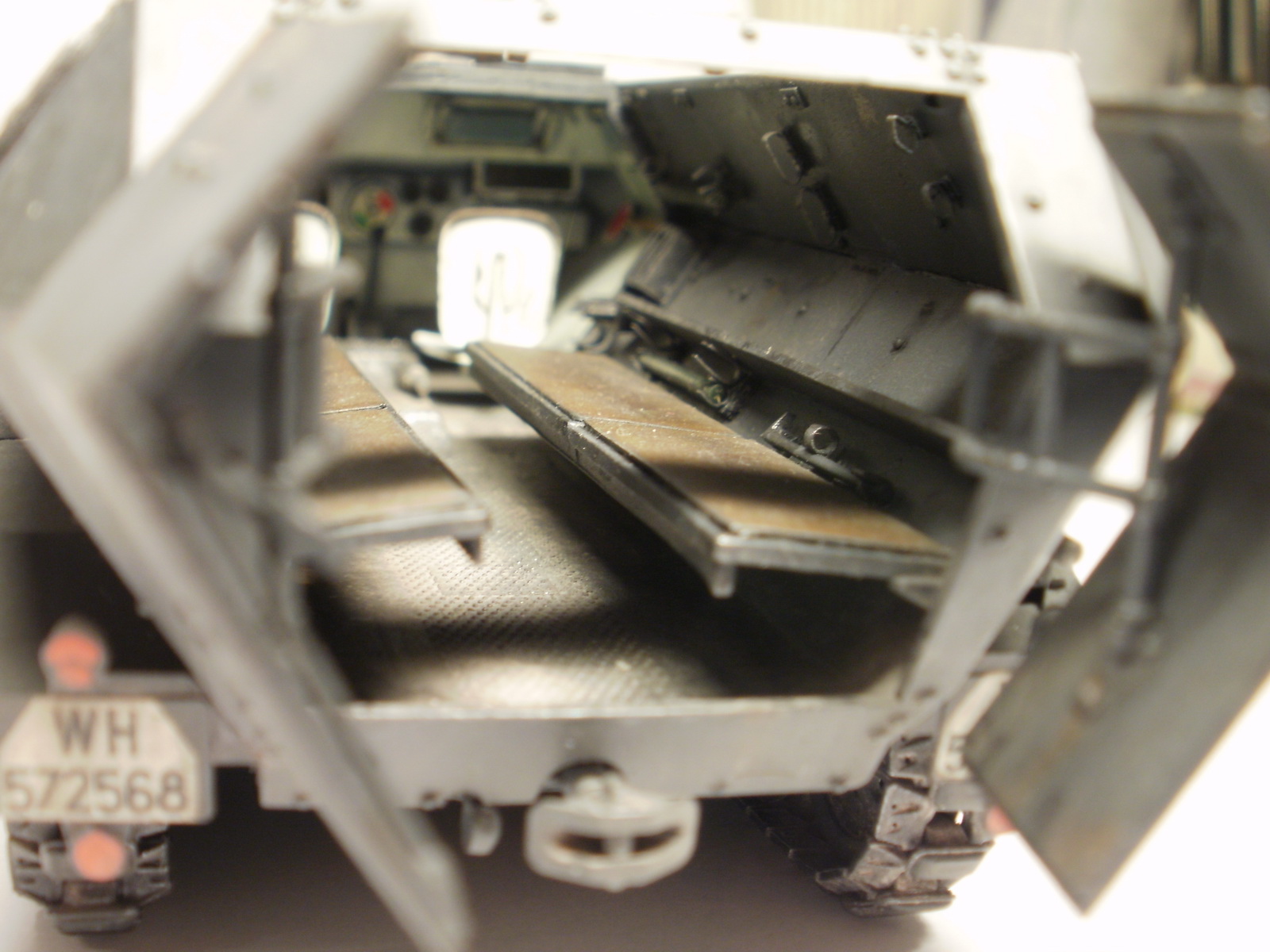 Не стоит делать макро на заклёпки со следами клея. Огнетушитель не удался, плюс стык от пресс-формы. Не совсем понял по номерным знакам: пластинка прямоугольная, а номер - с "фасками"? Внутрь салона стоило добавить снаряжения какого, а то как-то... пустынно...