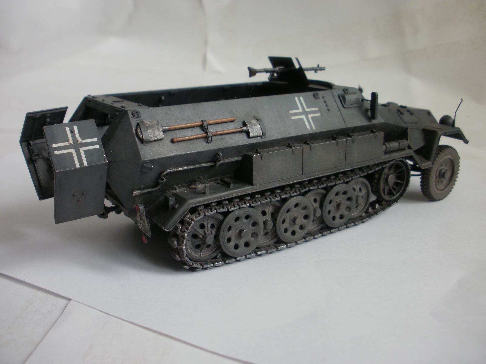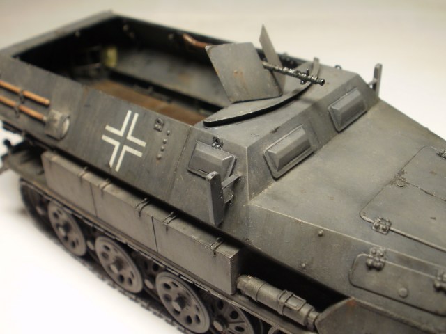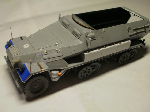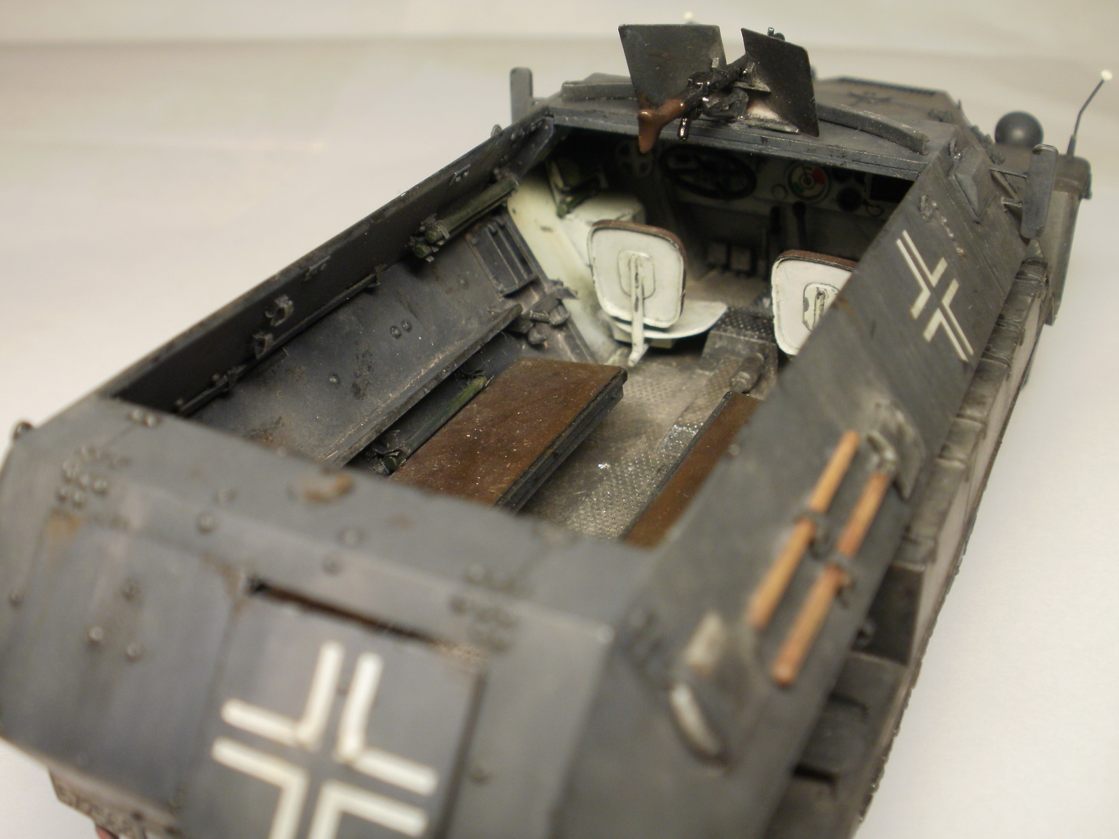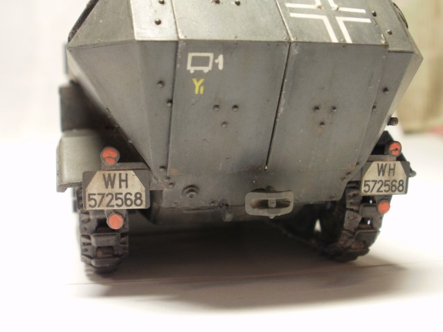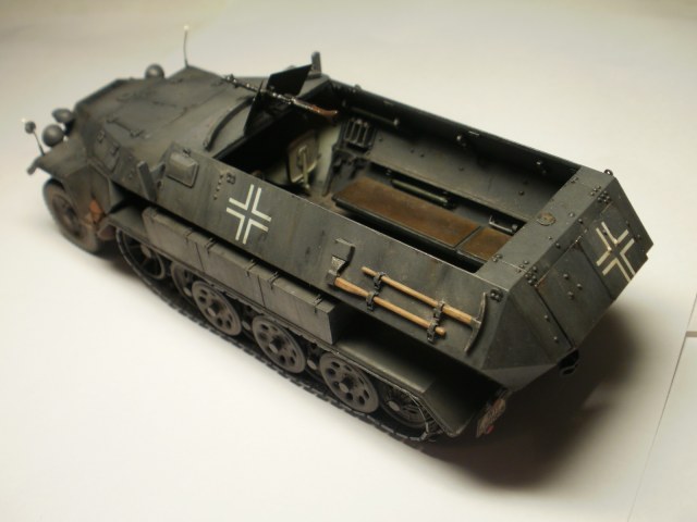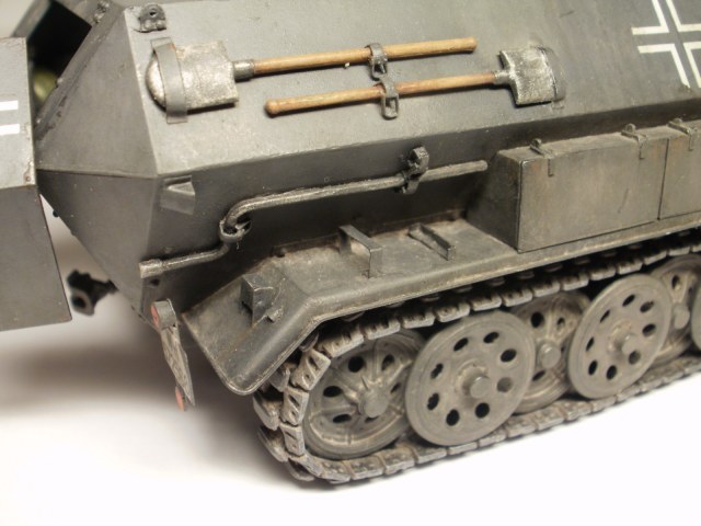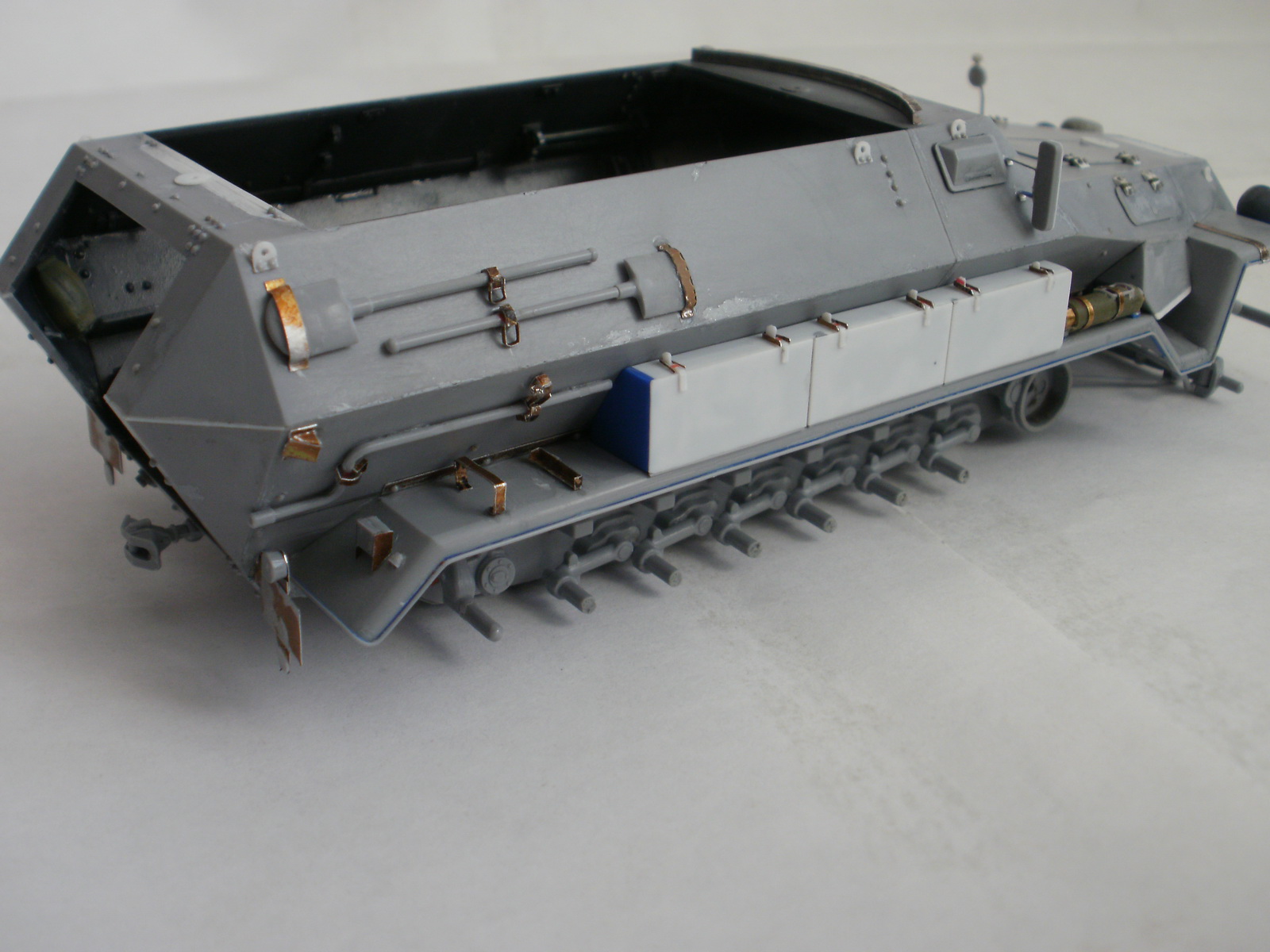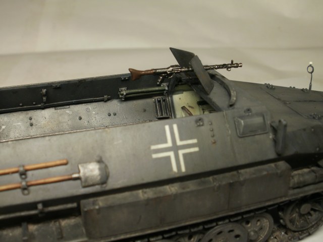 Переделке подверглось почти всё: отделение управления ,десантное отделение , нижняя передняя часть корпуса , немного ходовая часть , крылья и ящики ЗИП . Фары от Италери из запасов , MG-34 и тубус для противогаза из старого набора Звезды .