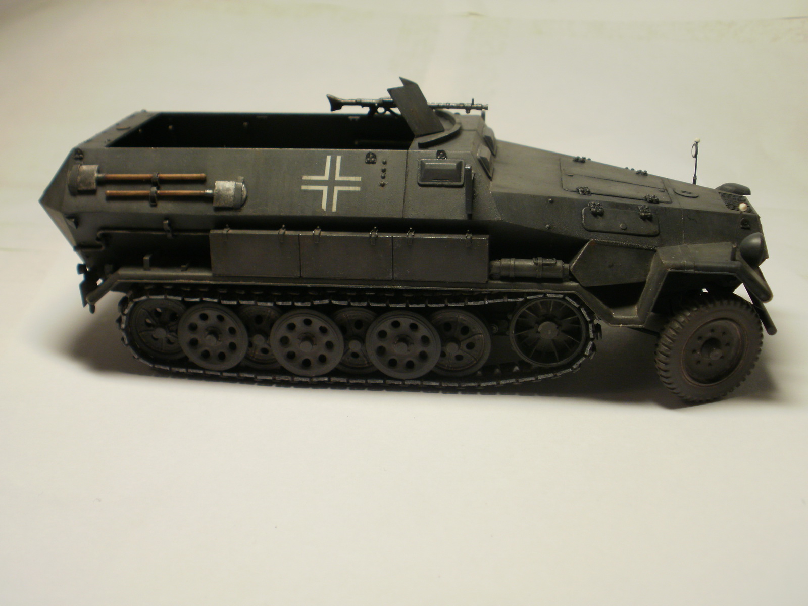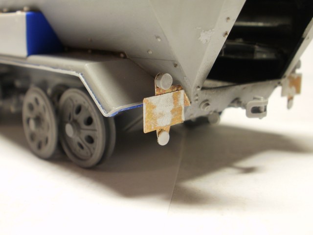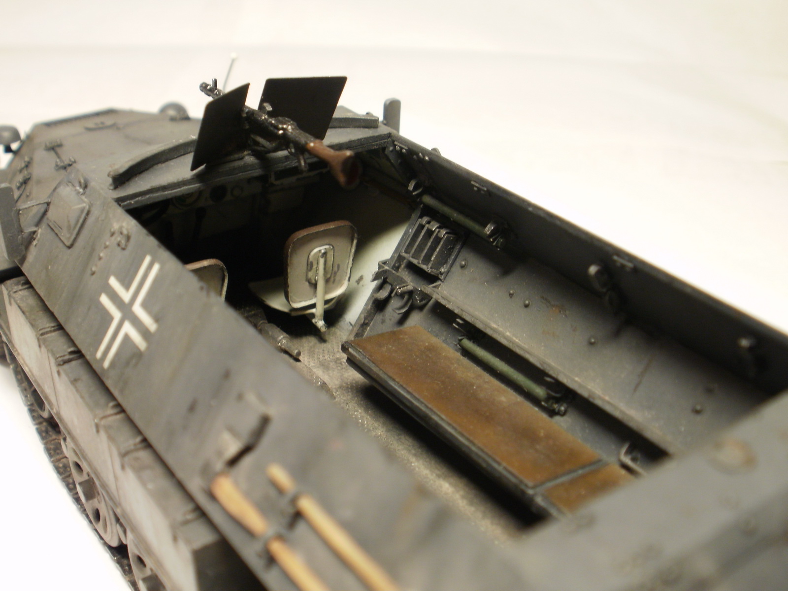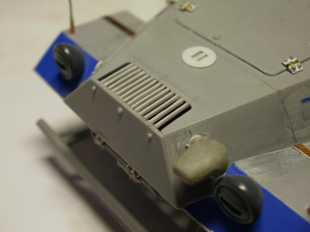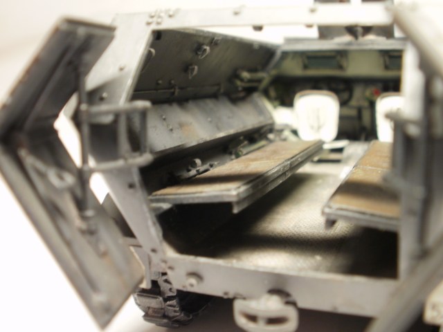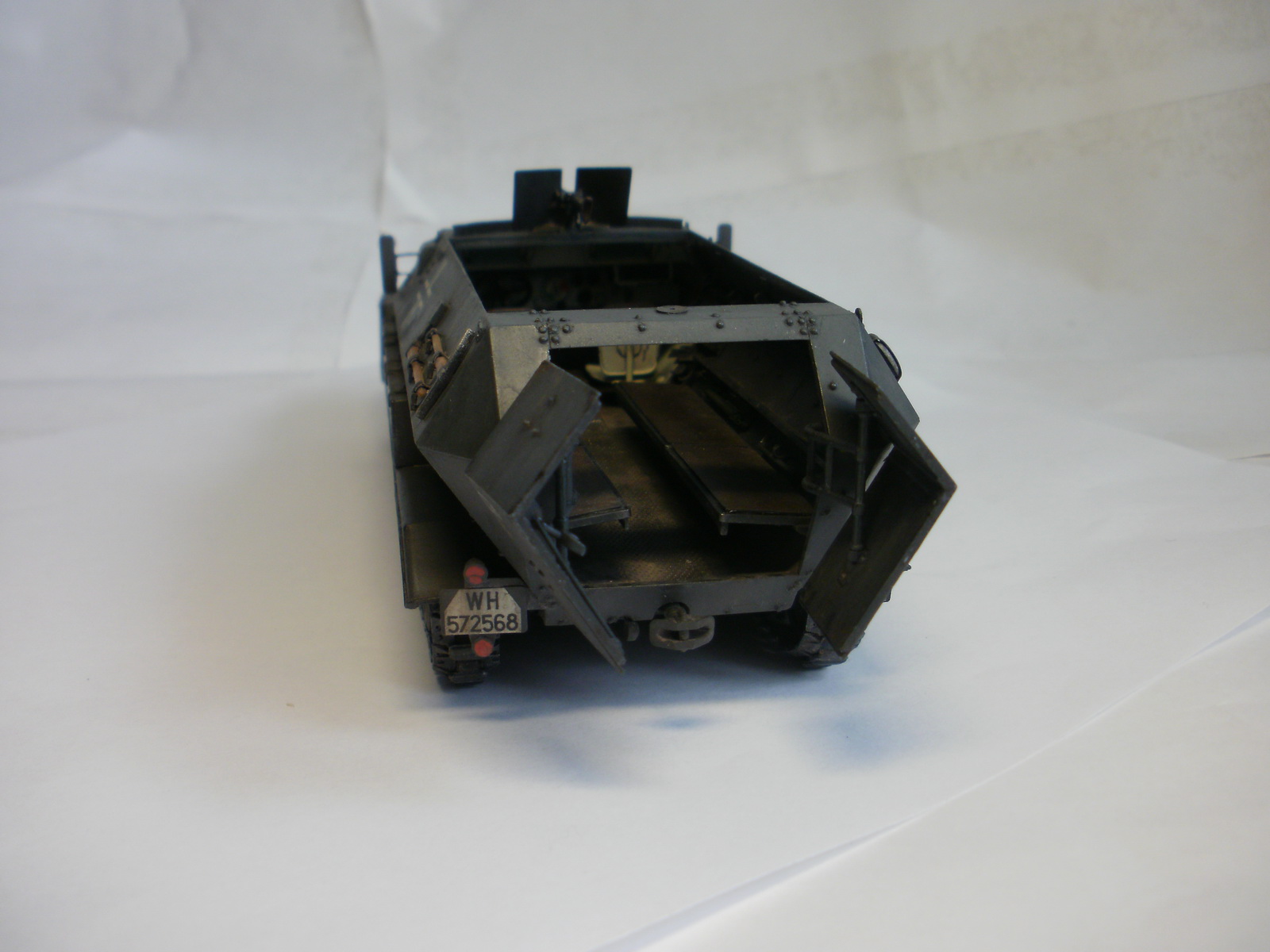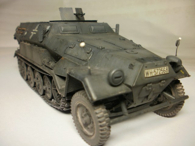 Переделке подверглось почти всё: отделение управления ,десантное отделение , нижняя передняя часть корпуса , немного ходовая часть , крылья и ящики ЗИП . Фары от Италери из запасов , MG-34 и тубус для противогаза из старого набора Звезды .