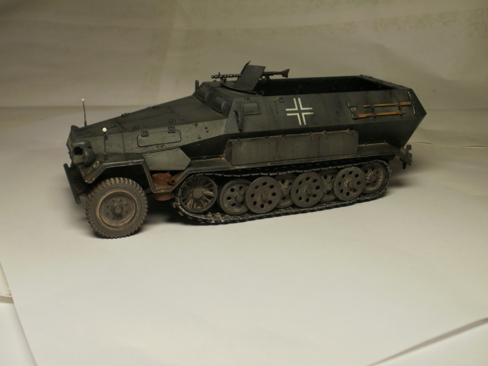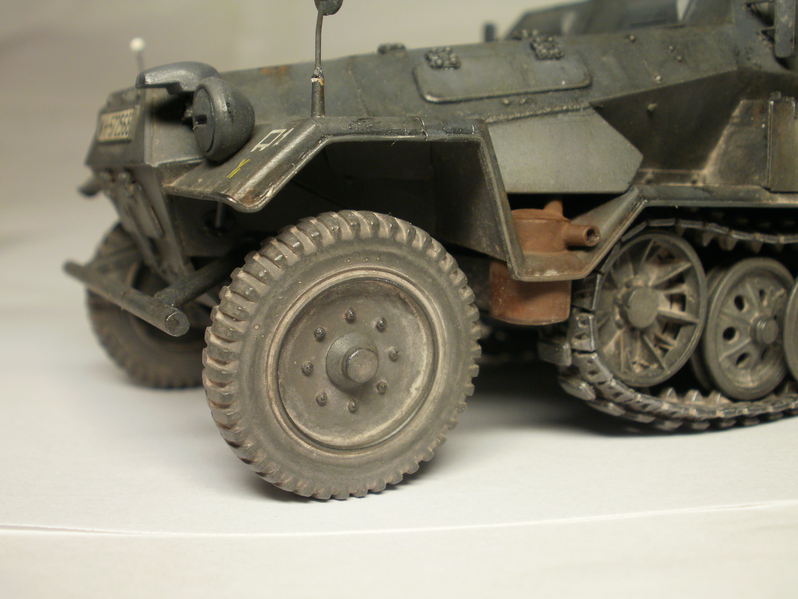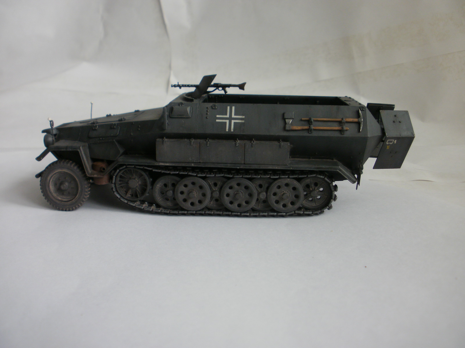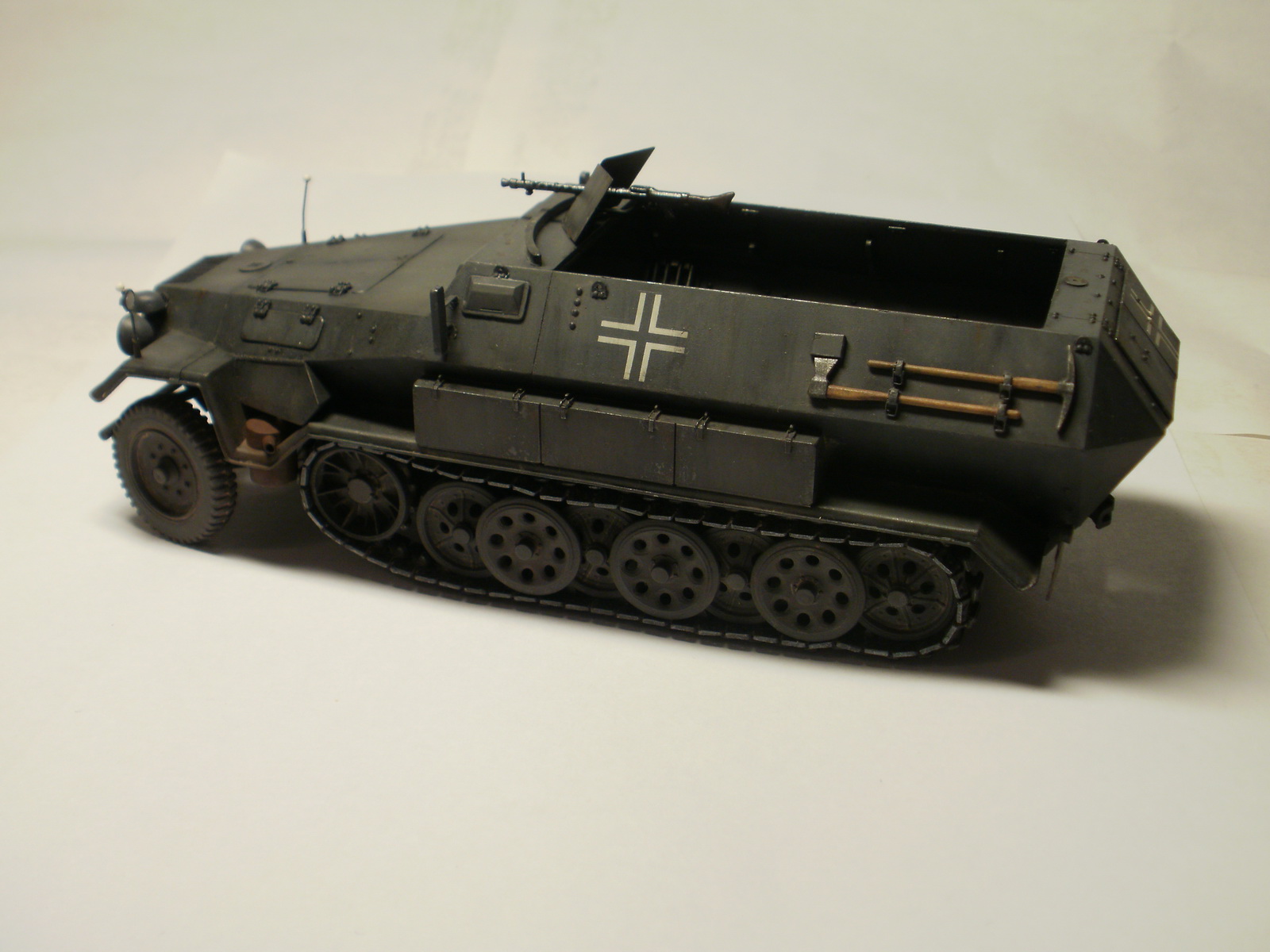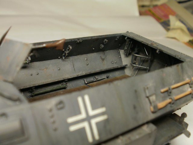 Переделке подверглось почти всё: отделение управления ,десантное отделение , нижняя передняя часть корпуса , немного ходовая часть , крылья и ящики ЗИП . Фары от Италери из запасов , MG-34 и тубус для противогаза из старого набора Звезды .