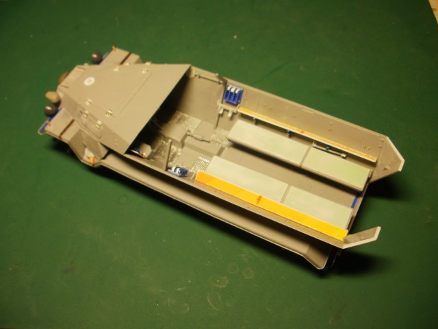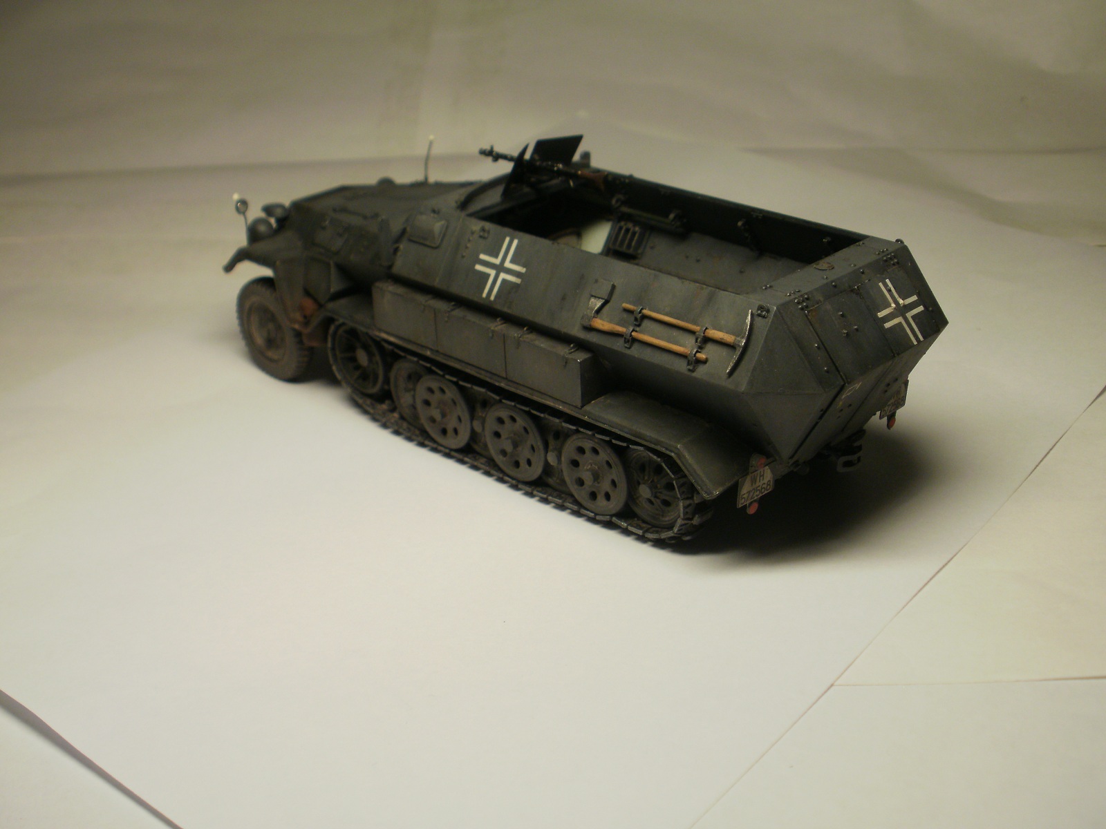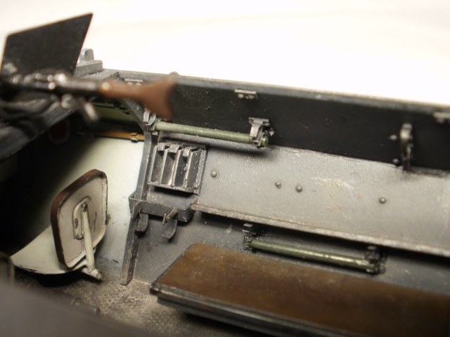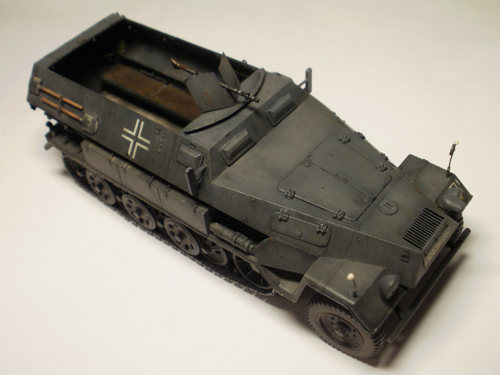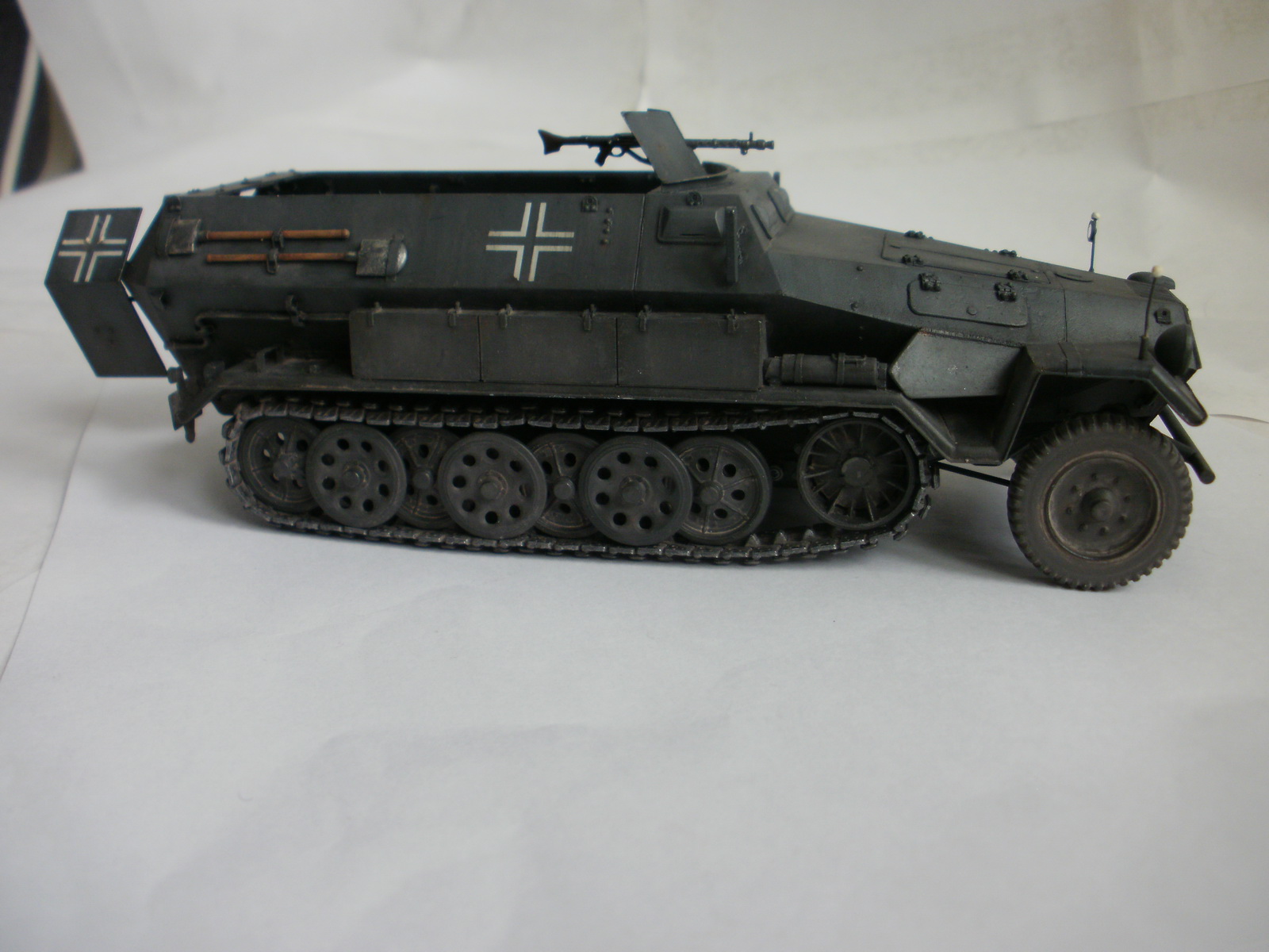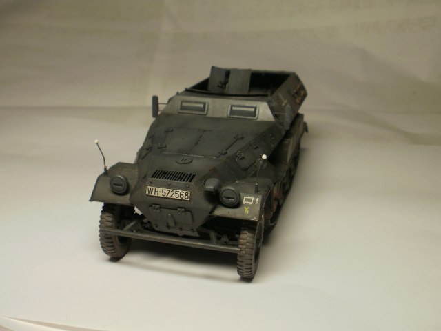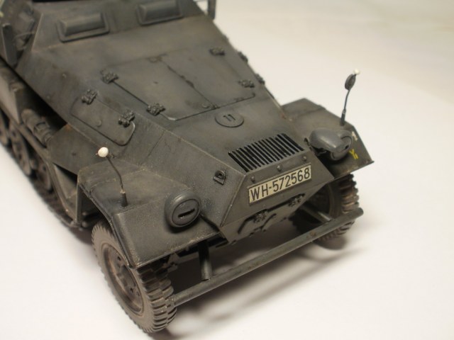 Переделке подверглось почти всё: отделение управления ,десантное отделение , нижняя передняя часть корпуса , немного ходовая часть , крылья и ящики ЗИП . Фары от Италери из запасов , MG-34 и тубус для противогаза из старого набора Звезды .