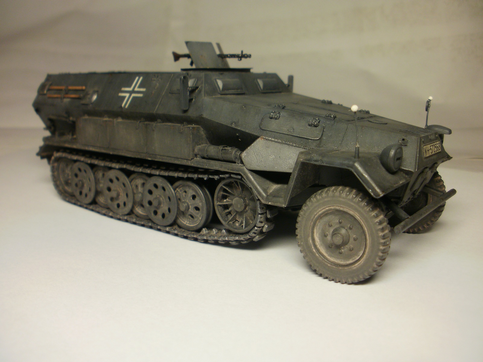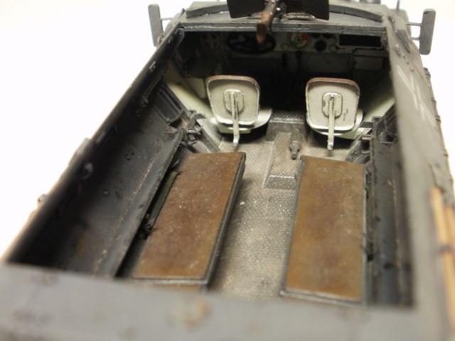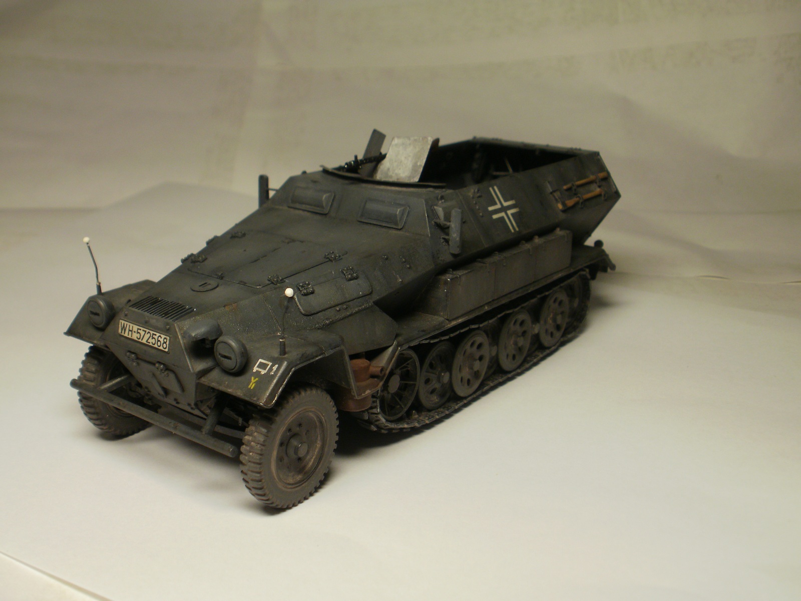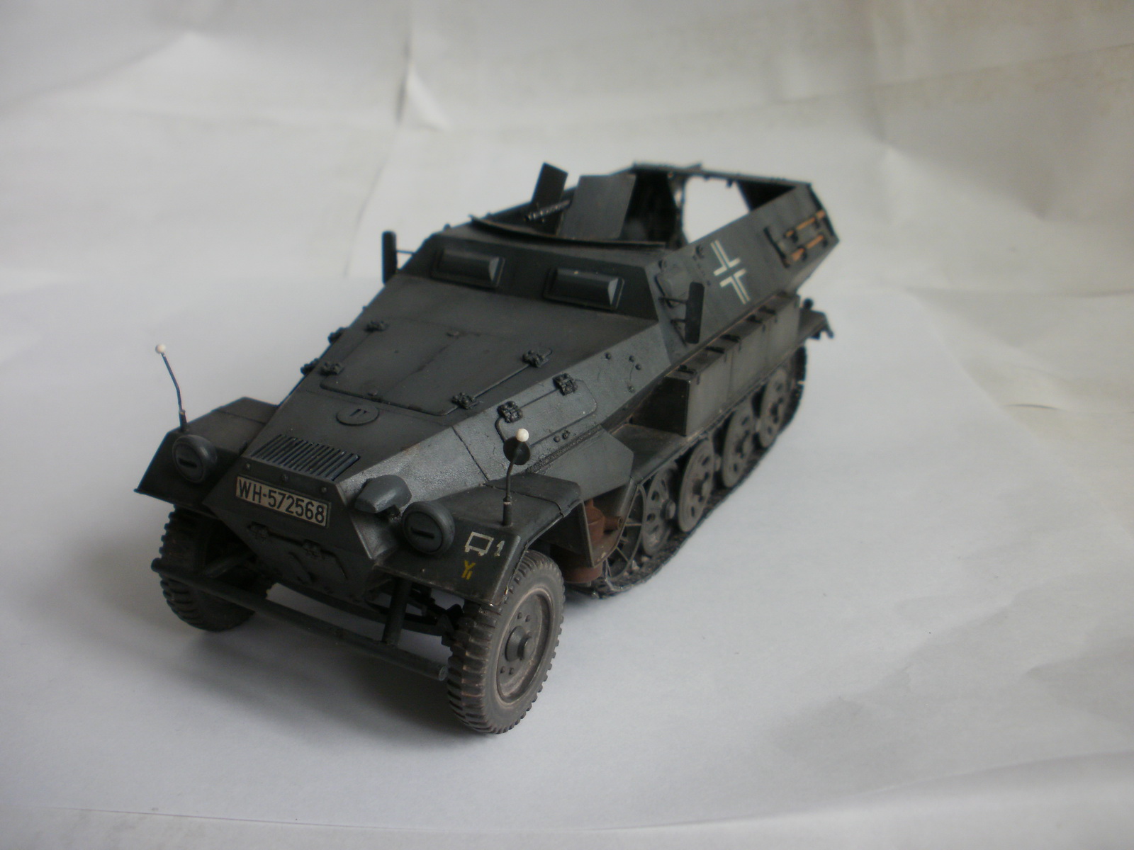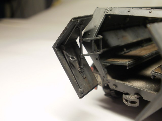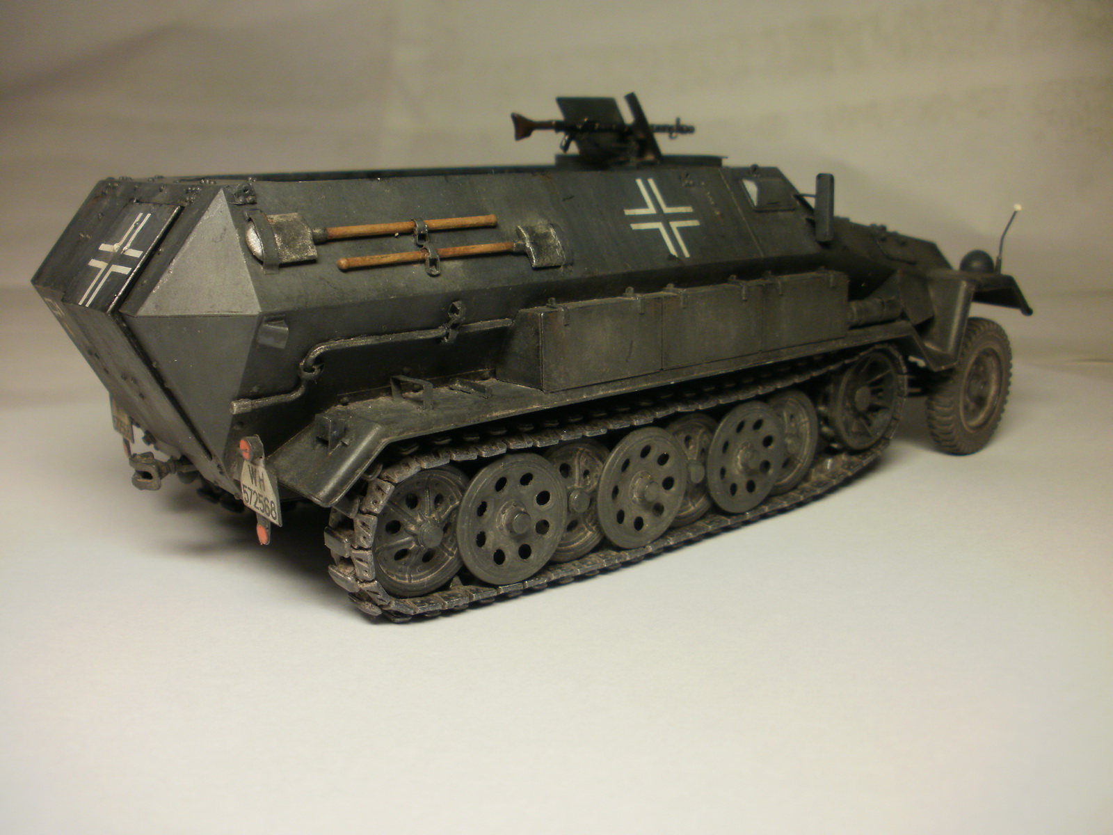 Переделке подверглось почти всё: отделение управления ,десантное отделение , нижняя передняя часть корпуса , немного ходовая часть , крылья и ящики ЗИП . Фары от Италери из запасов , MG-34 и тубус для противогаза из старого набора Звезды .