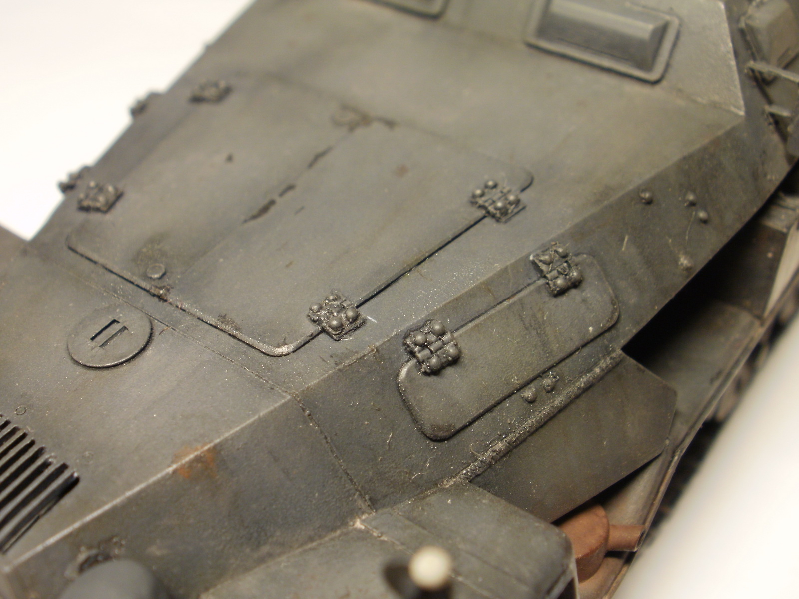 Что именно бросается в глаза - это то, что в один цвет с машиной сливаются шины колёс и бандажи на катках. И по фактуре поверхности тоже. Однозначно стоит выделять цветом. Если не хотите их красить - попробуйте просто спонжем с тамиевским чёрным пигментом из пудреницы чуть пройтись. Добавить насухо втёртого в глушитель пигмента ржавых тонов и копоти на трубу.