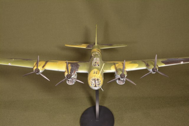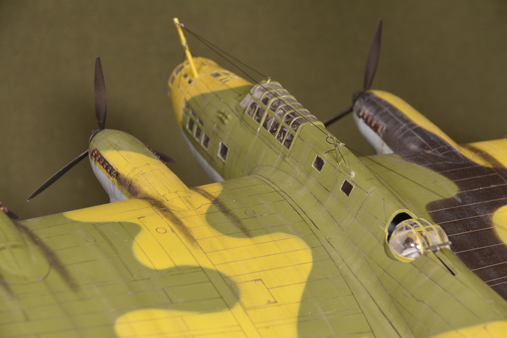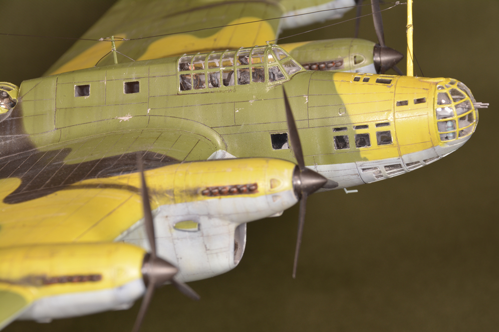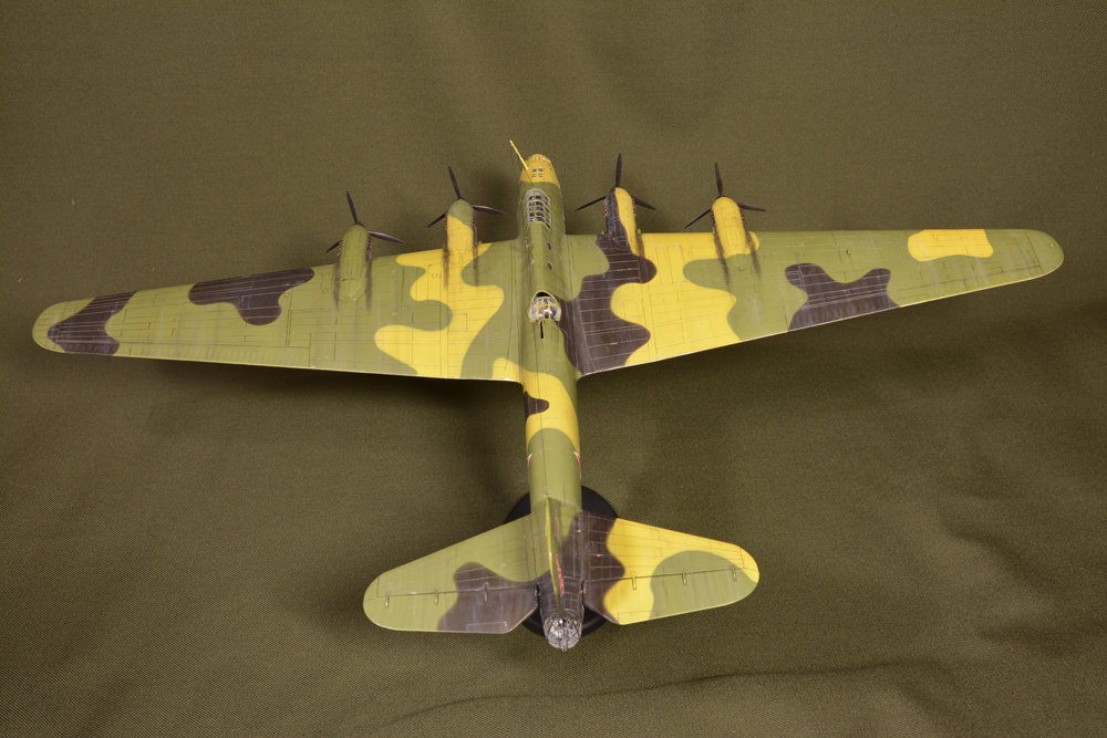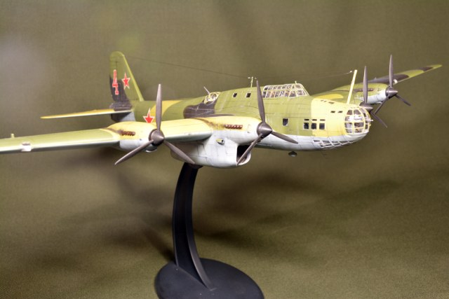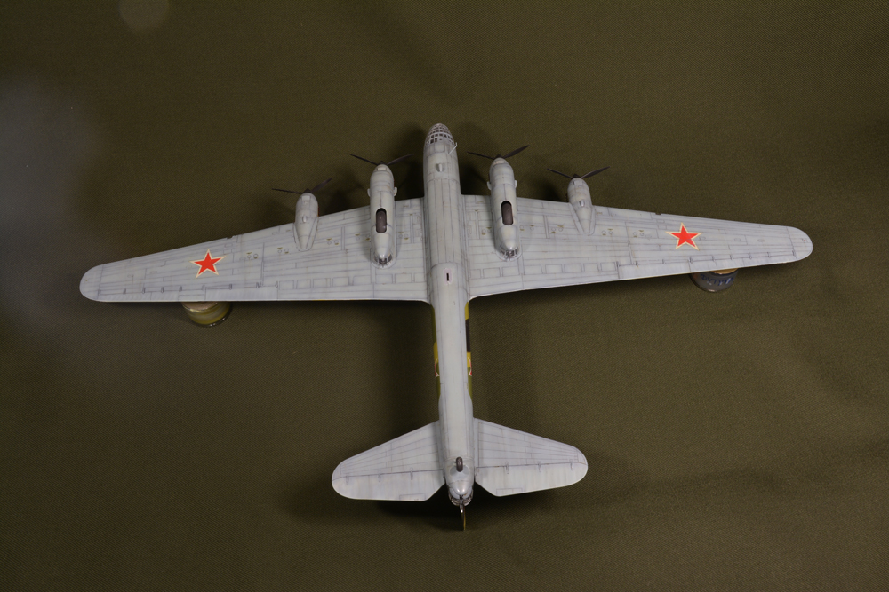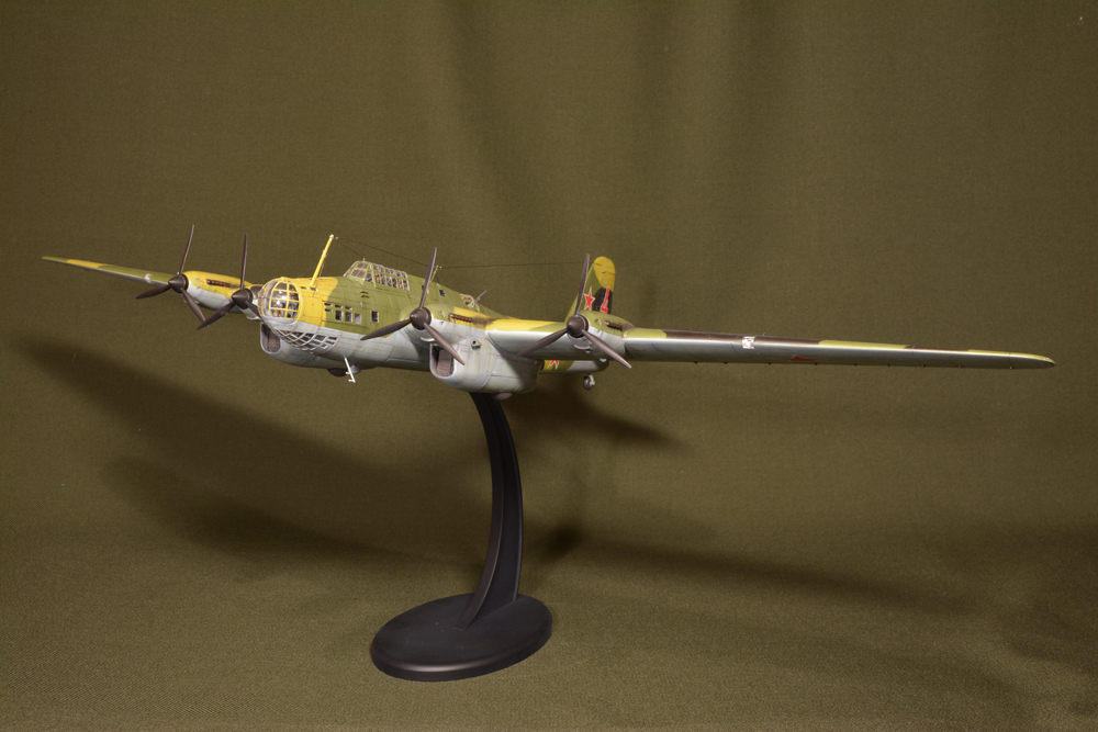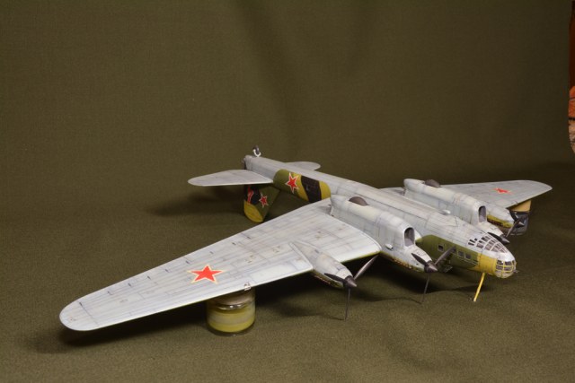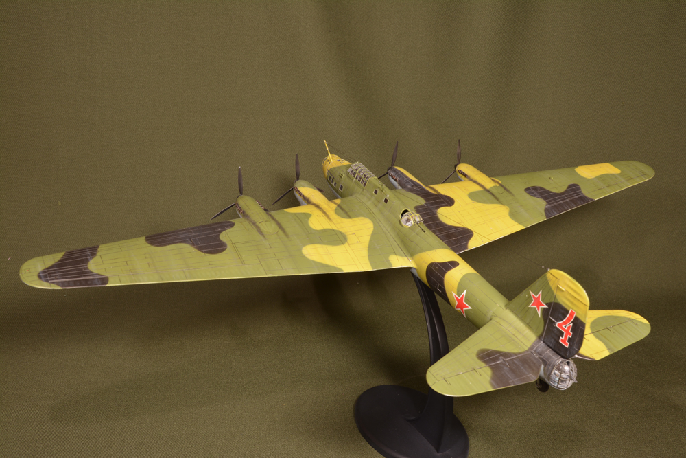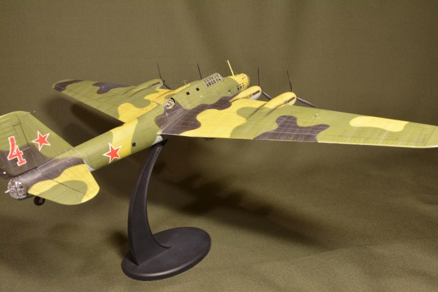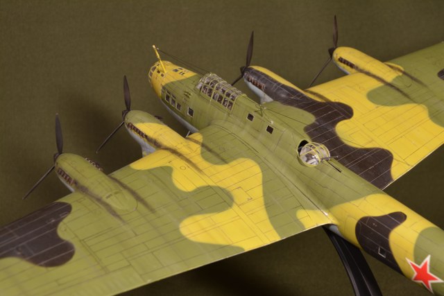 Да, вместо серо-коричневого А-21 получился просто желтый, и довольно яркий. Производитель модели со схемой окраски нам всем наврал. Зря на неё полагались. Трехцветных Пе-8 с голубым низом и красной "четверкой" на хвосте в природе не существовало. Но сама модель выполнена очень неплохо. Расшивка выделена, след от выхлопа. Всё как надо. Надо было приберечь до 9 Мая.