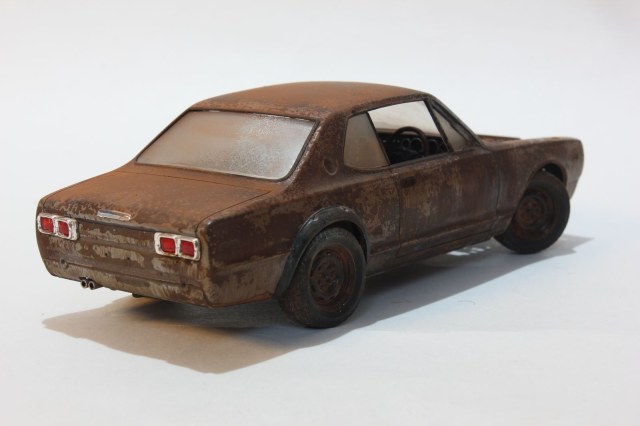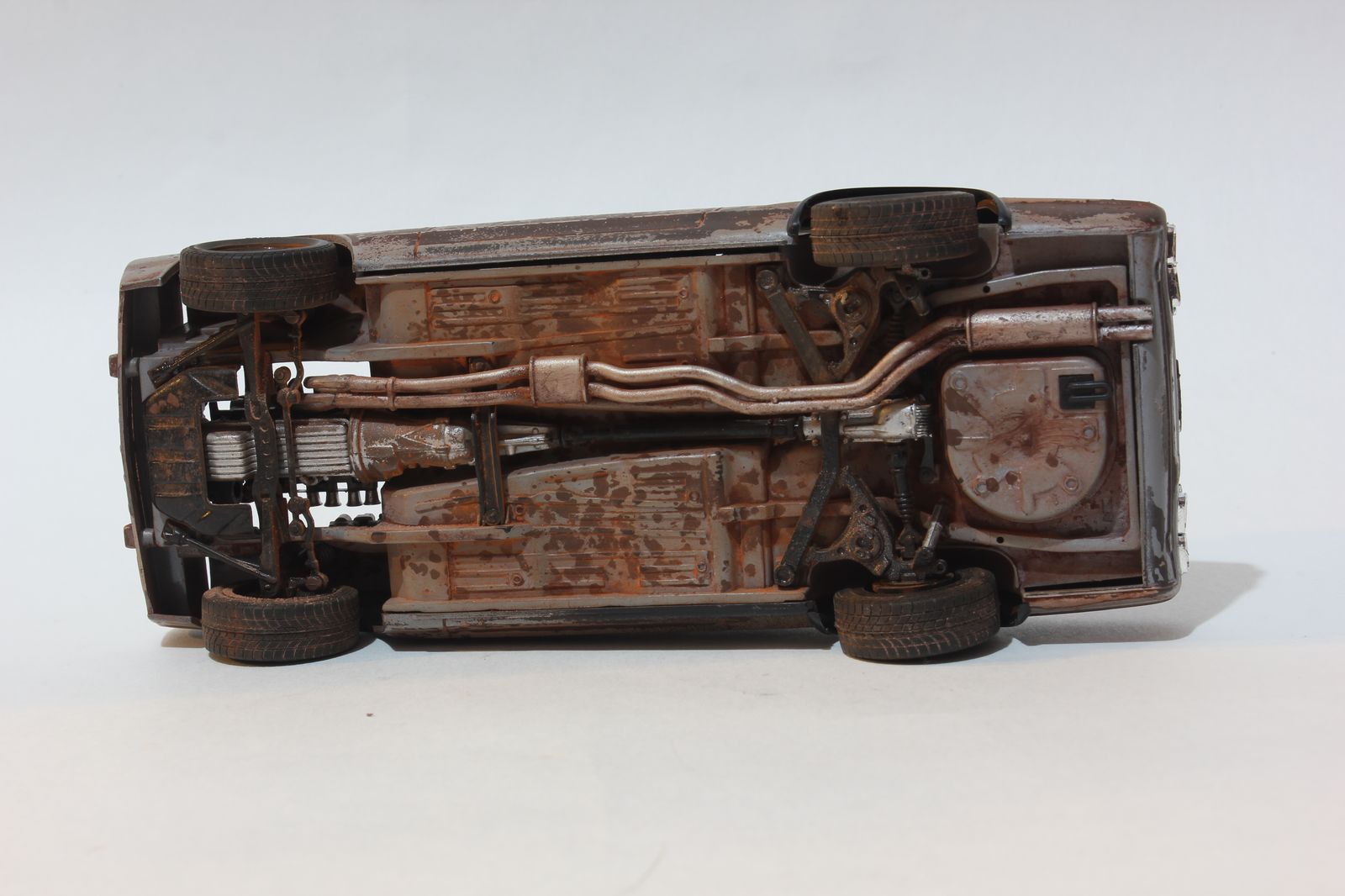 на боках ржа текла с дисков, пока авто долго где то стоял. А в протекторе не ржа, а земля. По цвету похоже просто. Порядок очень простой. 1. Коричневые цвета разных оттенков на грунт. 2. Лак для волос 3. Основной цвет (акрил)4. Трем зубной щеткой желаемые места. 5. Полумат лак (любой) 6. Втер пигменты разных цветов 6. Поддетки сухой кистью масленной краской. Все. Дно все тоже самое, только вместо лака для волос - соль крупная.