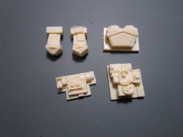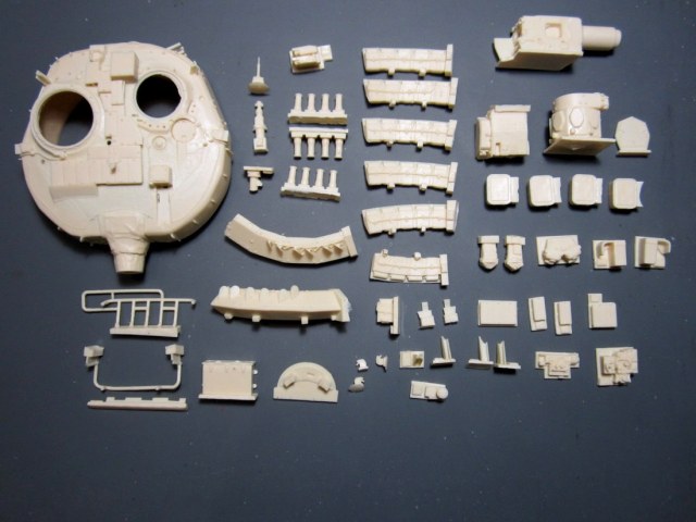 Набор состоит из 60-ти смоляных деталей. Литье очень хорошего качества, без коверн и раковин (обнаружил одну на ящике ЗИП), практически без облоя. Качество заметно отличается от ранней продукции этой фирмы (есть с чем сравнивать - уже "древний" Т-80УД).
