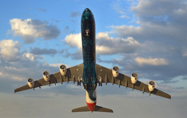 И вот, уважаемые коллеги, представляю вашему вниманию АэробусА380 вэксклюзивноймодификации « Extra Long Range Ultimate Extended Heavy Duty Super Monster Killer Babe». Предназначен для дальних трансконтинентальных перелётов с высоким пассажиропотоком. Существует в единственном экземпляре. От базовой версии его визуально отличает удлинённый в полтора раза фюзеляж, шесть двигателей (здравствуй, Мрия!), увеличенный размах крыльев, передняя стойка шасси перемещена немного назад, все основные - на шестиколёсных тележках.