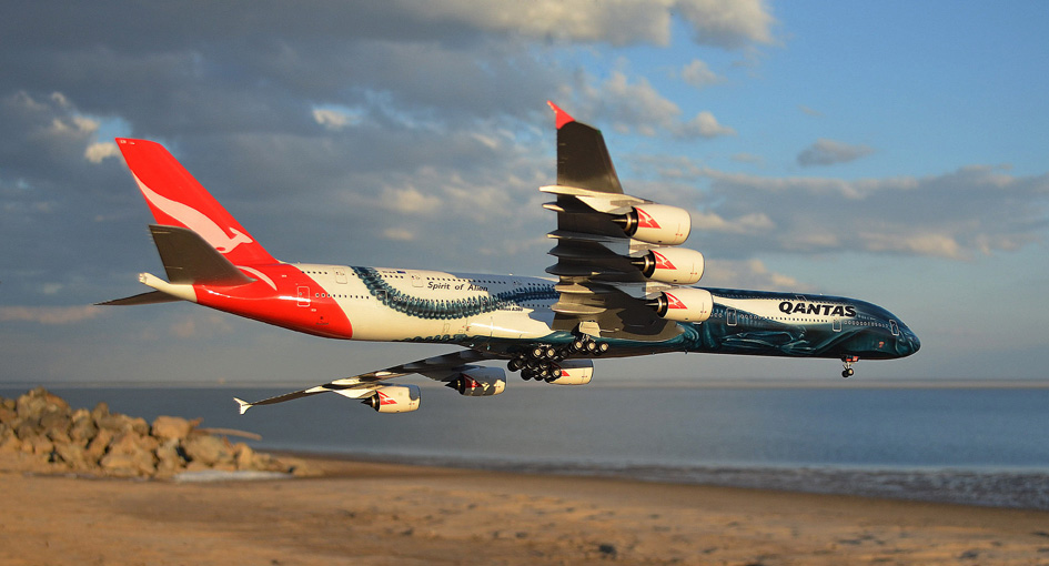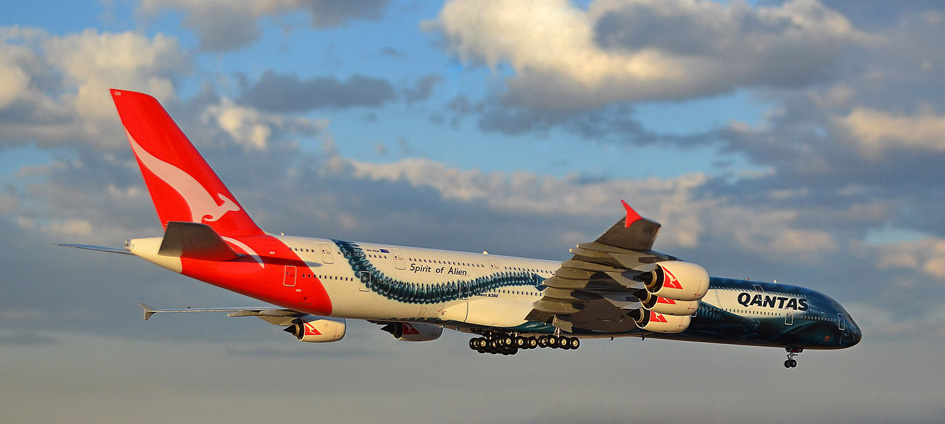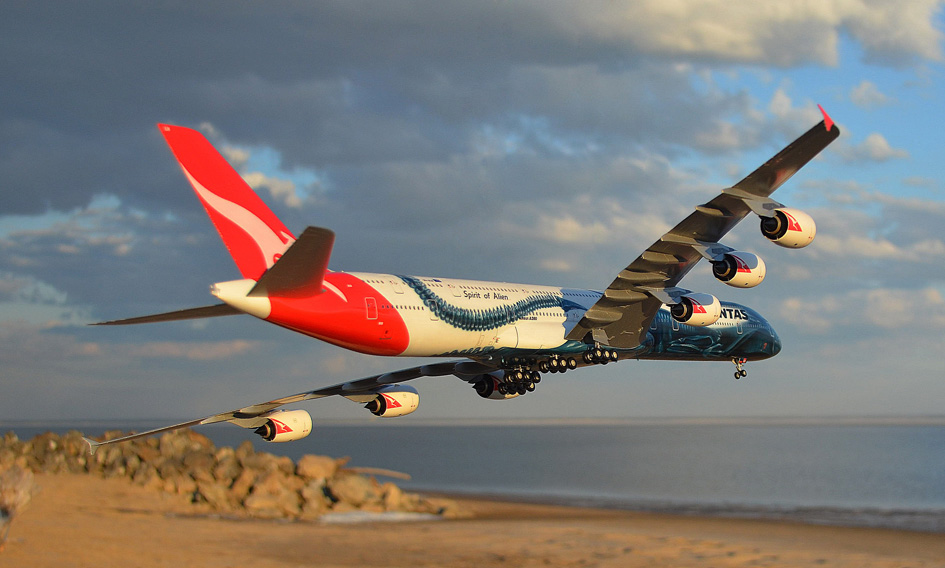 Уж если строить А380, то, разумеется, в цветах Квантас, а как же иначе! Сложилось так, что у меня этот самолёт прочно ассоциируется с Квантасом, поэтому выбор ливреи был определён ещё на стадии первых мыслей. Но идея с Чужим зацепила, и я не захотел от неё отказываться. Почему бы и нет? Австралийцы, - известные затейники и оригиналы по части специальных раскрасок, вспомните хотя бы их легендарную «Вуналу Дримин» или спортивные схемы. Я решил выжать этот трэш до последней капли и придумал специальную ливрею Квантас «Спирит оф Элиен». Пусть она будет звонкой оплеухой авиакомпании Ол Ниппон Эруэйз в ответ на их бездарные и не имеющие права на существование «Звёздные войны»!
