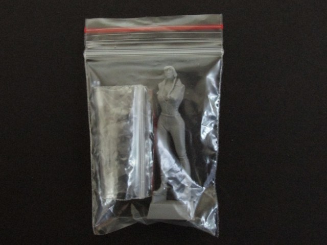 И так, небольшая коробочка 85х55х25 мм. с боковой загрузкой. На лицевой стороне весьма интересный бокс арт, на котором избражина девушка в сапогах строевиках, в танкиском комбезе с поясным ремнём времён ВОВ и в шлемофоне, но послевоенном, на фоне советского флага. На обратной стороне ещё один, на основе одной фотографии времён ВОВ, весьма не плохо стилизован. Внутри пакетик со смоляной фигуркой девушки с радующими глаз формами и симпотной мордашкой, хоть на фото это плохо видно, но это так. А ещё внутри второй пакетик по меньше. В нем лежат отдельно левая рука, правая рука с зажатым пистолетом похожем на ПМ, также неплохо детализирован, несмотря на скромные размеры, танкошлем, кобура под ПМ и медная проволка длиною около 22 мм. диаметром приблизительно 0,06 мм. (микрометра к сожалению у меня нет) для имитации провода от штекера к танкошлему.