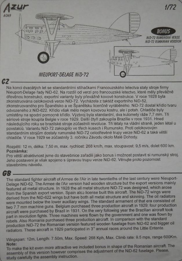 Модель от Azur в масштабе 1/72 (номер по каталогу 6972) упакована в картонную коробку с боковым открытием. Четыре литника с пластиковыми деталями отлиты по технологии «шорт-ран». Присутствует незначительный облой. Румынская версия самолёта отличалась конструкцией фюзеляжа и рядом мелочей, что учитывается в наборе. Имеются смоляные детали и плата с фототравлением. Козырёк кабины и приборные шкалы даются на плёнке. Декаль присутствует на три варианта самолёта. Инструкция достаточно информативна и наглядна.