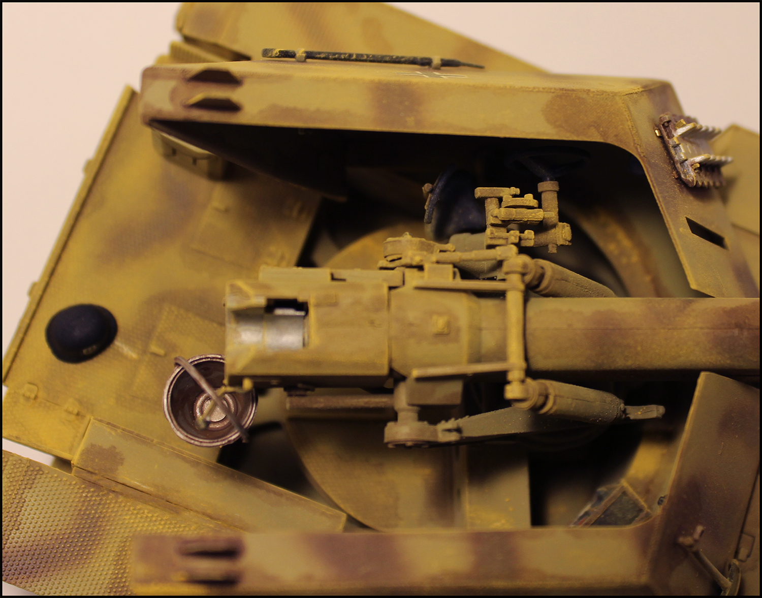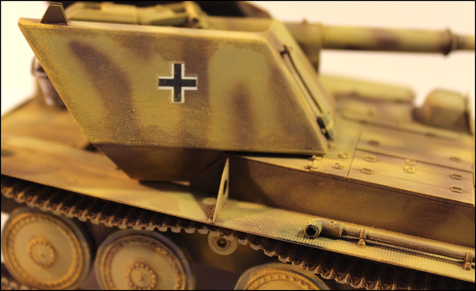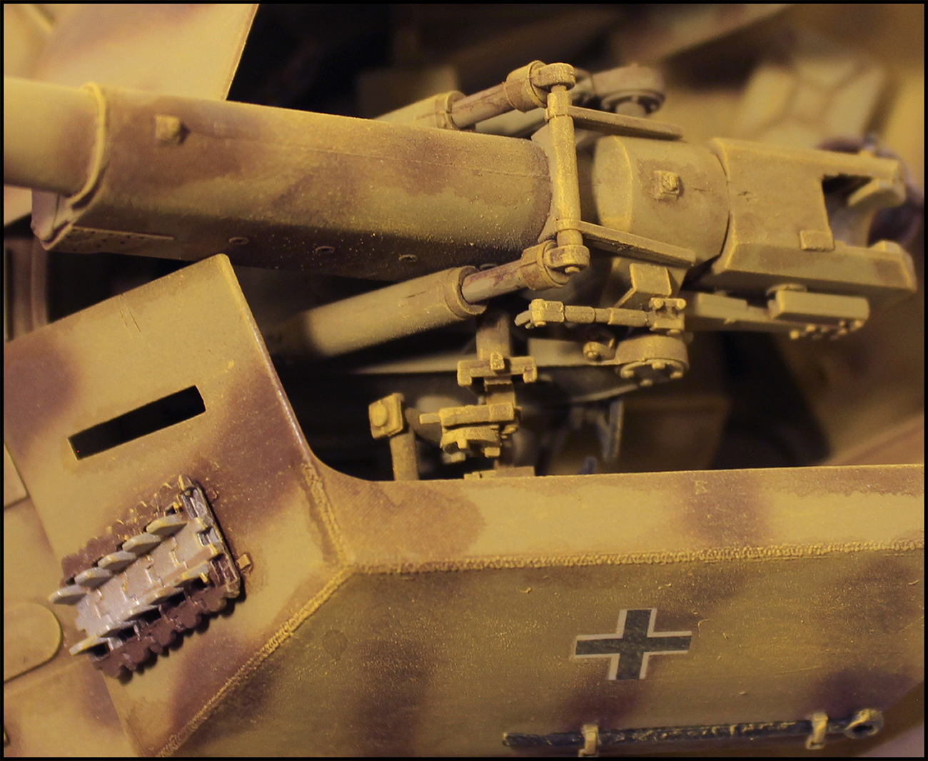 Все кажется желтым.Снимали под лампами накаливания.И замем вы так близко показали нам шов орудия. Такие вещи лучше здесь не показывать,за это по головке не погладят)))