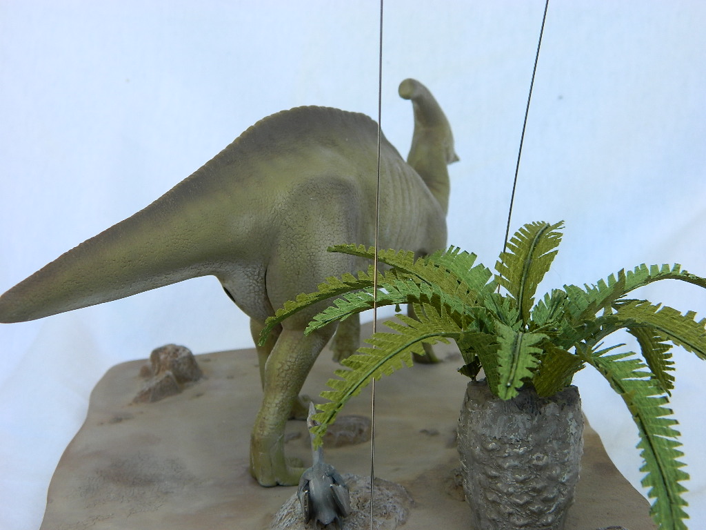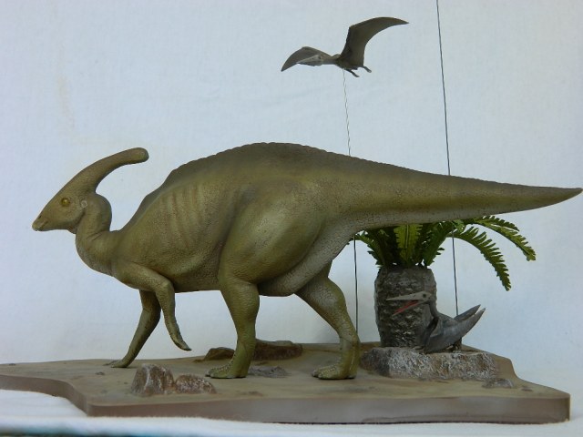 Насмотревшись с сыном мультфильма "Поезд Динозавров" появилось желание сделать одного из этих интересных животных. Паразауролоф-безобидный травоядный ящер,обитал в конце мелового периода,к нему вполне применимы слова из песни Высоцкого: "И пощипывал он травку И нагуливал бока,Не услышишь от него худого слова.Толку было с него,правда,как с козла молока,Но вреда,однако,тоже никакого..."))) Время текло миллион лет за миллионом и ничто не предвещало беды,но всё закончил прилетевший внезапно(тогда ещё не было NASA и предупредить ящеров о его приближении было некому) астероид,завершивший эру динозавров навсегда. По другой известной версии вымерли динозавры около 5000 лет назад в результате Всемирного Потопа.Не помогли даже пары каждого вида,спасённые Ноем в Ковчеге(возможно,детёнышами,для экономии места)-их потомкам уже не нашлось места на грешной земле.