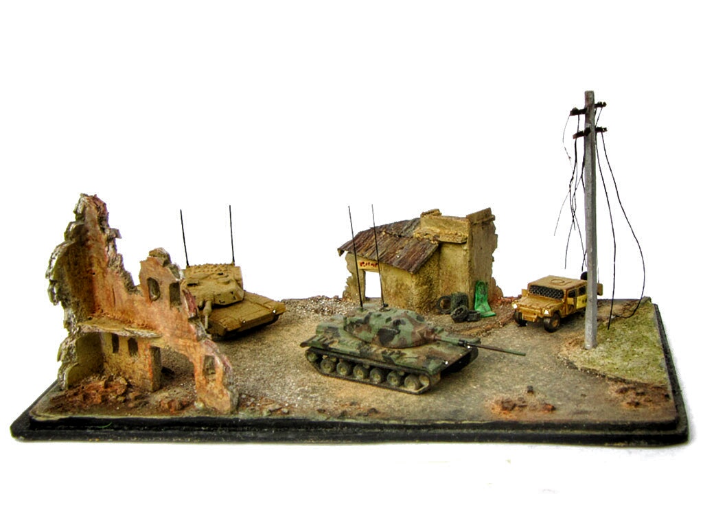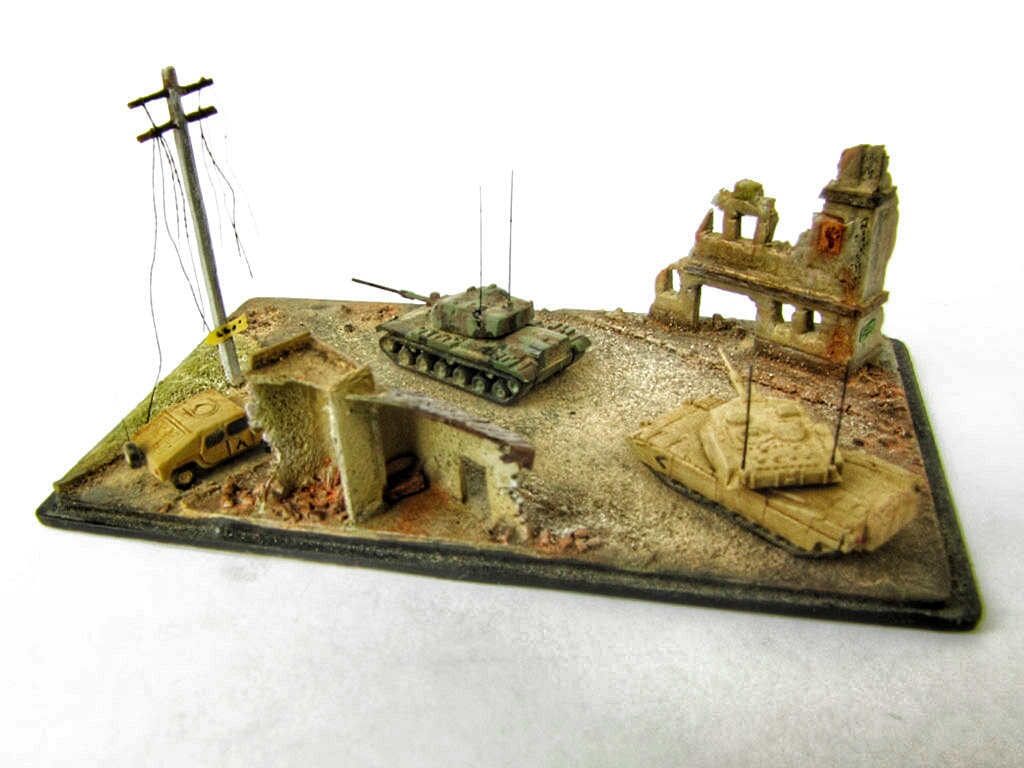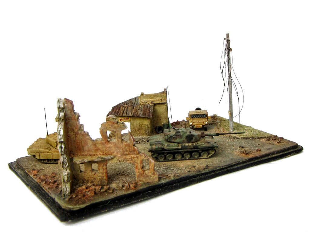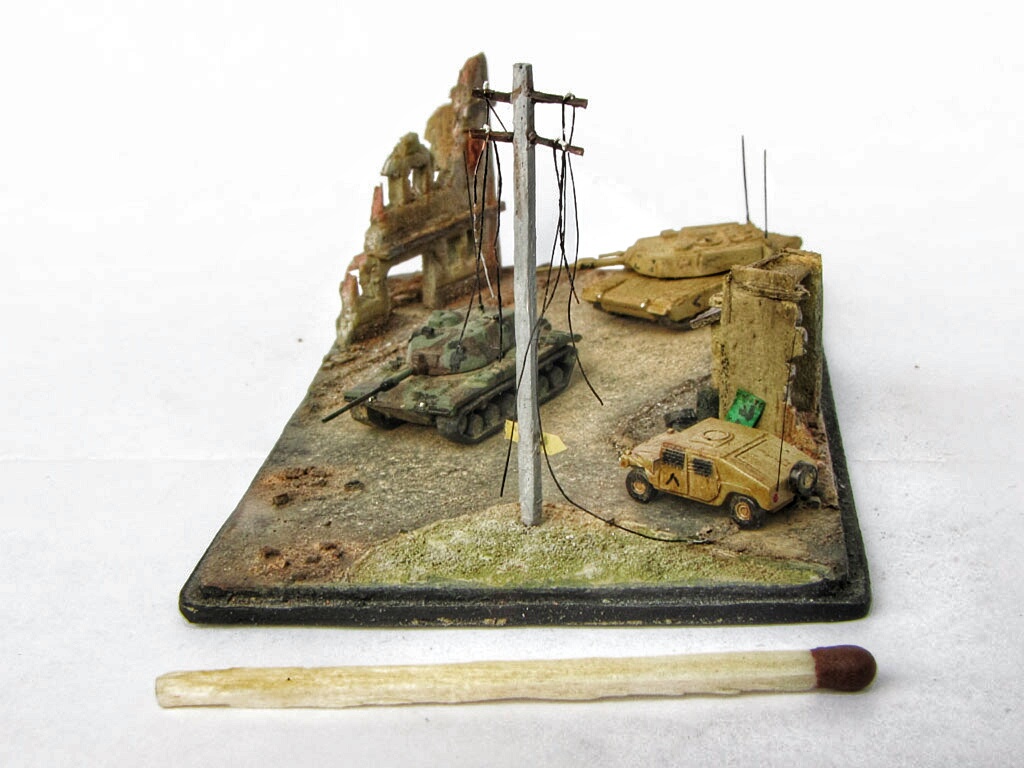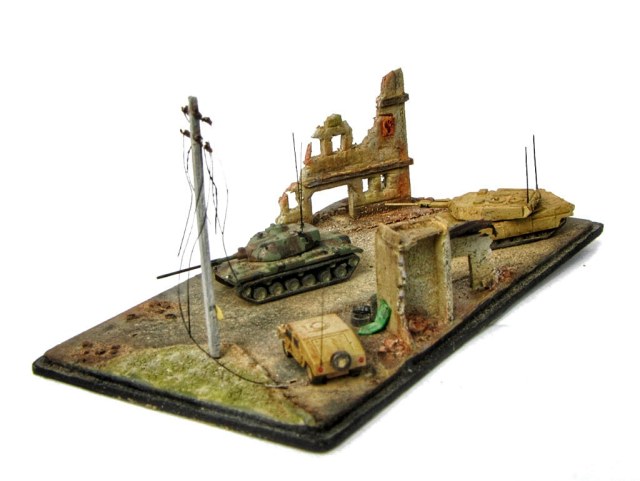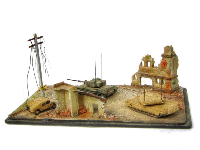 Все строения, битый кирпич и диван, спрятавшийся в руинах дома рядом с хамви, выполнены из пищевого полистирола от упаковок различных продуктов.